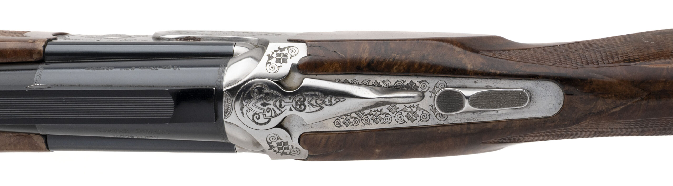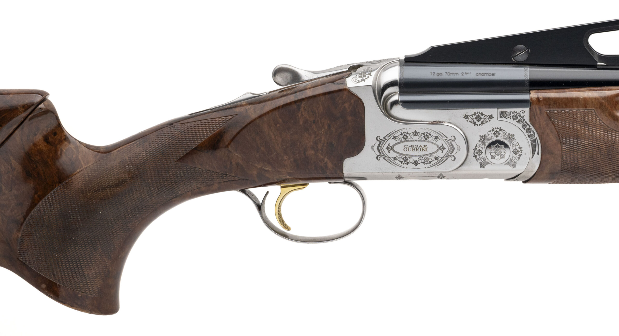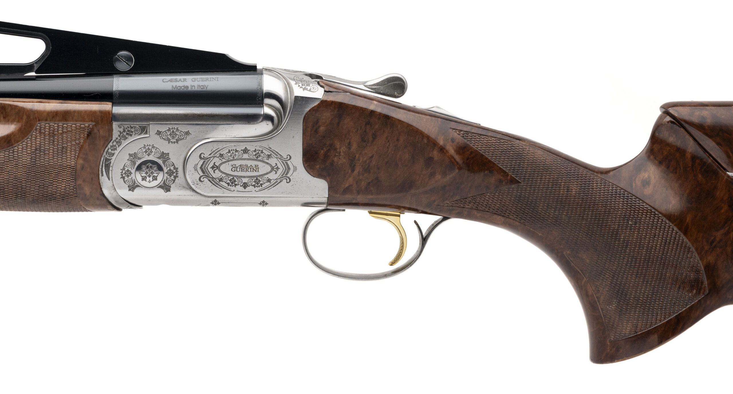 SN: 122117. Over/under sporting shotgun made by Caesar Guerini. 34" DTL single barrel chambered for 2¾" 12Ga shells. Good overall condition with some handling marks in the oil-rubbed wood furniture, and some small splits around the tang. Engraved stainless receiver and blued barrel are excellent. Adjustable comb and length of pull, with RAD recoil absorber. Comes with additional 32" double-vent-rib 2¾" 12Ga barrel set.