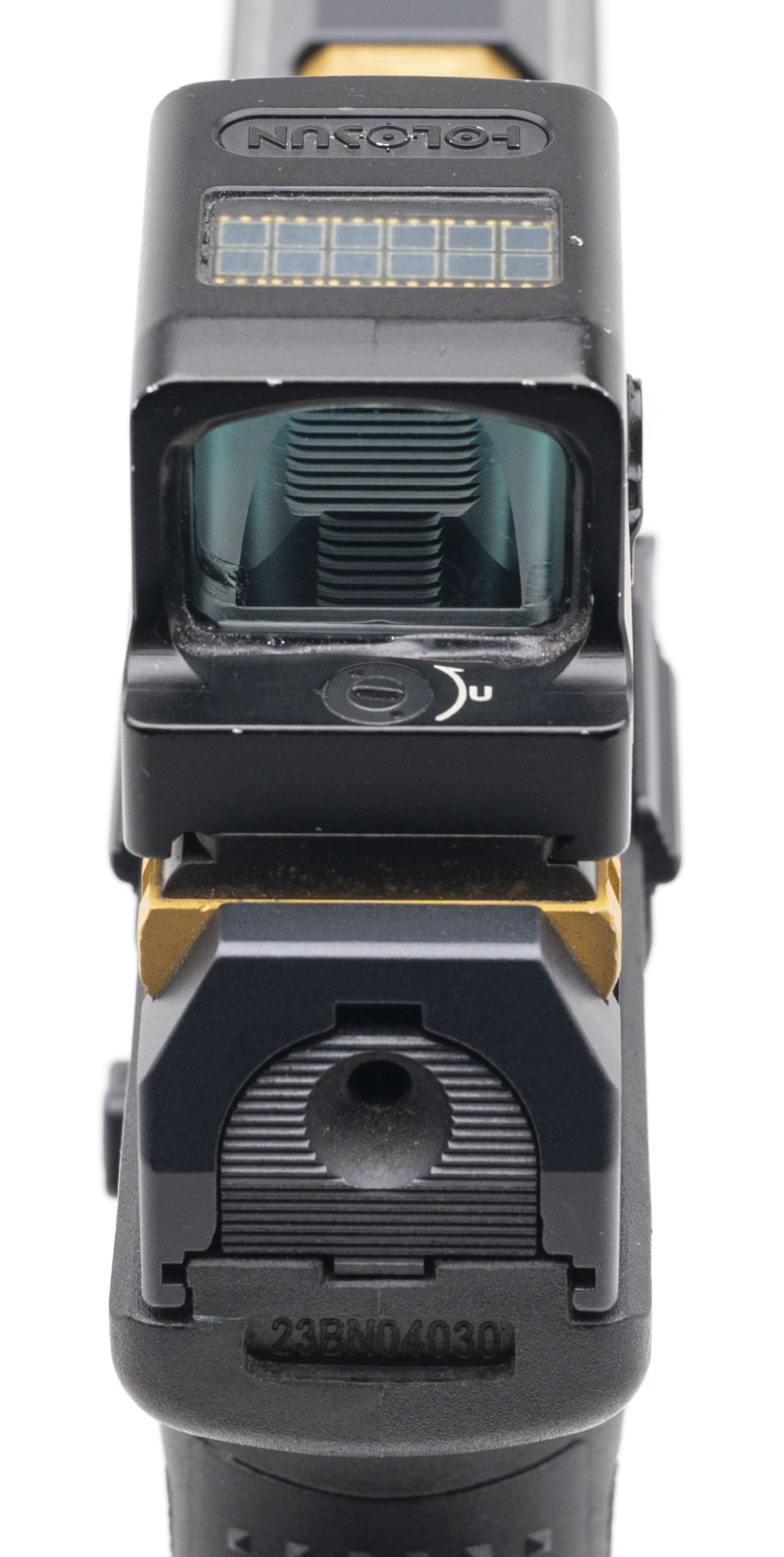 SN: 23BN04030. Modern production, 9mm with a 4.73" gold PVD fluted threaded barrel. Bore is excellent. Compact striker-fired pistol with a Holosun 509 ACSS Vulcan optic, fiber-optic front sight, ambidextrous slide release, accessory rail, matte black finish, and black polymer frame. Finish shows minor handling marks. Includes additional magazine, and original case. Overall condition is near excellent.