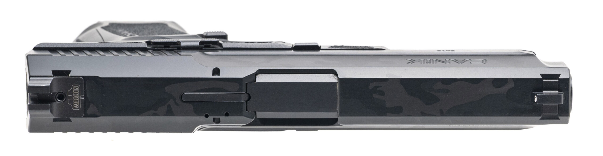 SN: 23AT14207. Modern production, 9mm with a 4.19" barrel. Bore is excellent. Full size polymer frame striker-fired pistol with an accessory rail, and midnight woodland camouflage finish. Finish shows light edge wear. Overall condition is near excellent. Includes an additional magazine, original holster, and original case.