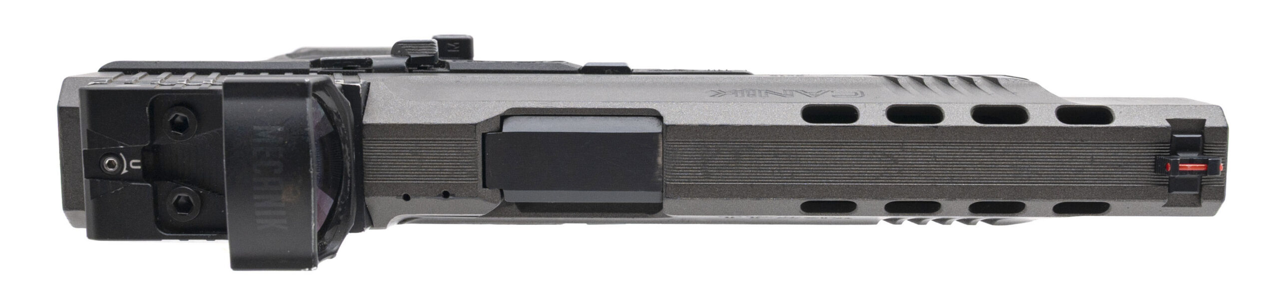 SN: 24BC02431. Modern production, 9mm with a 5.2" barrel. Bore is excellent. Full size striker-fired polymer frame pistol with a MeCanik M02 red dot optic, fiber-optic front sight, lightening cut slide, accessory rail, and tungsten gray cerakote finish. Finish shows moderate handling marks. Overall condition is very good. Includes an additional magazine, original holster, and original case.