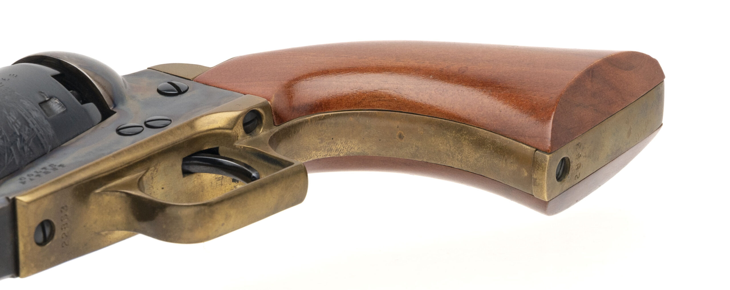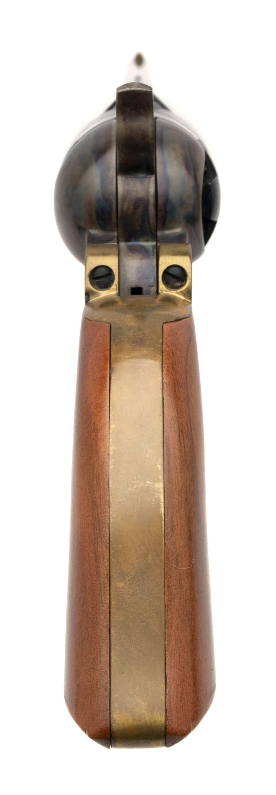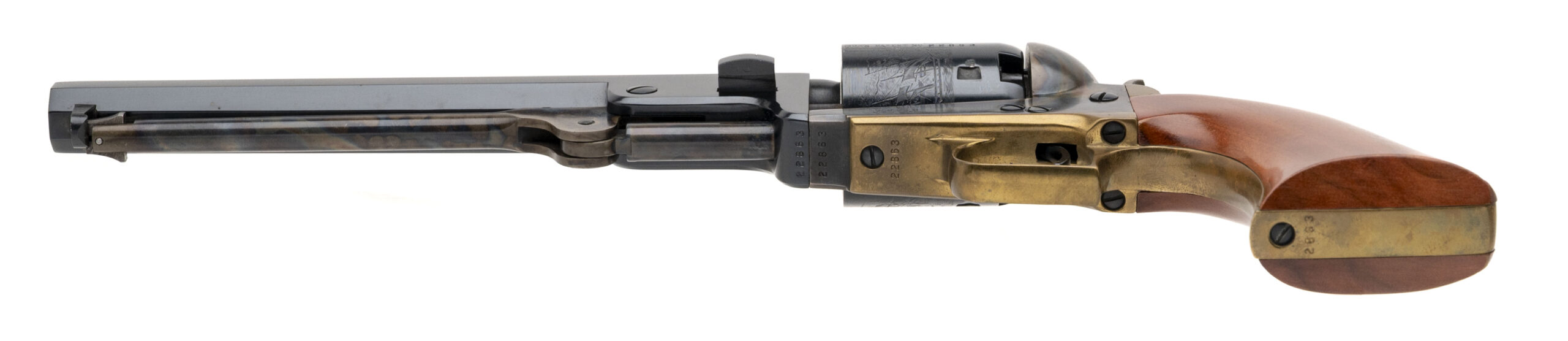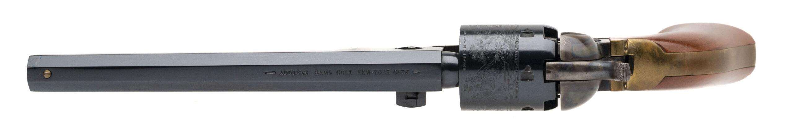 SN: 22863 made circa 1970’s. 36 caliber 6 shot percussion Colt revolver with a 7.5” octagon barrel, etched cylinder, walnut grips and brass trigger guard and back strap. High polish blued finish with case hardened frame, loading rod and hammer. Overall in very good condition. Comes with factory case and accessories.