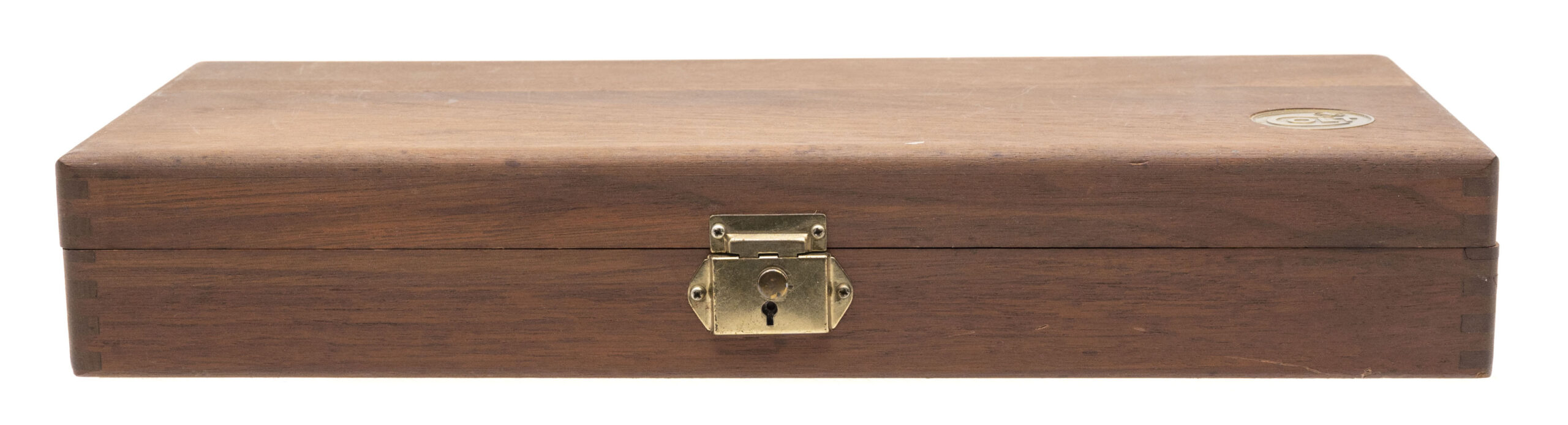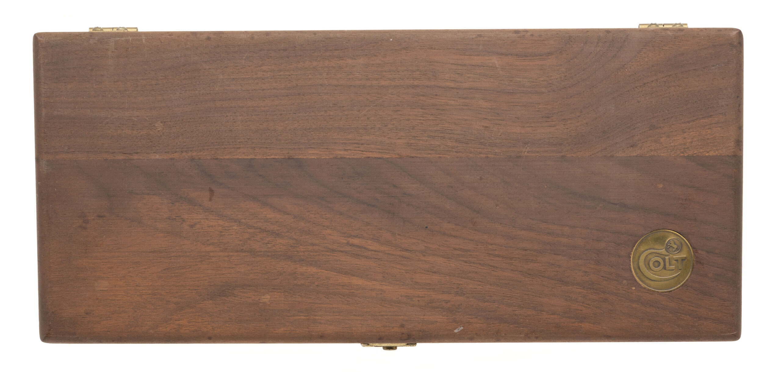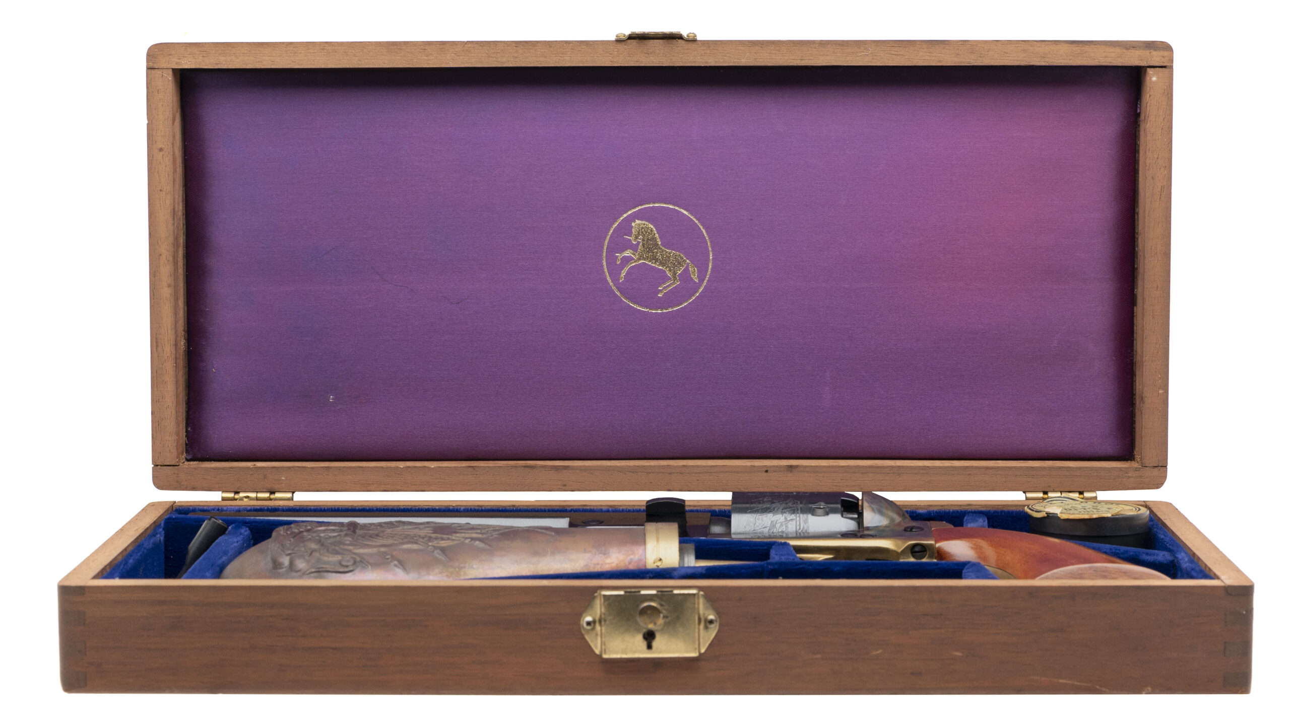 SN: 22863 made circa 1970’s. 36 caliber 6 shot percussion Colt revolver with a 7.5” octagon barrel, etched cylinder, walnut grips and brass trigger guard and back strap. High polish blued finish with case hardened frame, loading rod and hammer. Overall in very good condition. Comes with factory case and accessories.