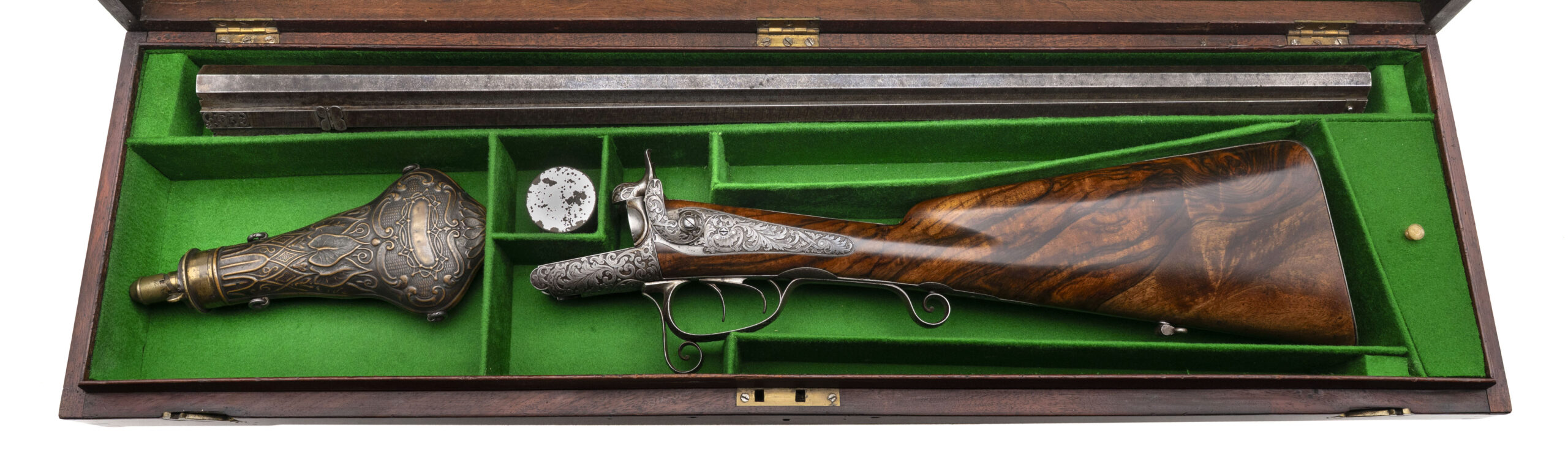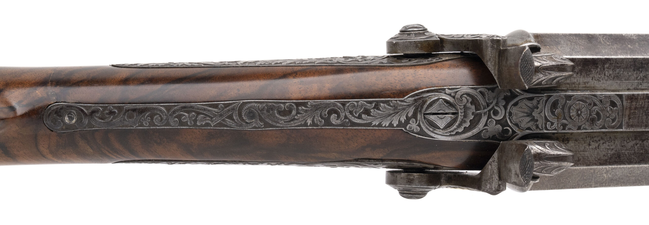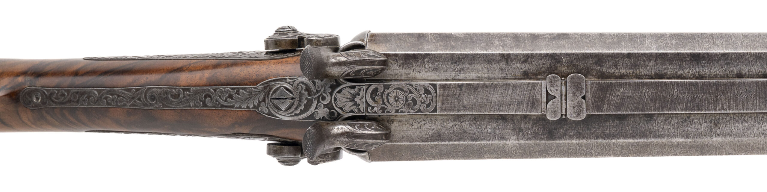 Made circa 1845. 68 Pinfire Caliber with 27.5” barrels The barrels are octagon and have a Damascus pattern. The barrels have a dark gray patina. Interestingly the barrels have a provision for a bayonet. The action is chiseled and expertly done. Both the barrels and the locks marked “Beringer a Paris” The stock is burled Circassian walnut. The trigger guard has the initials in gold “D.C.” This This gun comes in an original case . The wrist has been repaired. The interior is relined. Very fine early cartridge double rifle.