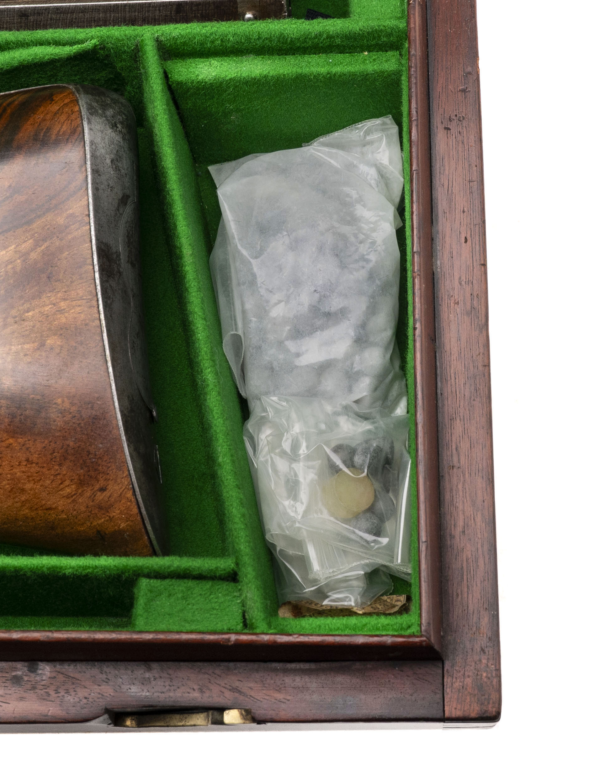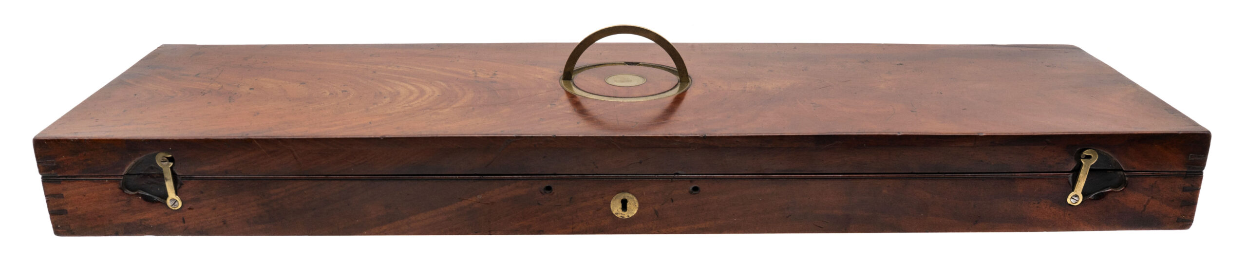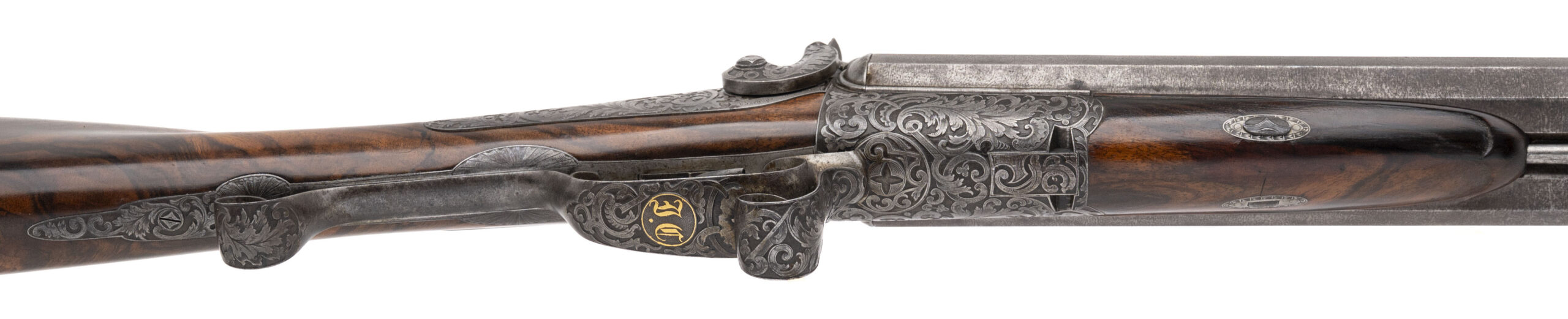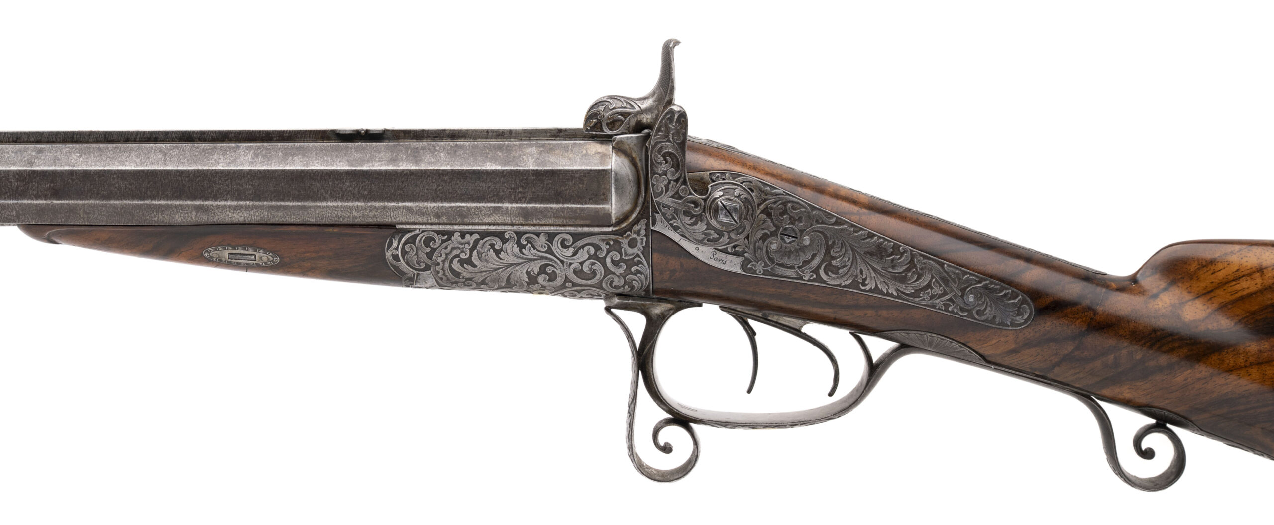 Made circa 1845. 68 Pinfire Caliber with 27.5” barrels The barrels are octagon and have a Damascus pattern. The barrels have a dark gray patina. Interestingly the barrels have a provision for a bayonet. The action is chiseled and expertly done. Both the barrels and the locks marked “Beringer a Paris” The stock is burled Circassian walnut. The trigger guard has the initials in gold “D.C.” This This gun comes in an original case . The wrist has been repaired. The interior is relined. Very fine early cartridge double rifle.