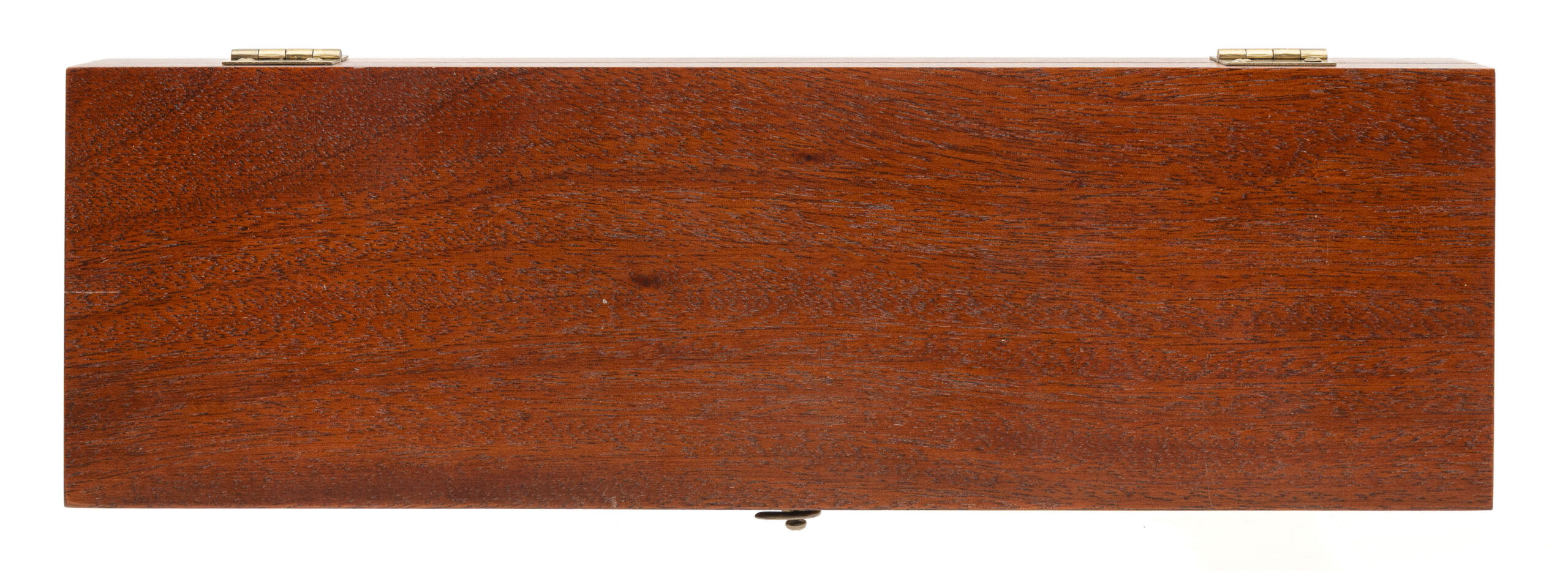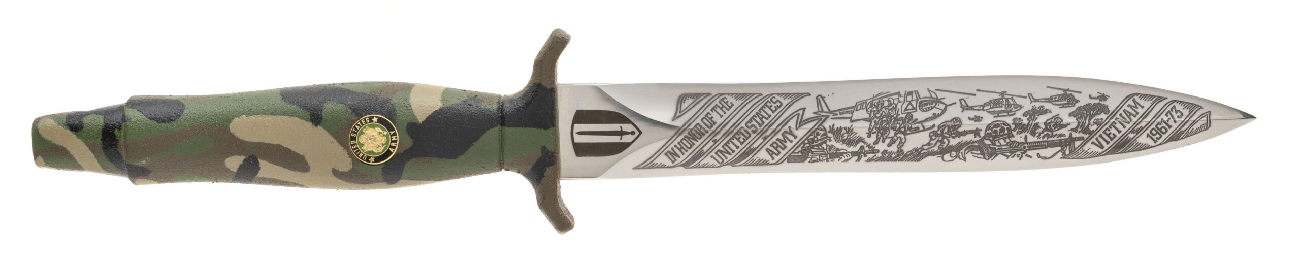 SN: 222 of only 2500 made. Limited edition Gerber Mark II Commando Survival knife with a mirror polish 6.75" blade engraved with Vietnam battle scene and banner reading " IN HONOR OF THE UNITED STATES ARMY" "VIETNAM 1961-73". Camo painted handle with Army insignia inlaid. Comes in original wood presentation case and original box. Overall in excellent condition.