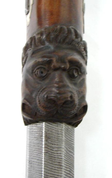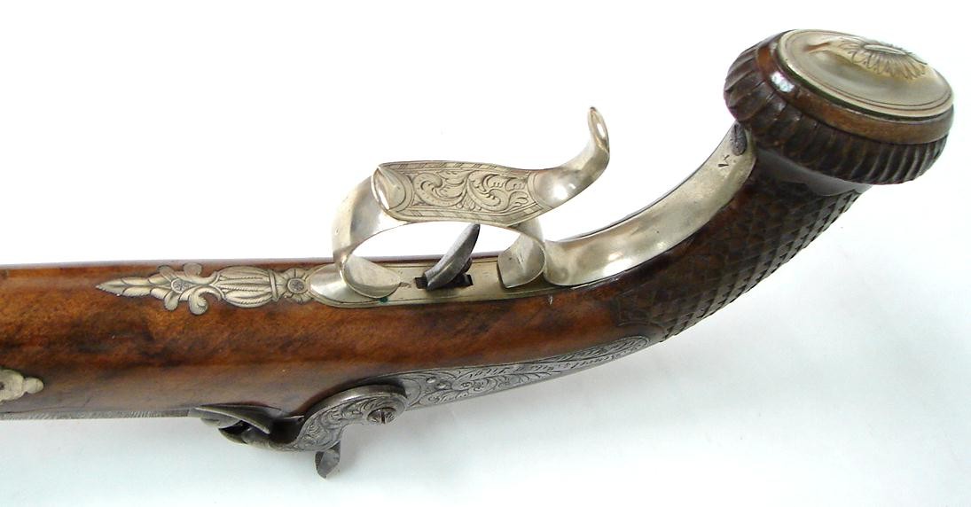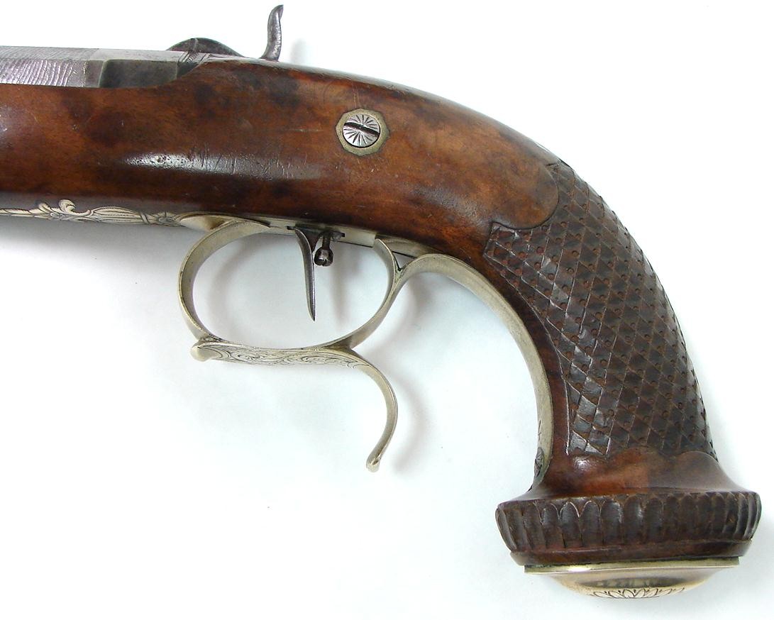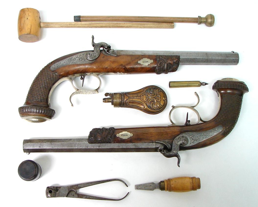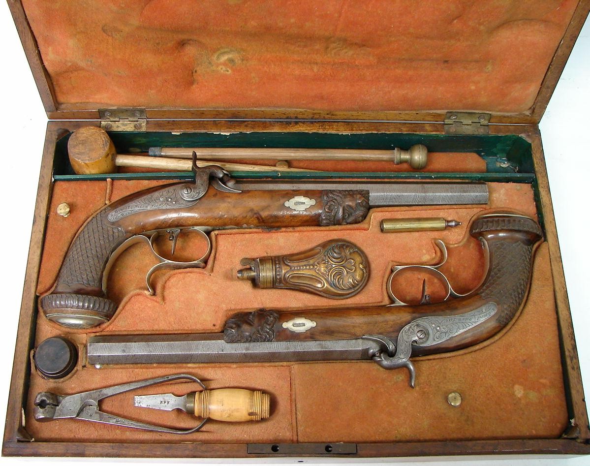 Cased Pair of Belgian Duellers by G. Beuret ET Fils. Liege. Stocks are fancy carved with Lions Heads forends and carved checkered pistol grips. Barrels have etched Damascus pattern and multi groove rifling. Barrels are 9" long and 15" overall. Cased with accessories. Condition is very good.