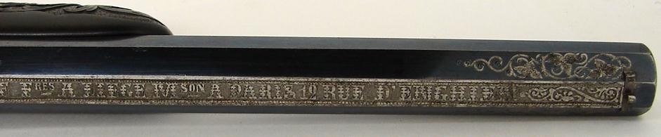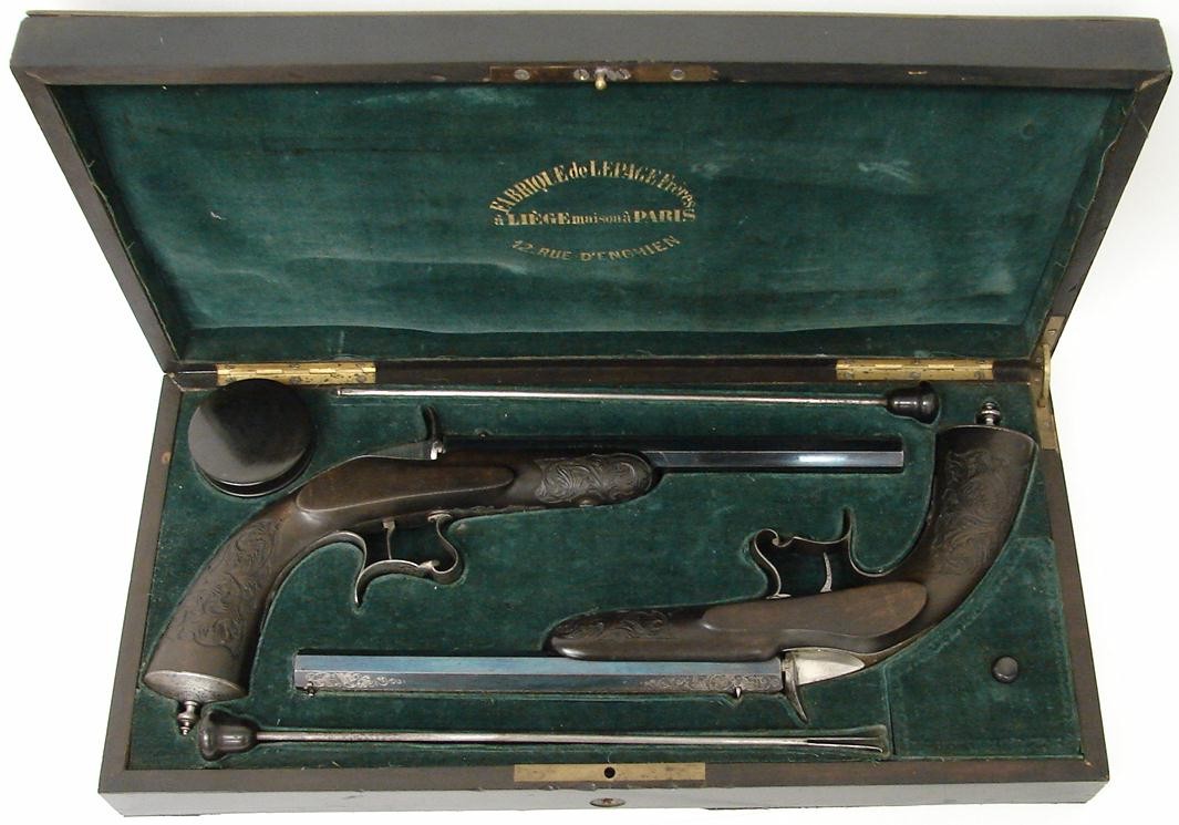 Cased Pair Of Flobert Single Shot Target pistols by Le Page of Paris. Carved stocks with floral motifs. Guns are excellent with engraved barrels and furniture.