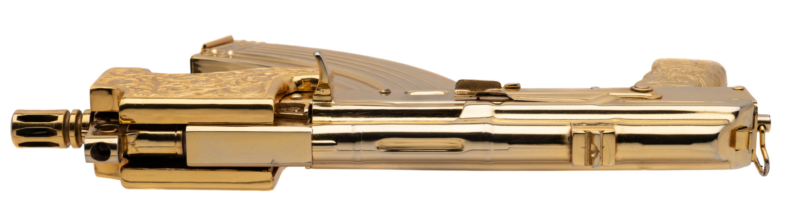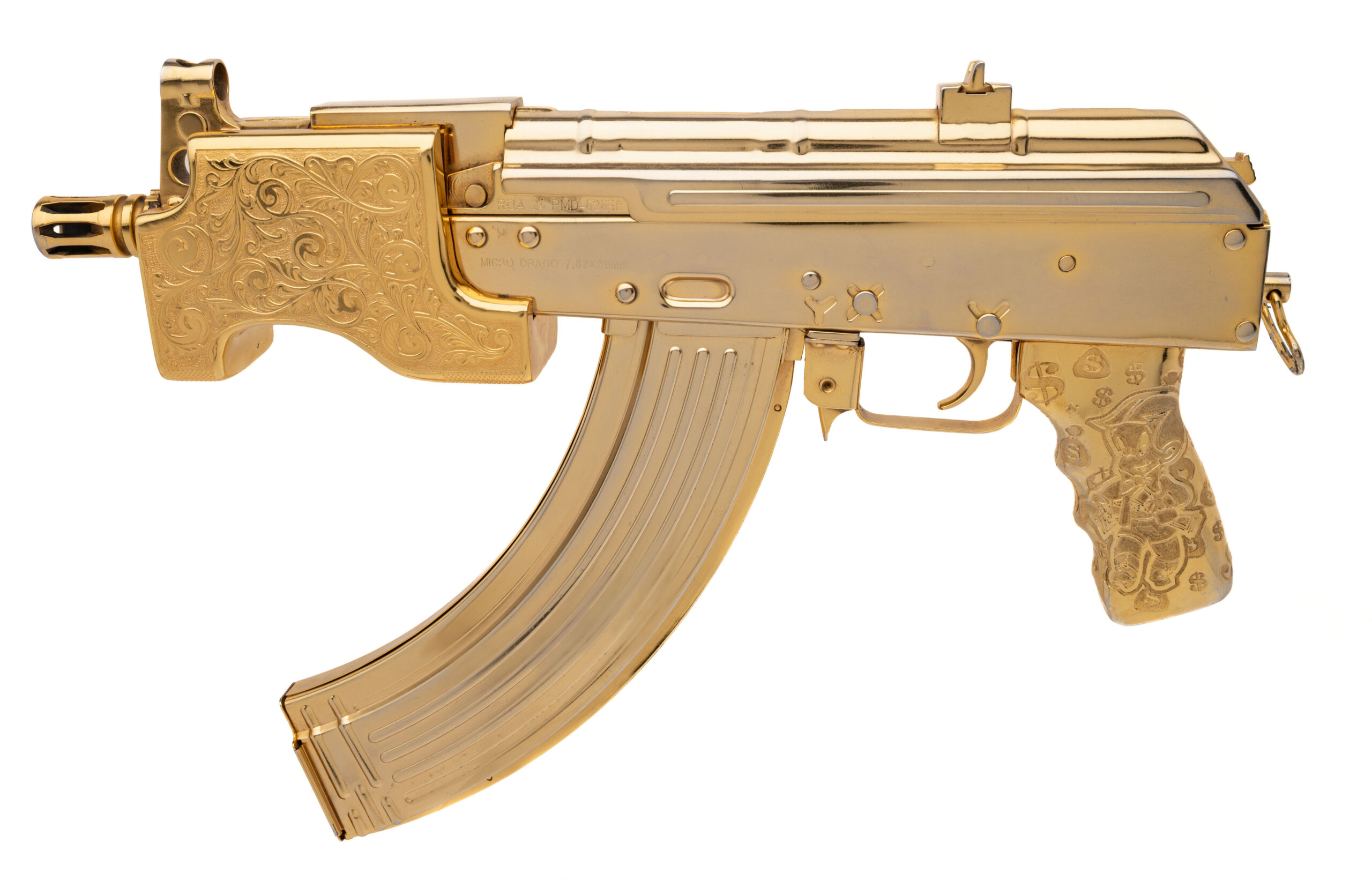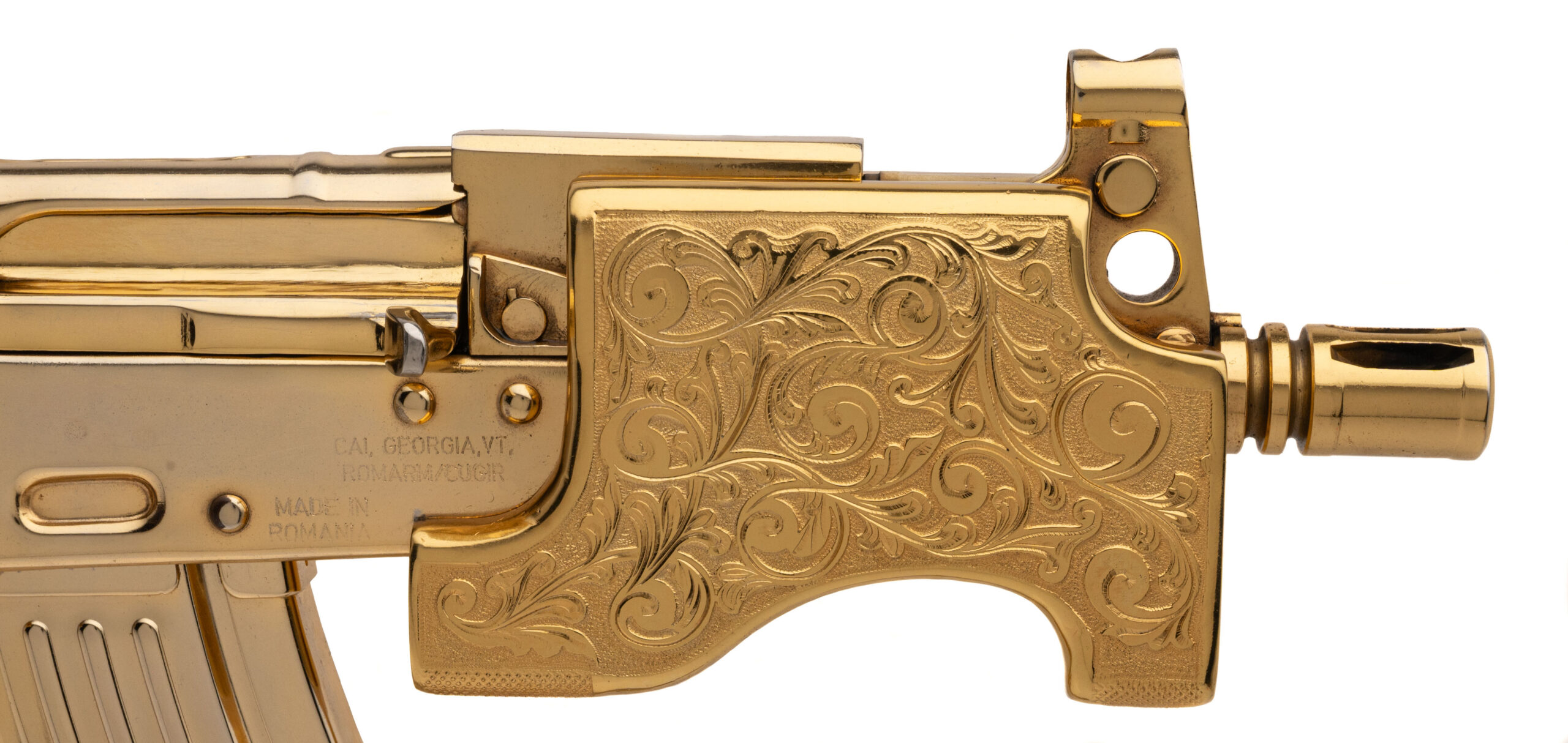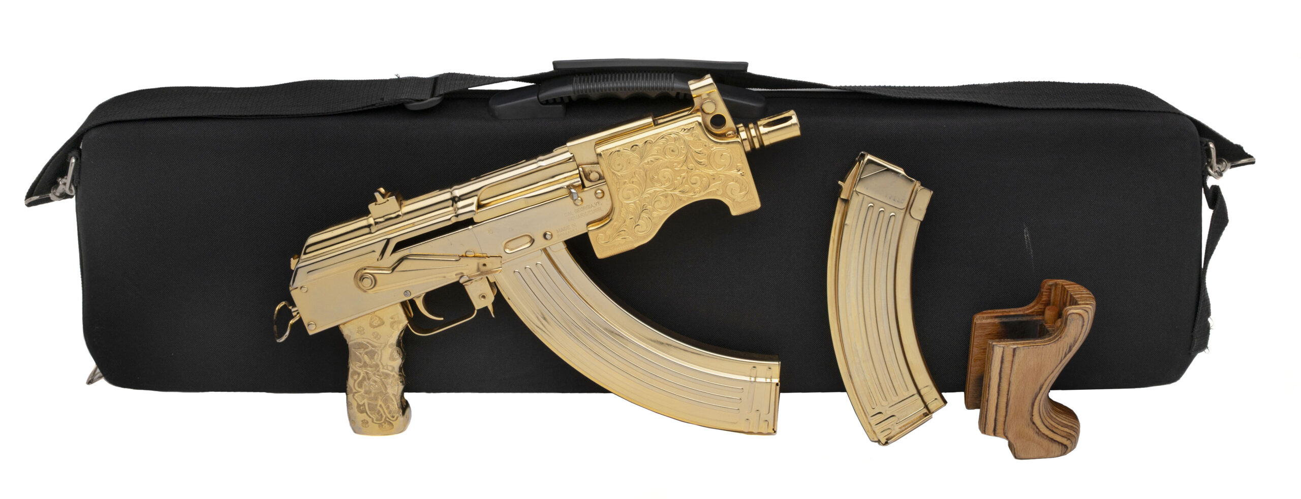 SN: 24PMD-62658. Modern production, 7.62x39mm with a 6.25" barrel. Bore is bright with strong rifling. Gold plated Romanian made AK pistol with engraved aluminum handguard & pistol grip. Very good condition overall. Comes with a carry bag, 2 gold plated magazines, and wood handguard.