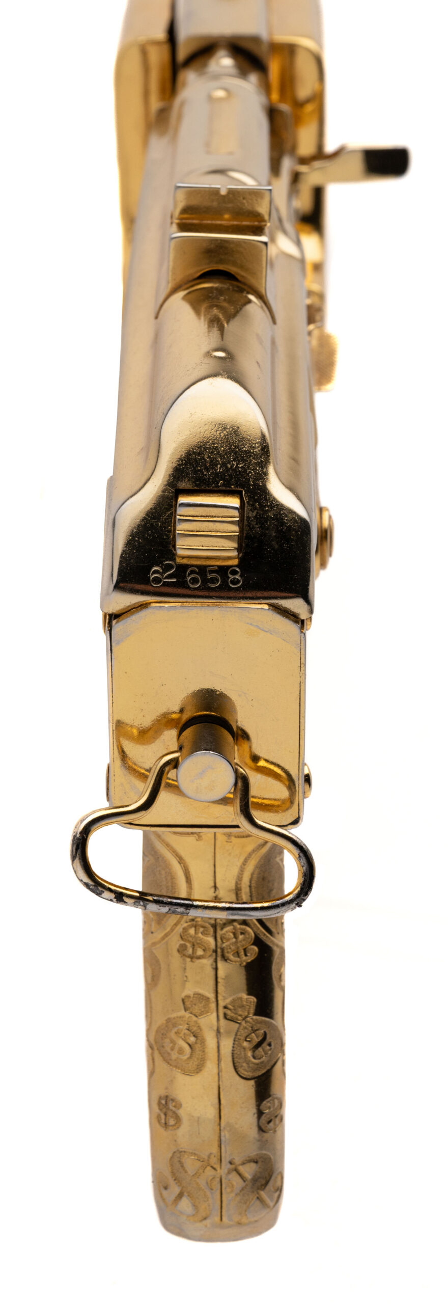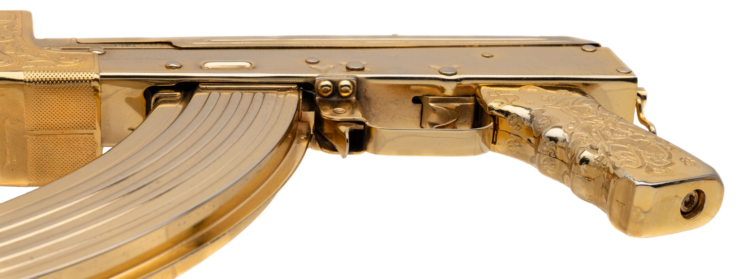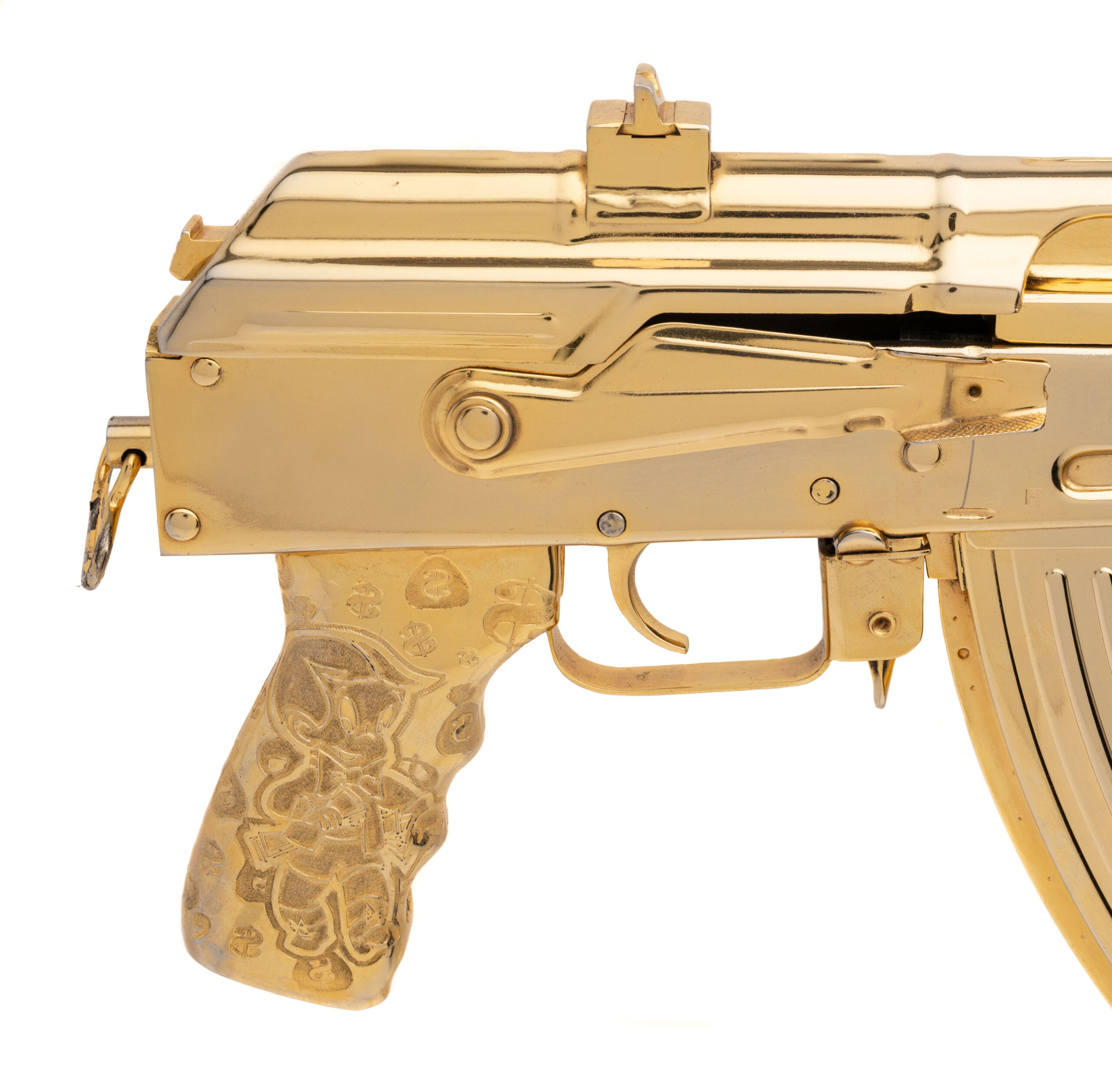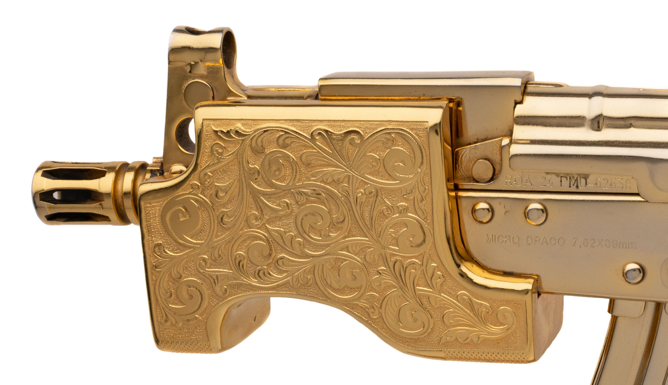 SN: 24PMD-62658. Modern production, 7.62x39mm with a 6.25" barrel. Bore is bright with strong rifling. Gold plated Romanian made AK pistol with engraved aluminum handguard & pistol grip. Very good condition overall. Comes with a carry bag, 2 gold plated magazines, and wood handguard.