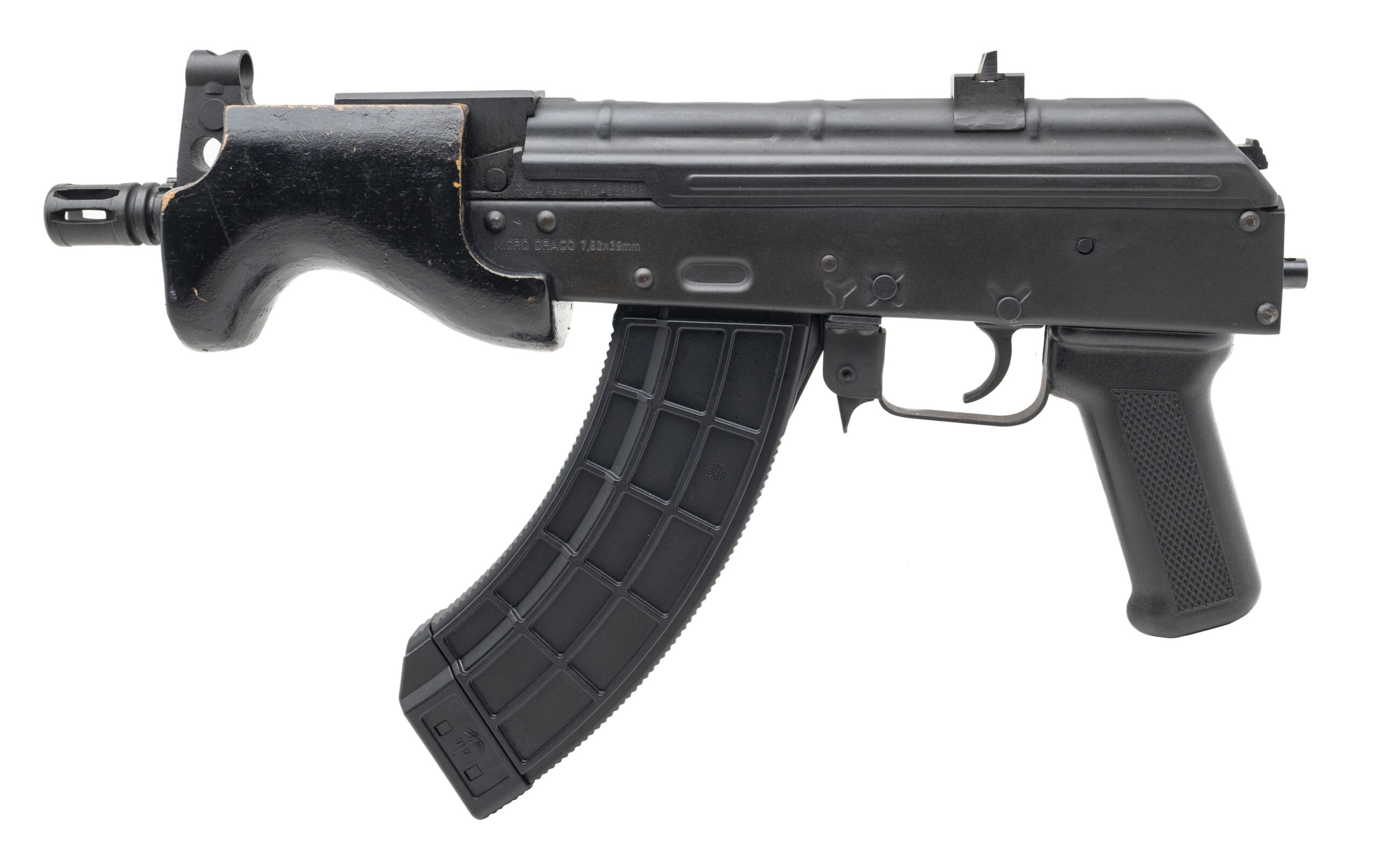 SN: ROA24PMD-59896. Modern production, 7.62x39mm with a 6.25" barrel. Bore is bright with strong rifling. Romanian made AK pistol. Wood handguard has been painted black. Overall condition is very good.
