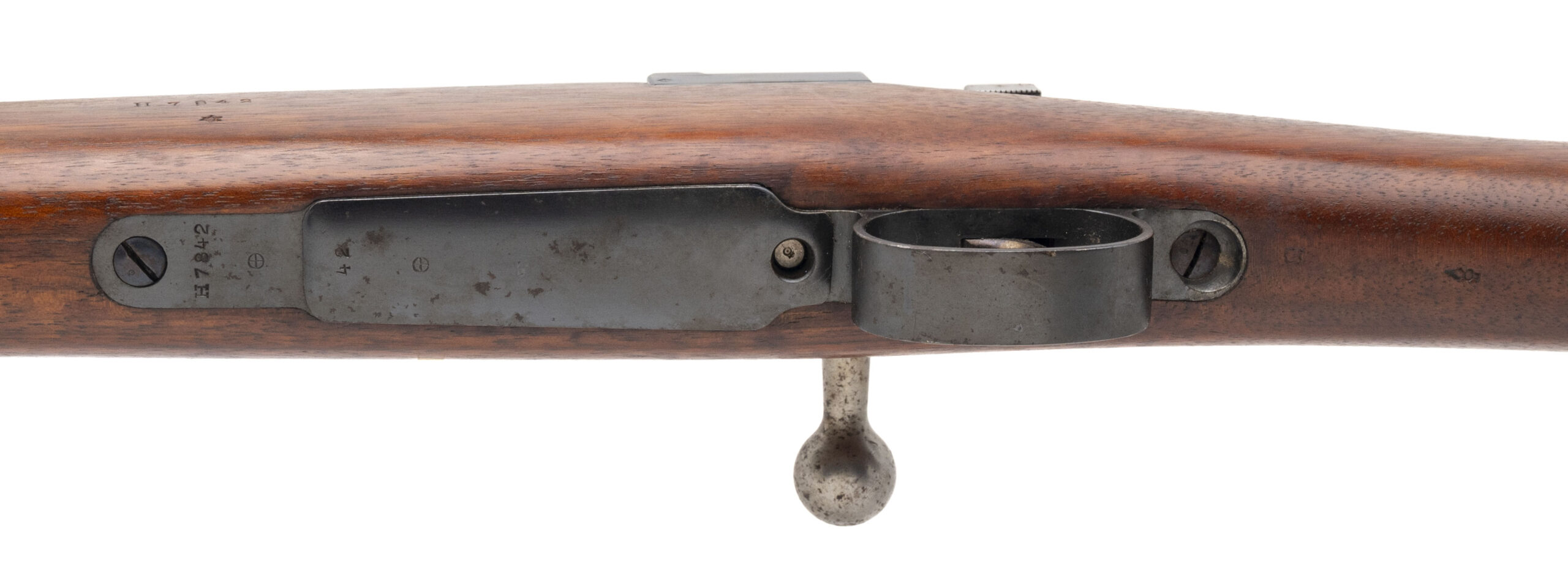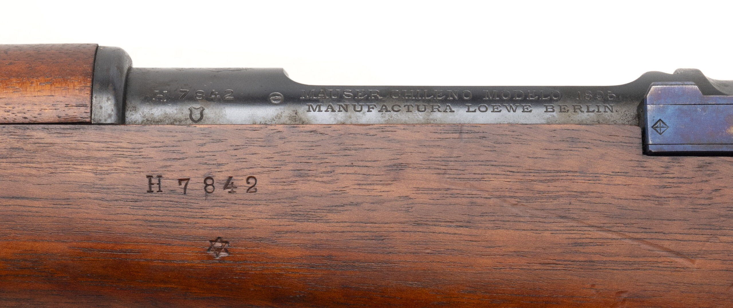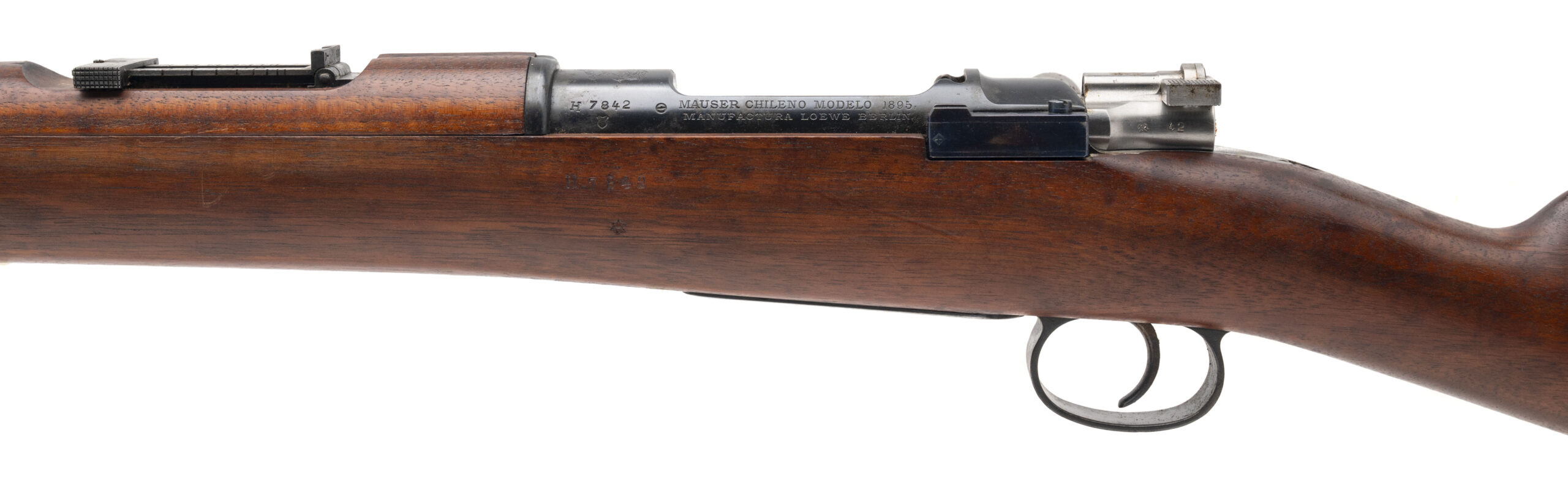 Serial No. H7842, made circa 1895-1896, 7x57mm 29 ½” round barrel. This rifle is a prime example of the Mauser Model 1895 contract rifles produced by Ludwig Loewe & Co. in Berlin for the Chilean military. Chambered in 7x57mm, the rifle retains all matching serial numbers, including the cleaning rod. The receiver’s factory markings remain crisp and well-defined, showcasing the classic “CHILE” crest and Loewe manufacturing legend. The walnut stock is in very good condition with light handling impressions throughout, and a well-struck Chilean military cartouche is noted on the right side. These rifles were built with the small-ring Mauser receiver, straight bolt handle, and feature the characteristic long-range tangent rear sight graduated to 2,000 meters. The metal finish has thinned slightly with age but remains uniform and attractive. The action is smooth and functions correctly. A strong example of a South American contract Mauser rifle