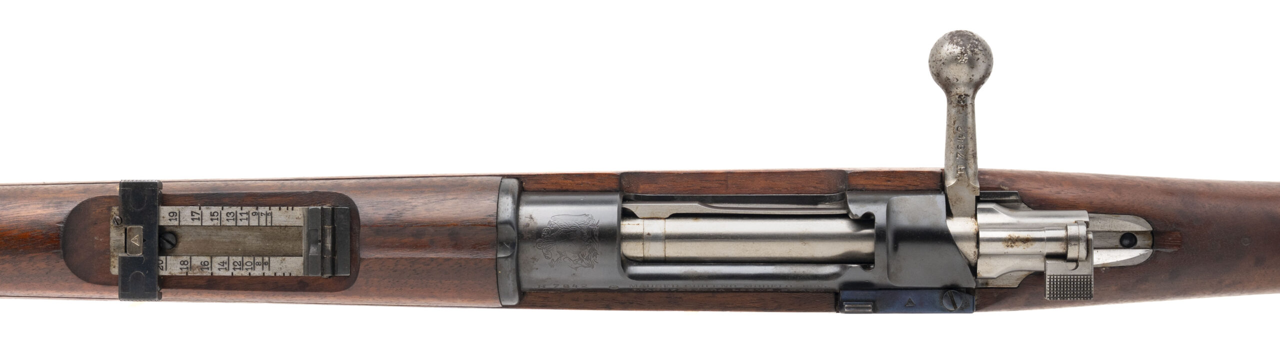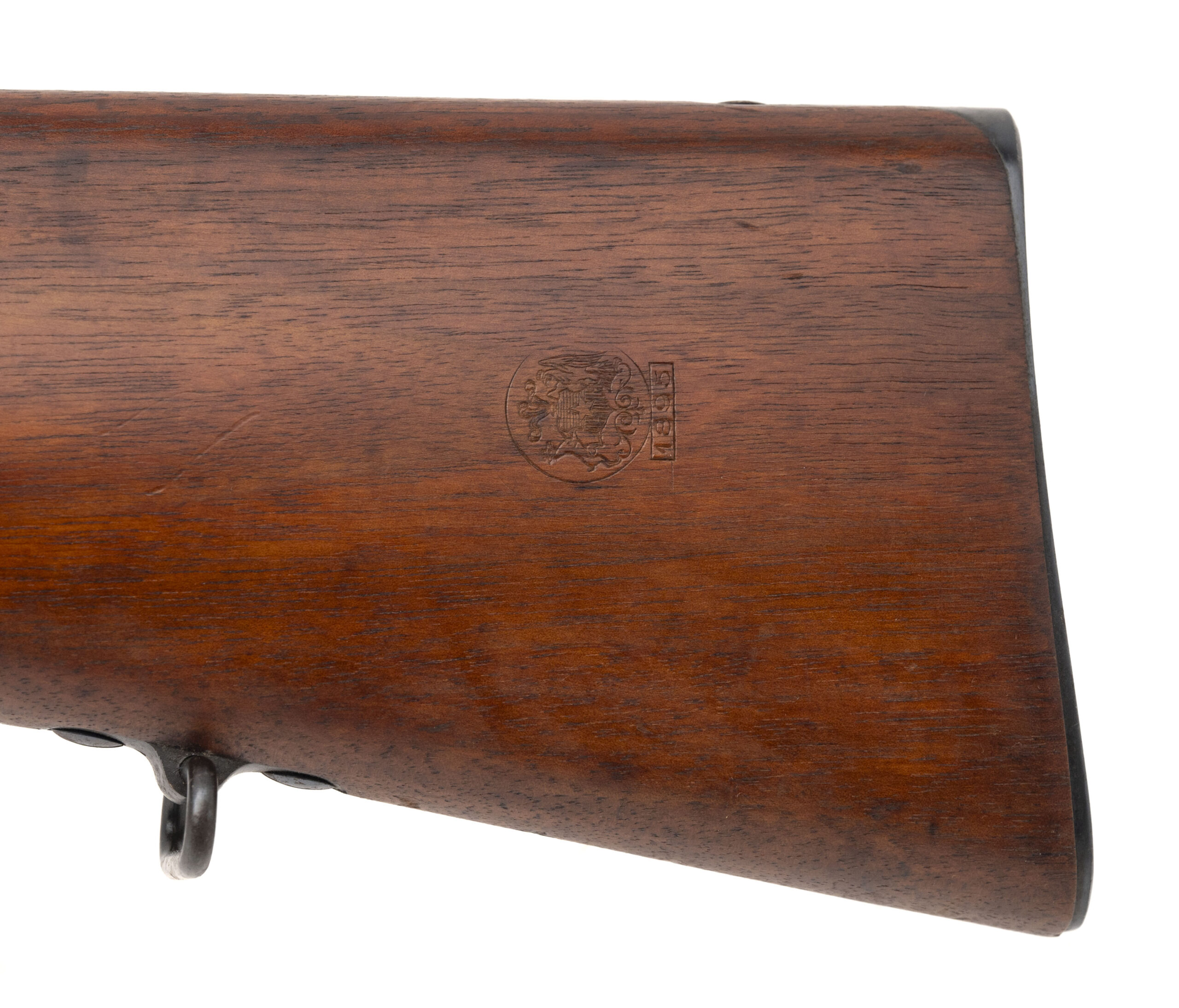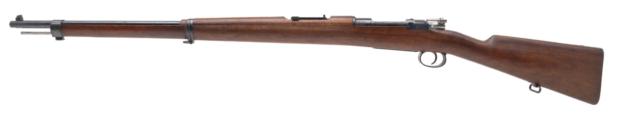 Serial No. H7842, made circa 1895-1896, 7x57mm 29 ½” round barrel. This rifle is a prime example of the Mauser Model 1895 contract rifles produced by Ludwig Loewe & Co. in Berlin for the Chilean military. Chambered in 7x57mm, the rifle retains all matching serial numbers, including the cleaning rod. The receiver’s factory markings remain crisp and well-defined, showcasing the classic “CHILE” crest and Loewe manufacturing legend. The walnut stock is in very good condition with light handling impressions throughout, and a well-struck Chilean military cartouche is noted on the right side. These rifles were built with the small-ring Mauser receiver, straight bolt handle, and feature the characteristic long-range tangent rear sight graduated to 2,000 meters. The metal finish has thinned slightly with age but remains uniform and attractive. The action is smooth and functions correctly. A strong example of a South American contract Mauser rifle