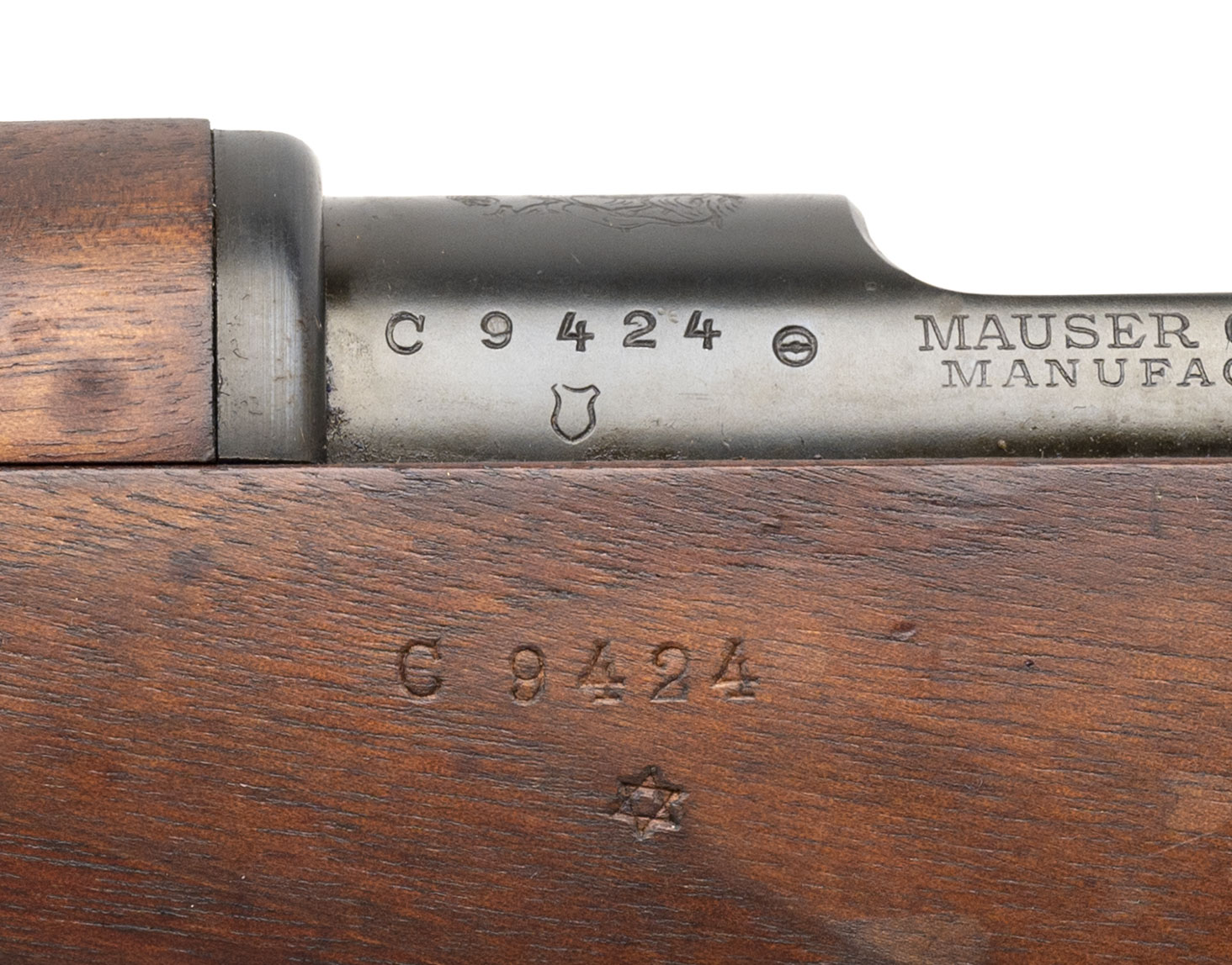 Serial No. C9424, manufactured 1895–1897 by Ludwig Loewe & Co., Berlin, 7x57mm, 29½” round barrel. Bolt is non-matching to the receiver. Metal finish and stock remain in very good overall condition, with a handsome Chilean crest cartouche visible on the stock. Action is smooth and functions correctly. A fine example of an early Loewe-produced Chilean contract Mauser
