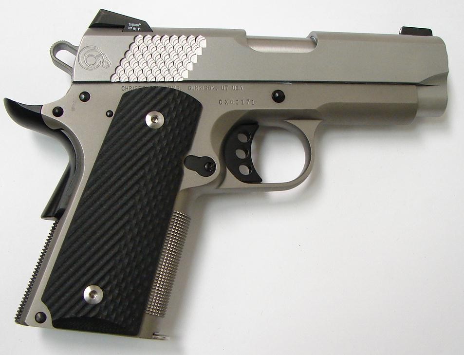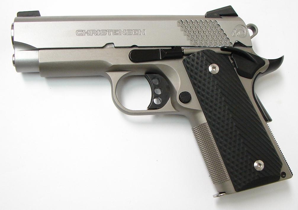 Christensen Arms 1911 Officer Lightweight .45 ACP caliber pistol. Titanium frame 3 1/2” compact custom carry gun with night sights and G10 grips. New. Price may change without notice.
