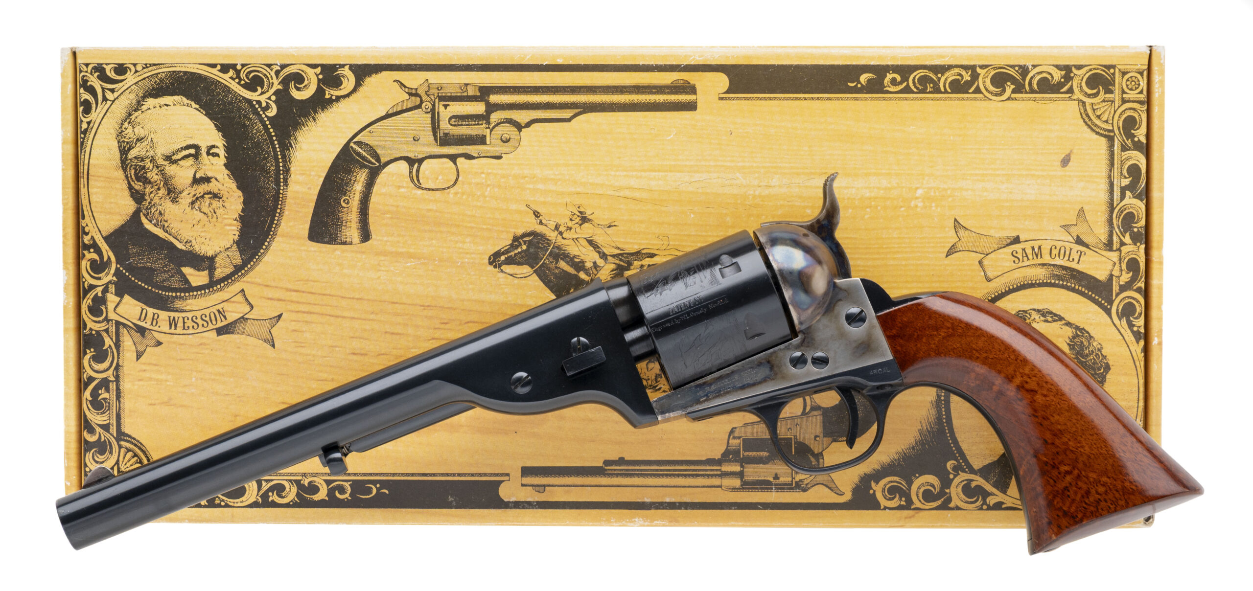 SN: X11144. Modern production, .45 S&W Schofield with a 7.5" barrel. Bore is very good. Modern Italian made single-action only revolver with a bladed front sight, blue finished barrel & 6rd cylinder, color case hardened frame, and wood grips. Finish shows light handling marks. Includes original box. Overall condition is near excellent.