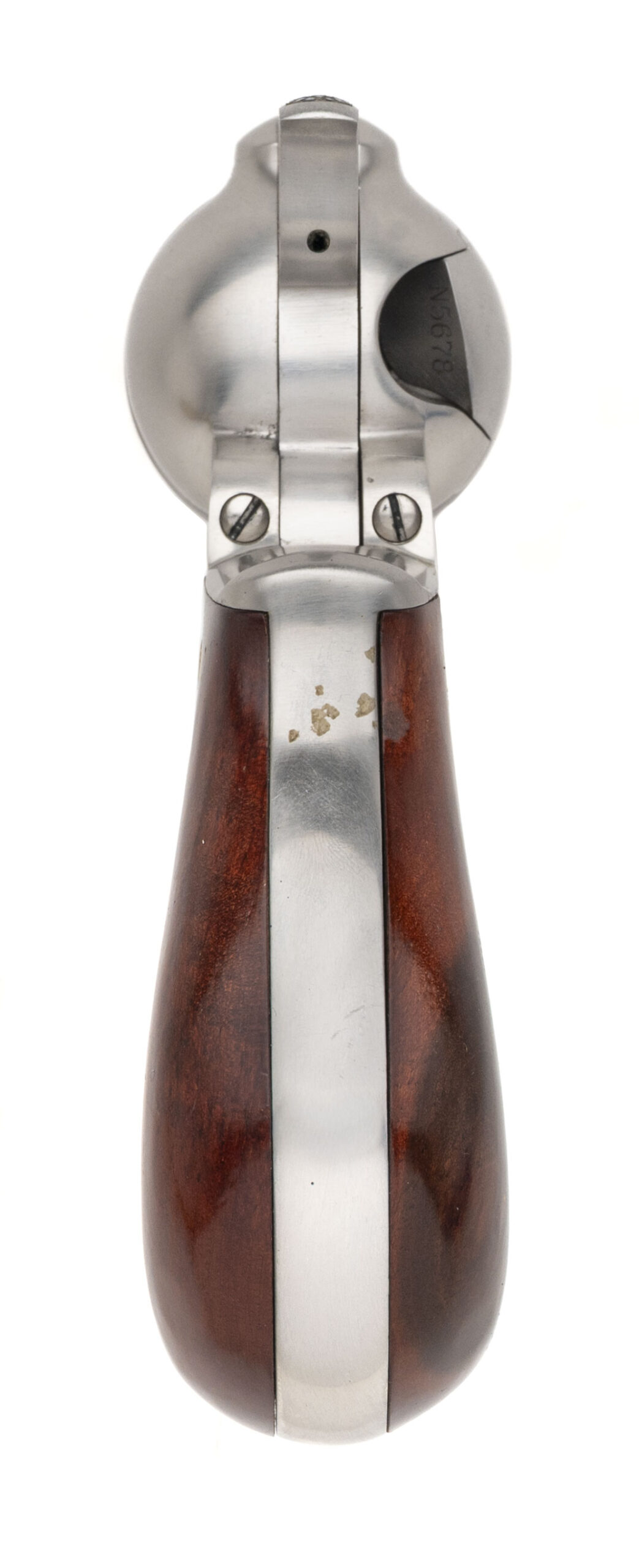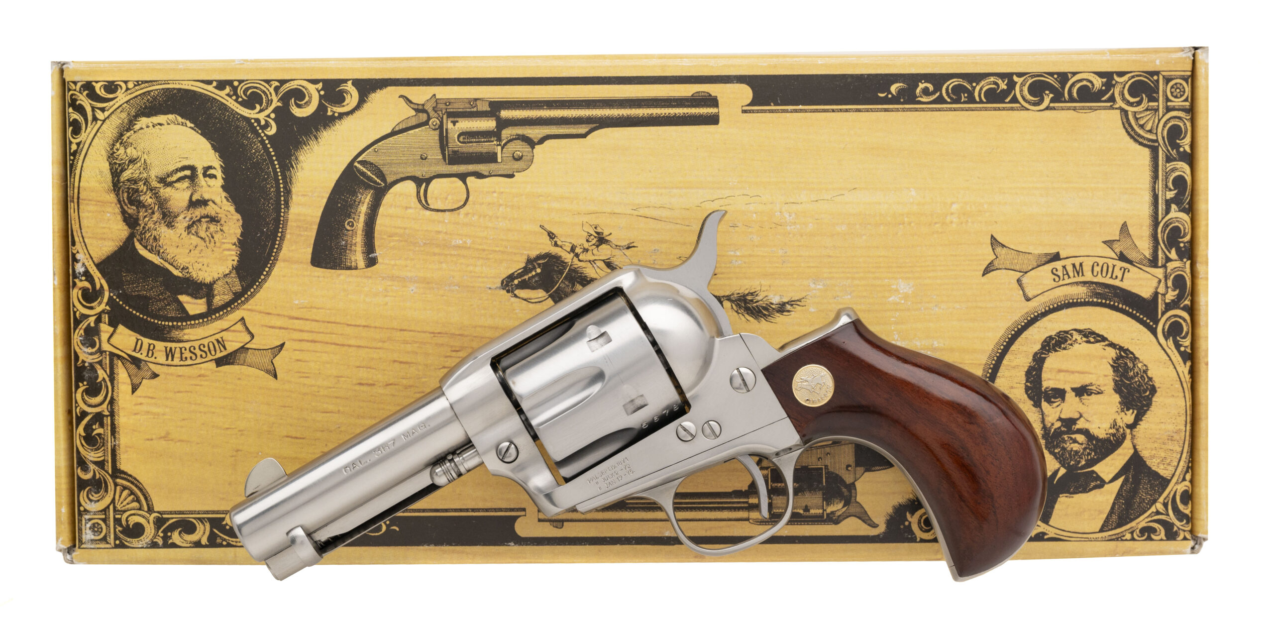 SN: N05678. Modern production .357 MAG. with a 3.5" barrel. Bore is very good. Single-action only stainless steel frame revolver with a bladed front sight, 6rd cylinder, and medallion wood grips. Metal shows moderate marks throughout. Overall condition is very good. Includes original box.