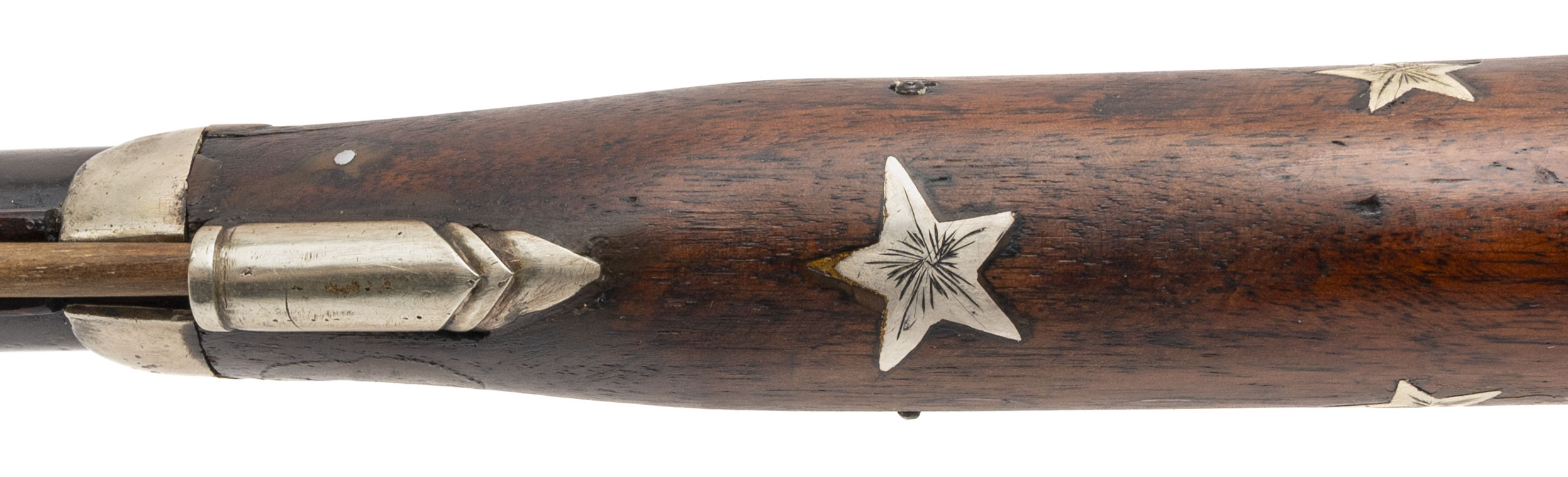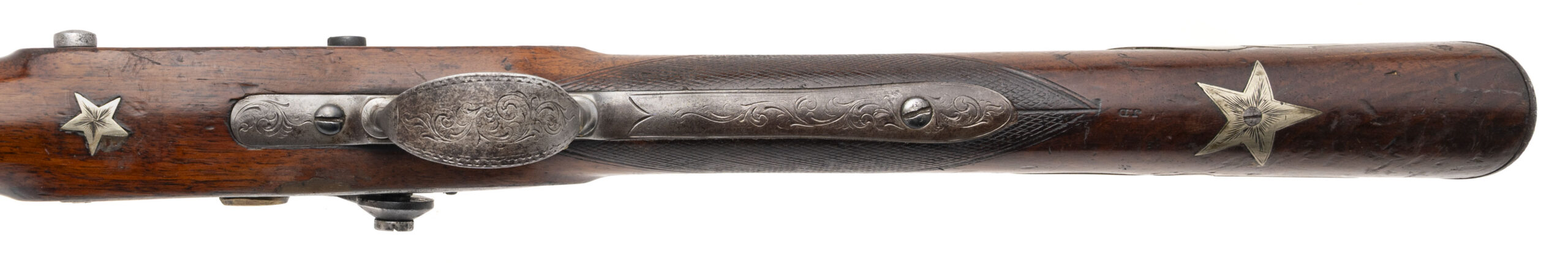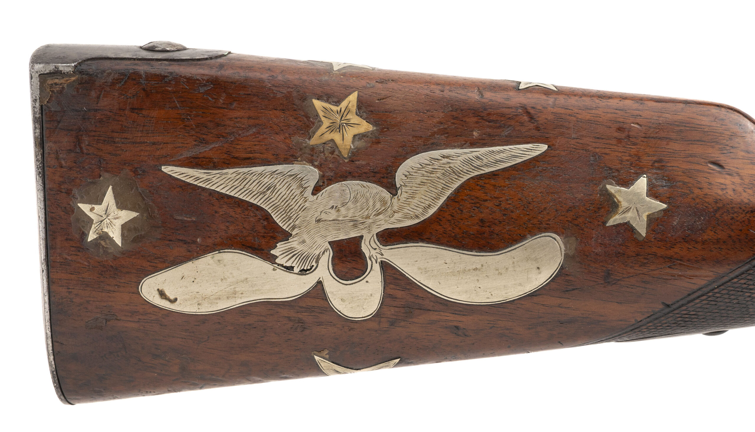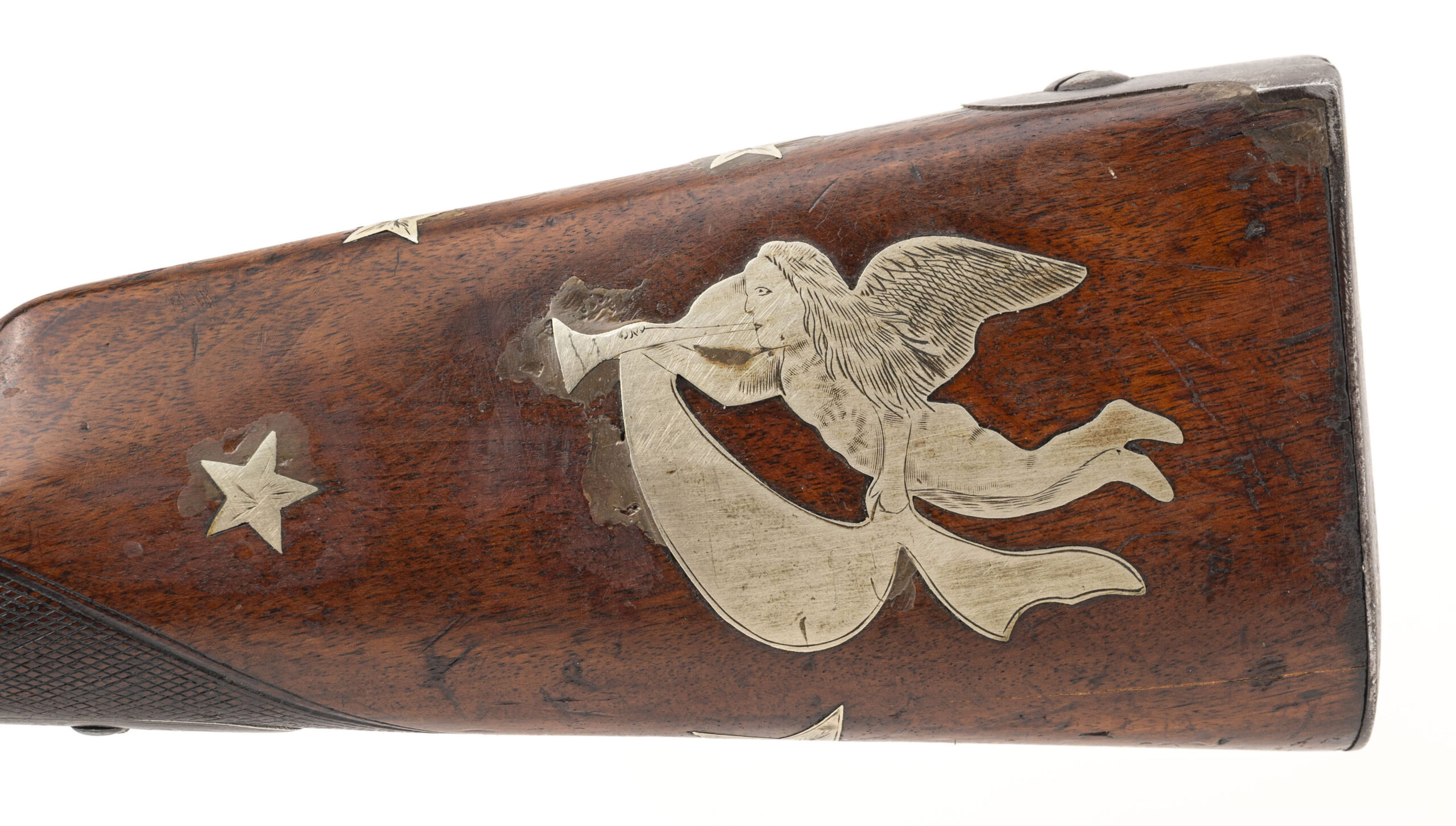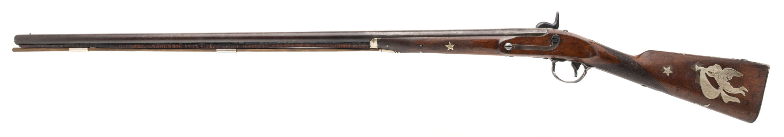 NSN. Made circa 1840. 69 smooth bore with a 40.5” barrel. This gun has been converted to percussion and also converted to a shotgun barrel with the barrel slightly shortened. The stock has German silver inlays with a patriotic eagle on the right hand side of the stock and a Angel playing a trumpet on the left hand side of the stock. There are also numerous stars throughout stock. The top of the barrel has also been engraved as well as the triggerguard. This is not uncommon to see on Civil War muskets and it also seems a lot of them decorated this way are also shortened. Very decorative Civil War gun!