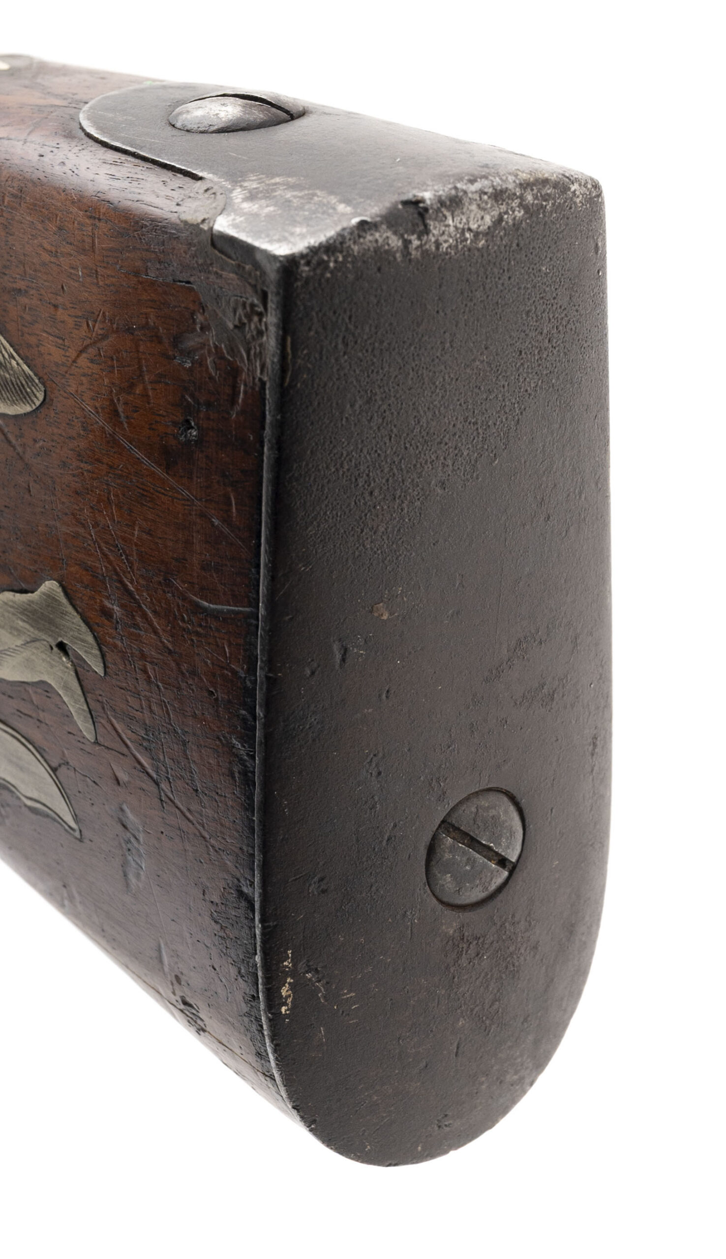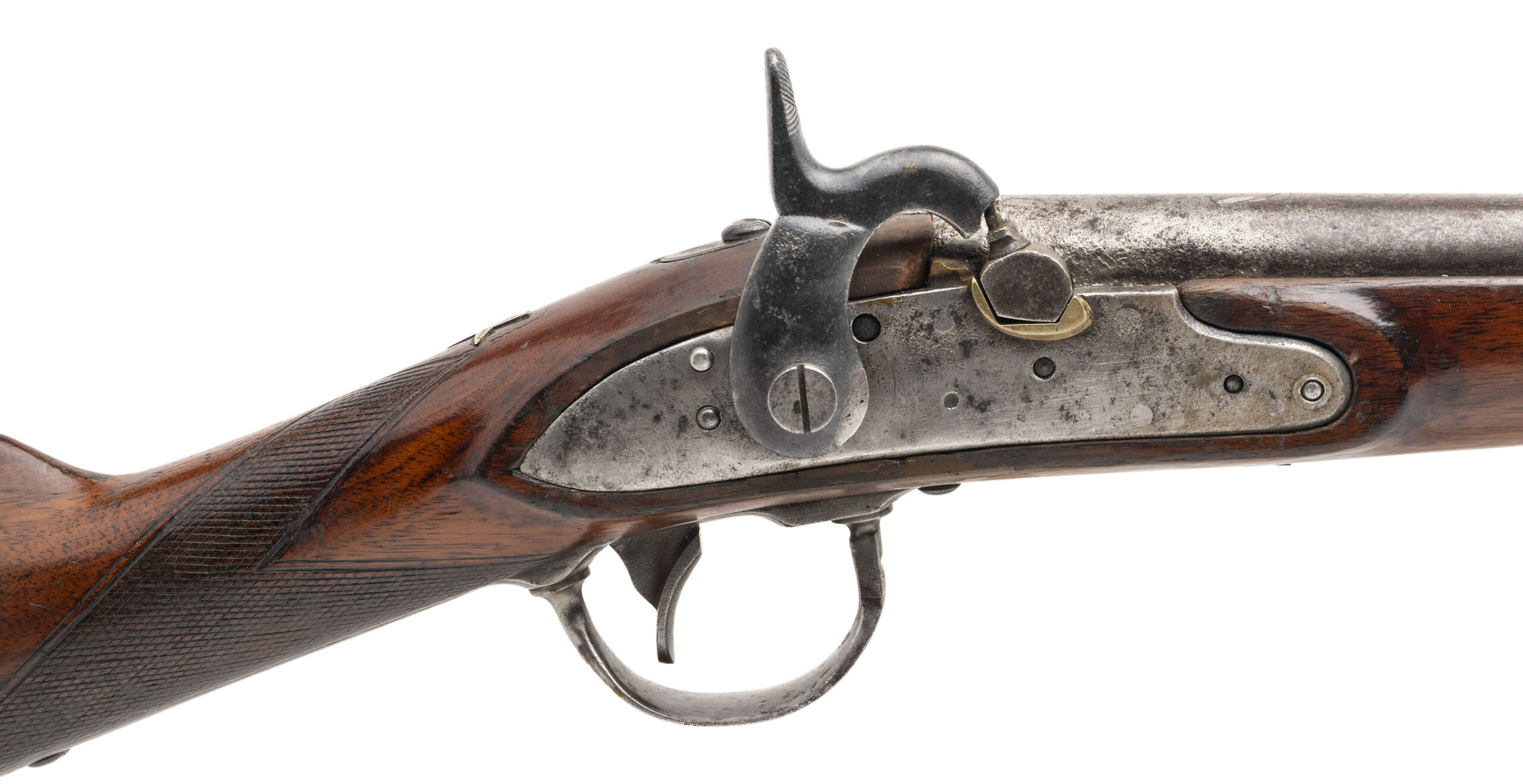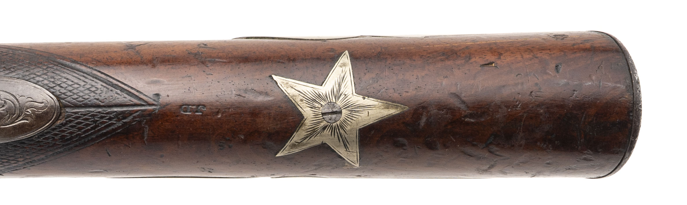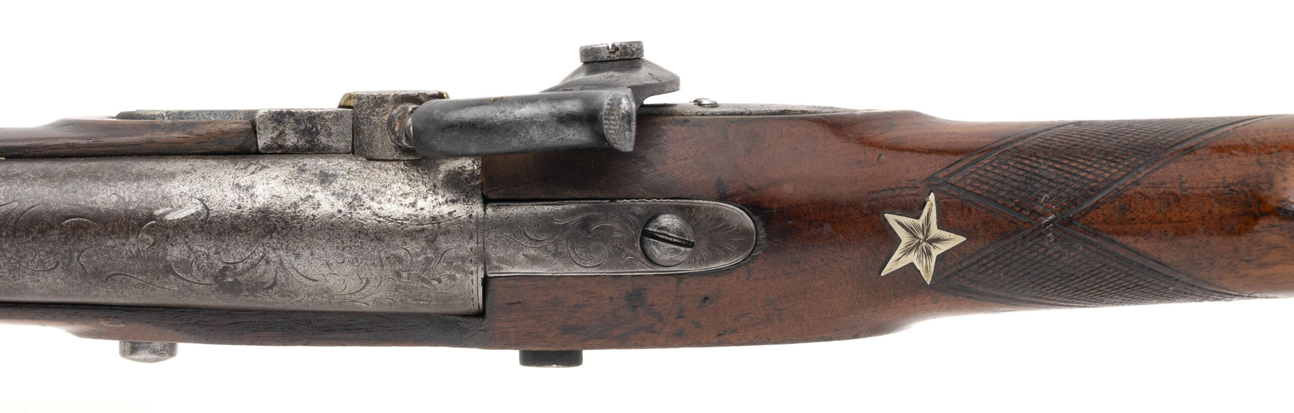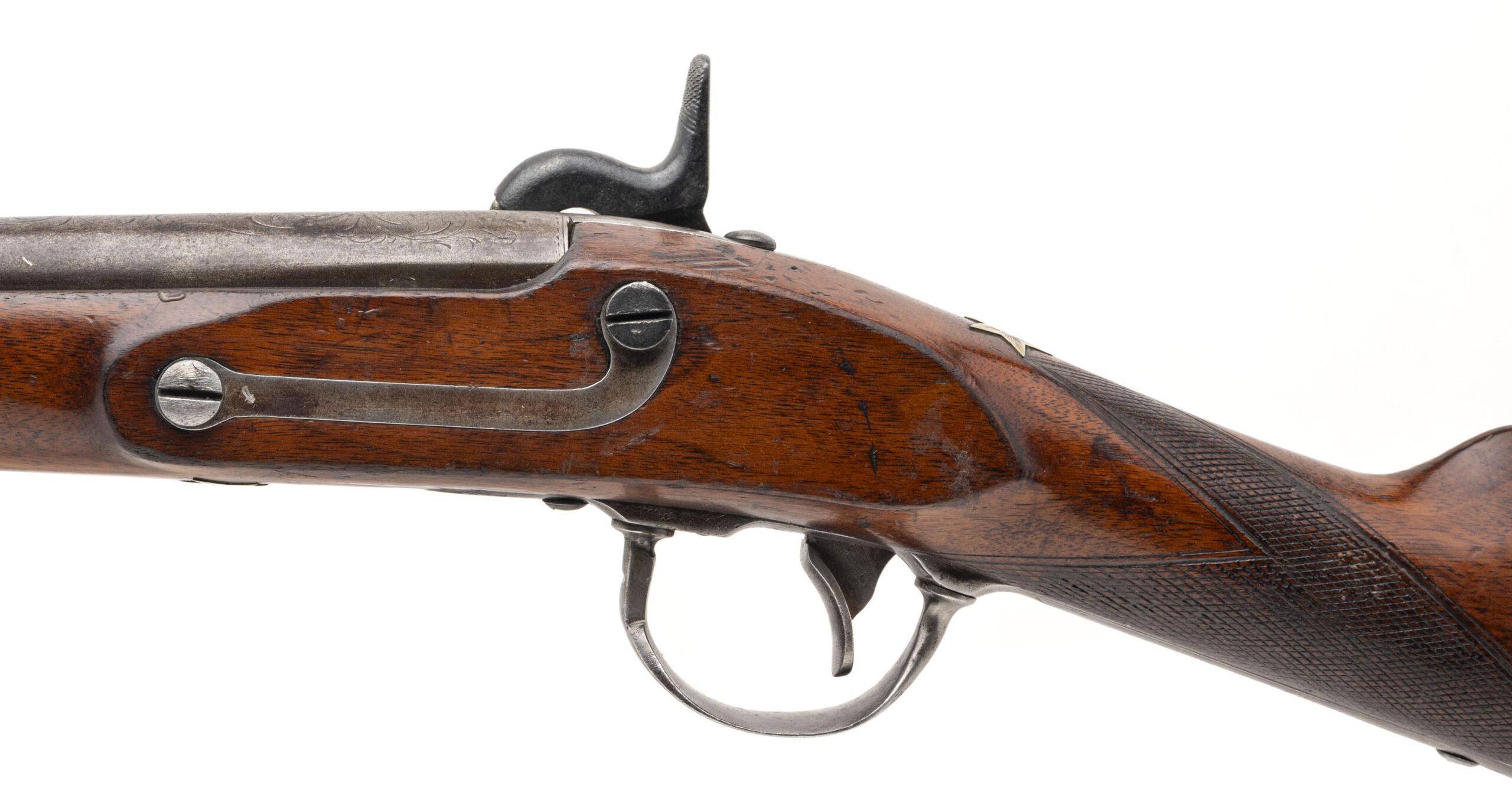 NSN. Made circa 1840. 69 smooth bore with a 40.5” barrel. This gun has been converted to percussion and also converted to a shotgun barrel with the barrel slightly shortened. The stock has German silver inlays with a patriotic eagle on the right hand side of the stock and a Angel playing a trumpet on the left hand side of the stock. There are also numerous stars throughout stock. The top of the barrel has also been engraved as well as the triggerguard. This is not uncommon to see on Civil War muskets and it also seems a lot of them decorated this way are also shortened. Very decorative Civil War gun!