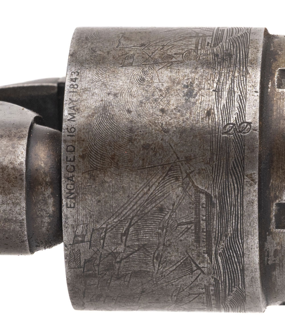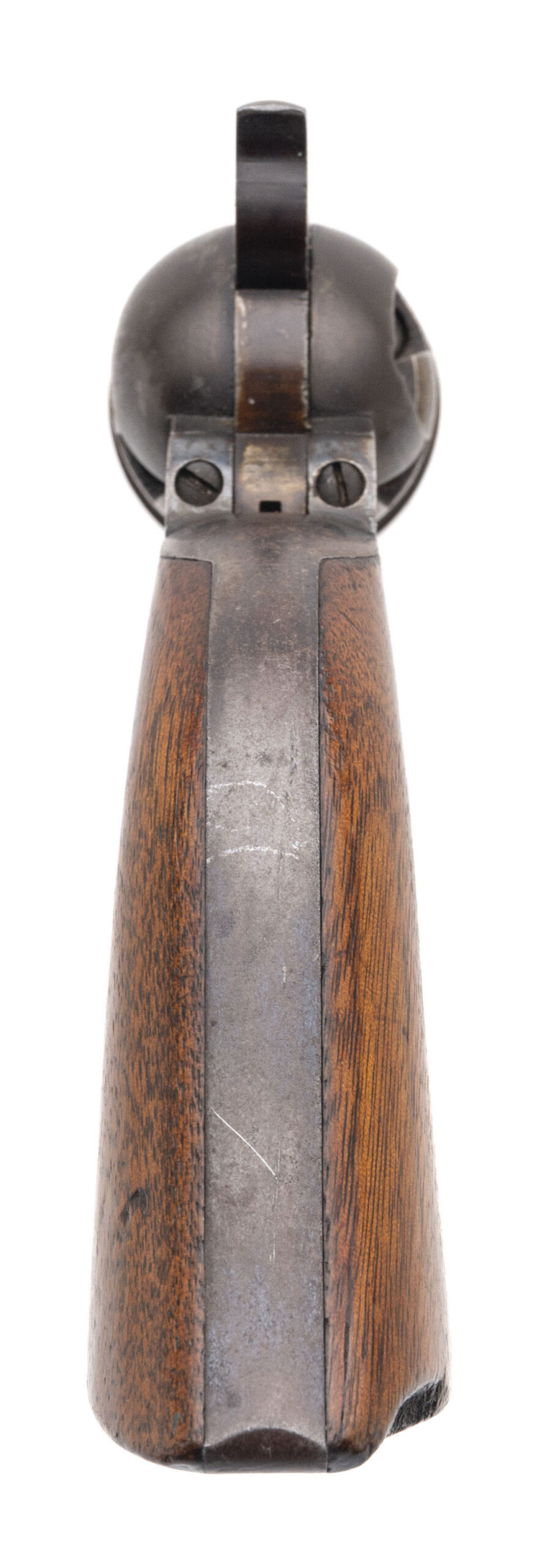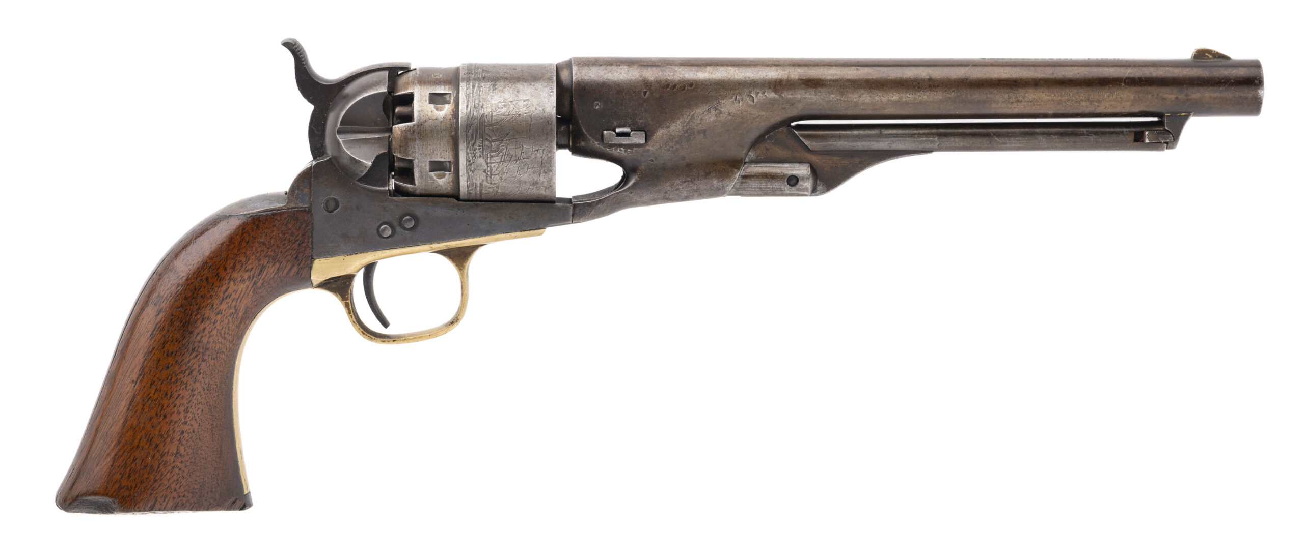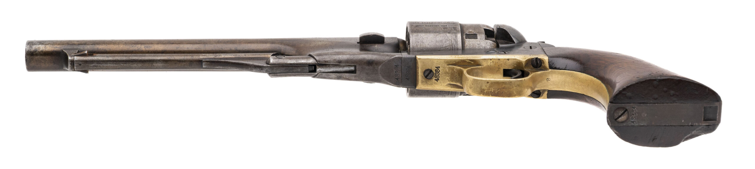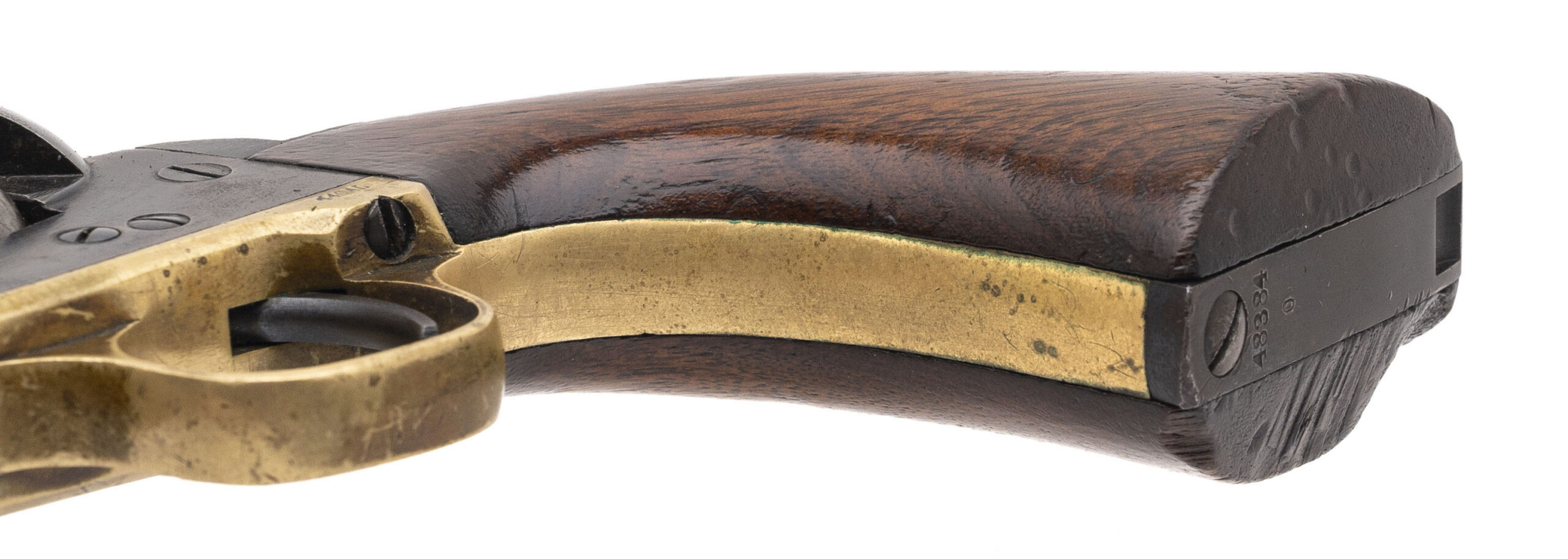 SN 48384. Made in 1862. 44 caliber with an 8” barrel. This is a very fine example with a dark brown Tabaco patina on the barrel and almost all of the case colors on the frame although dark. The grips are nice and sharp and have been refinished. There are small military inspectors marks throughout the various pieces. Accompanying this gun is a black leather period flap holster