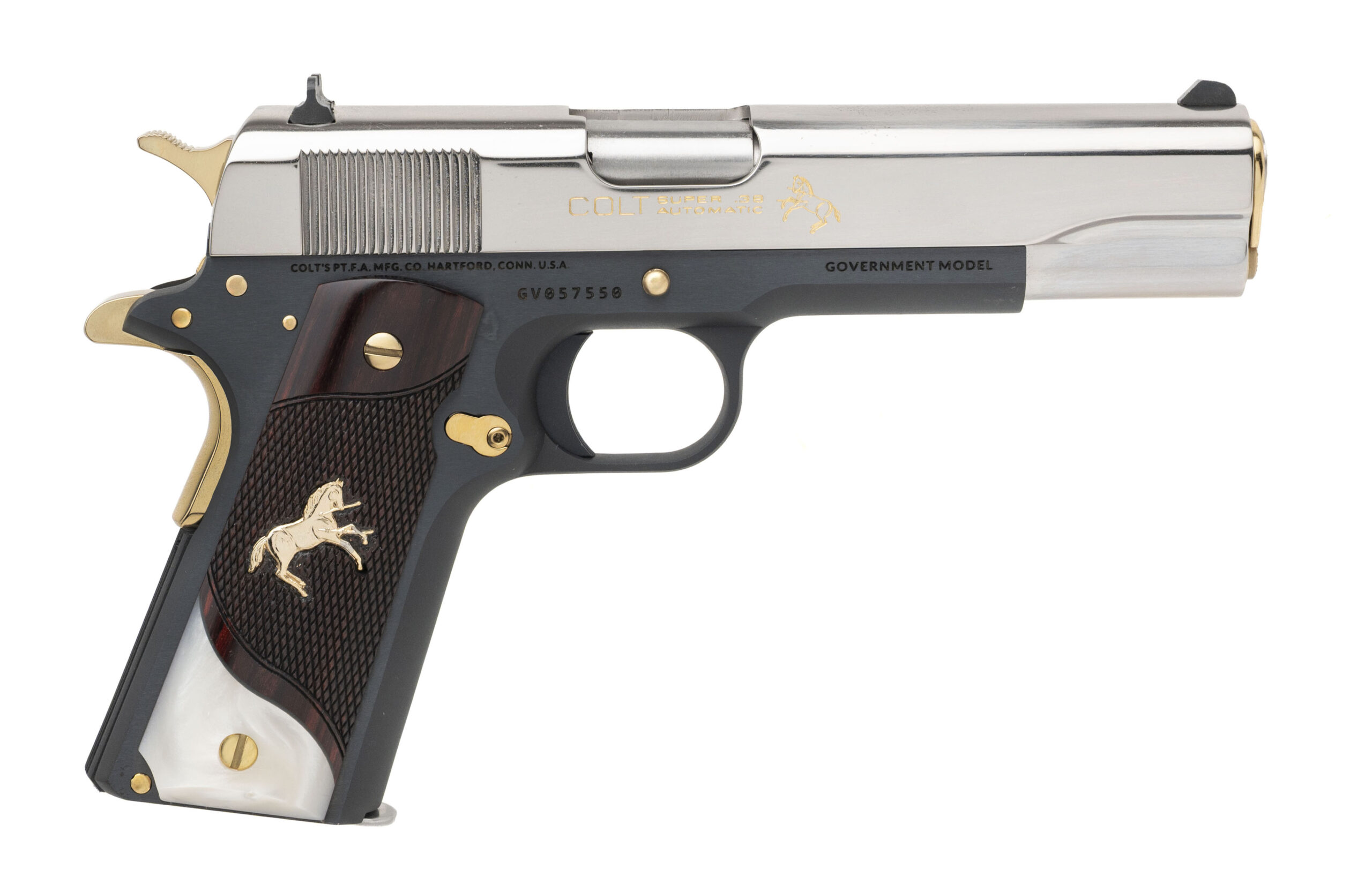 SN: GV057550. Modern production, .38 Super with a 5" barrel. Bore is bright with strong rifling. One of 100 made custom Government 1911 pistol with a high polished nickel finish w/pvd coating on the slide, 24kt gold inlays, fancy rosewood grips, and gold accents. Metal shows light oxidation on the top of the slide, but the overall condition is very good. This is number 100 of the 100 units that CNC produced making it a very desirable collectors gun. Includes box and authenticity certificate.