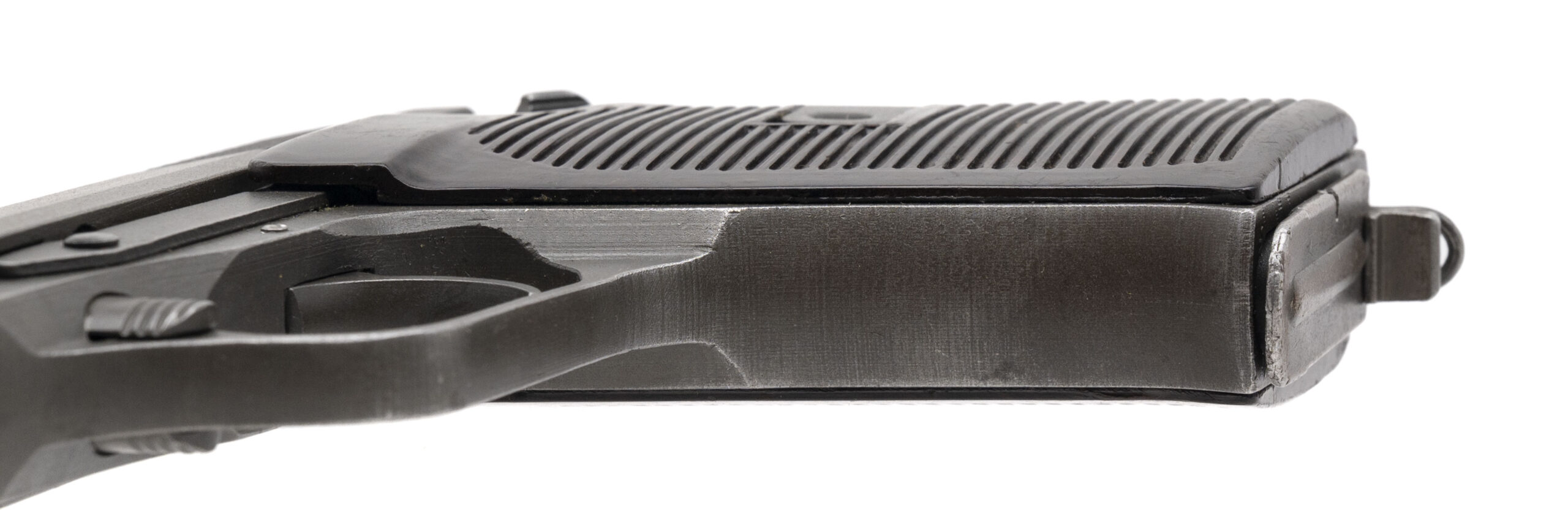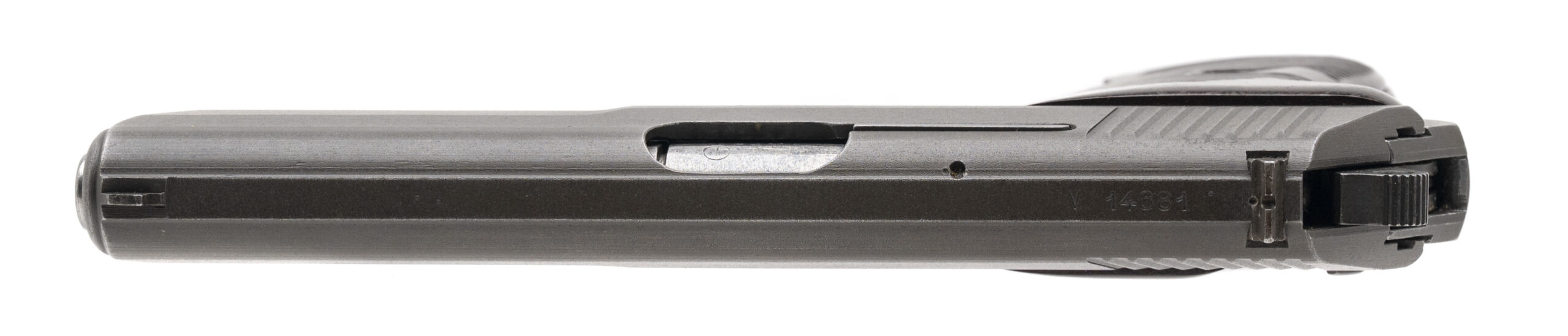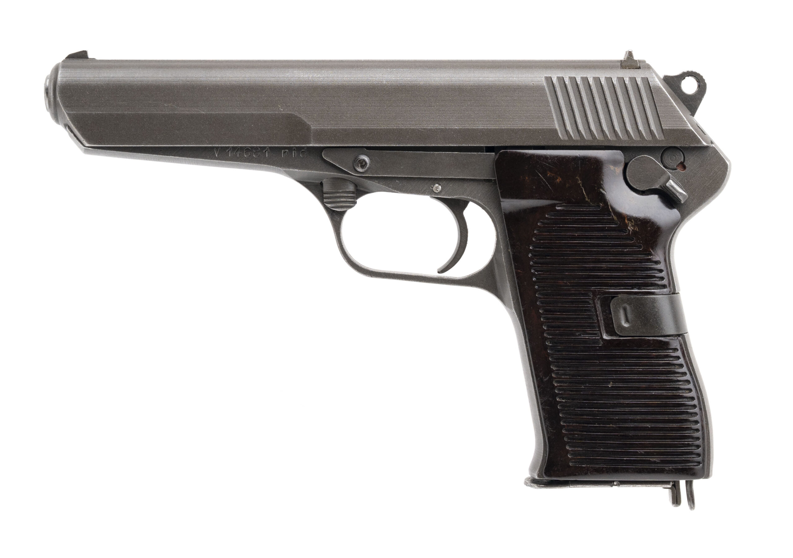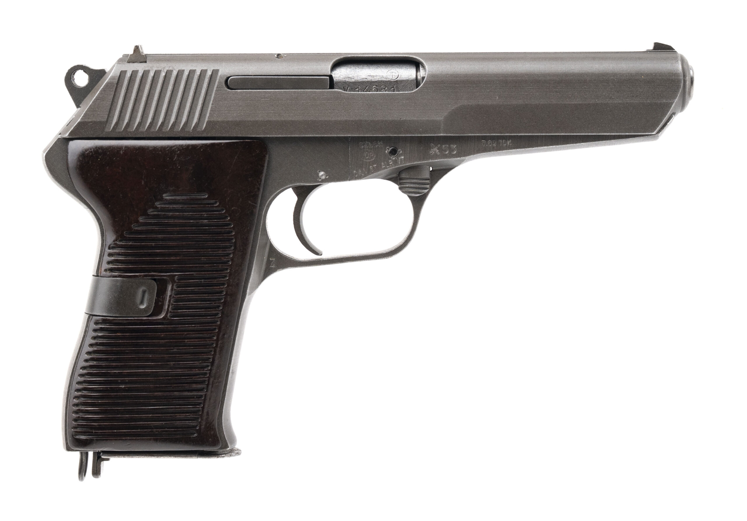 Serial No. V14681, manufactured in 1953, chambered in 7.62x25mm Tokarev, featuring a 4 ¾” round barrel. This Cold War-era Czech pistol, developed for military service during the early 1950s, is in very good overall condition. The matching serial numbers confirm its originality, and the finish exhibits only light wear on high edges. Grips are solid and clean, with minimal signs of wear. The CZ 52 is known for its roller-locked short recoil system, a rare design choice among pistols of its era. Action is smooth and functions correctly, making this an excellent representation of Cold War Eastern Bloc military sidearms.
