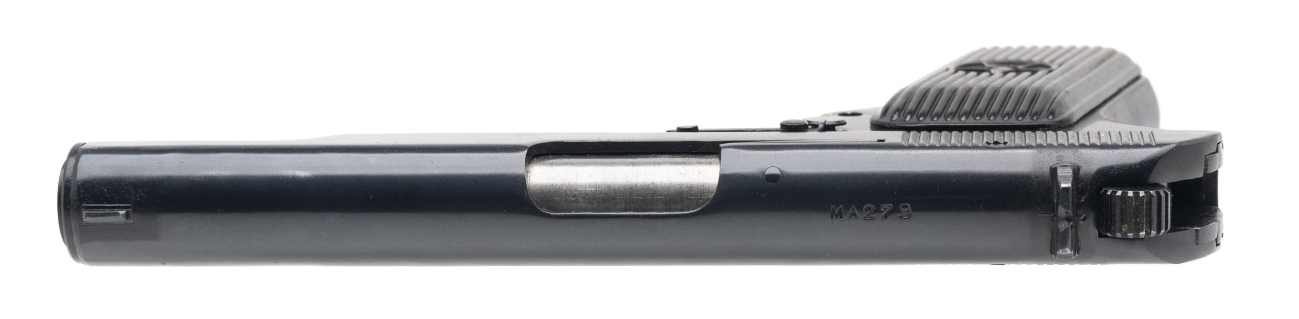 Serial No. MA279, manufactured in 1952, chambered in 7.62x25mm Tokarev, with a 4 ¾” round barrel. The pistol remains in very good condition, retaining approximately 98% of its original finish. Serial numbers on the slide and frame are matching. The grips are in excellent condition, showing minimal wear, and feature the typical Romanian star-in-circle pattern. The action is smooth and functions correctly. This pistol includes its original brown leather flap holster, a cleaning rod, and an extra magazine.