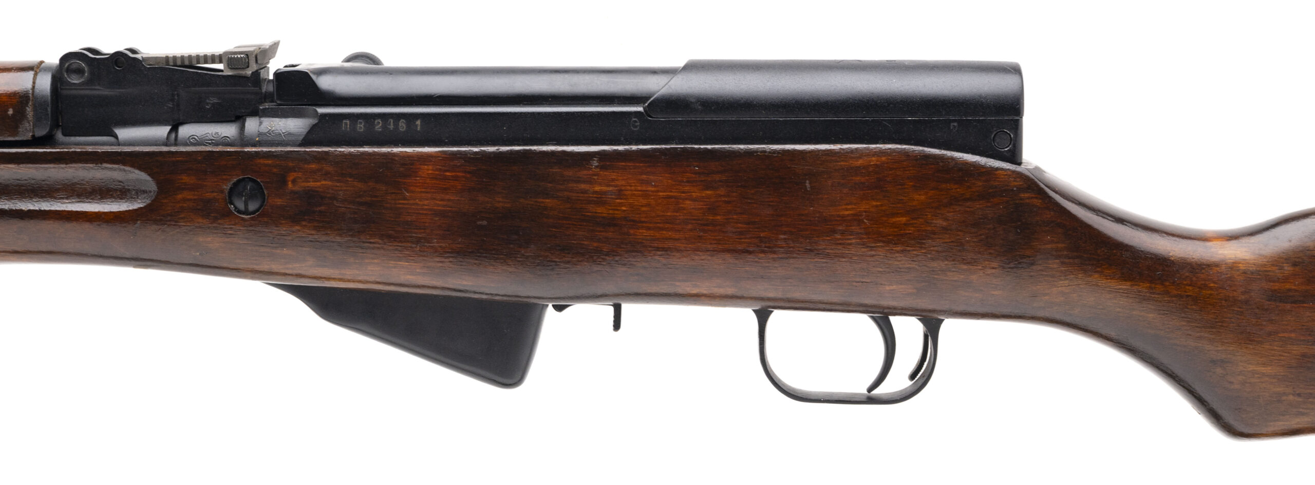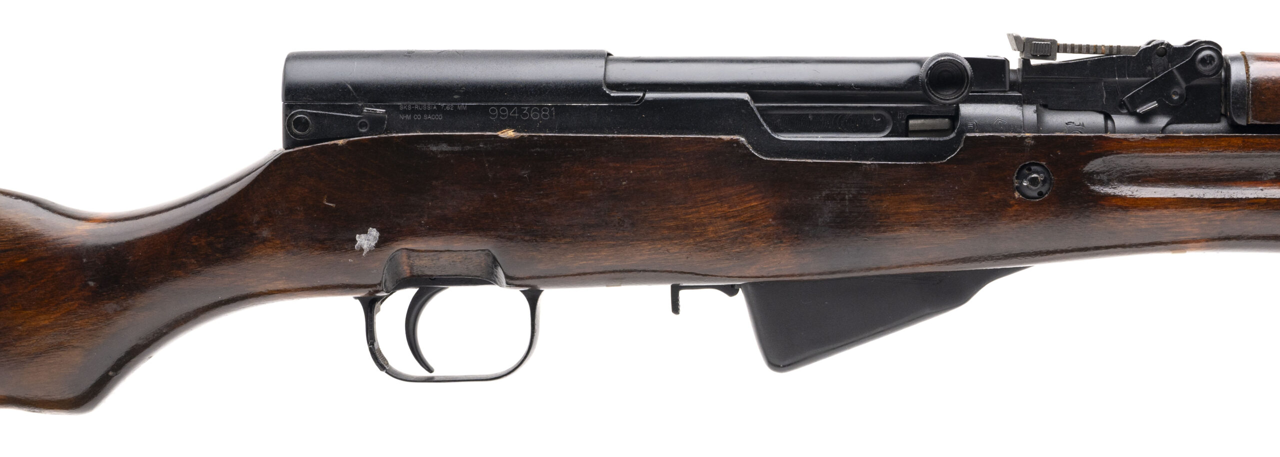 Serial No. 9943681 (Importer), manufactured in 1950, 7.62x39mm, 20½” round barrel. Factory serial numbers are matching throughout. Metal finish and stock remain in very good overall condition, showing only minimal handling and storage wear. Wood retains its original military finish with light surface impressions noted. Action is smooth and functions correctly. A clean and well-preserved example of a Russian Cold War–era SKS, representing one of the most reliable and widely issued semi-automatic carbines of its time.
