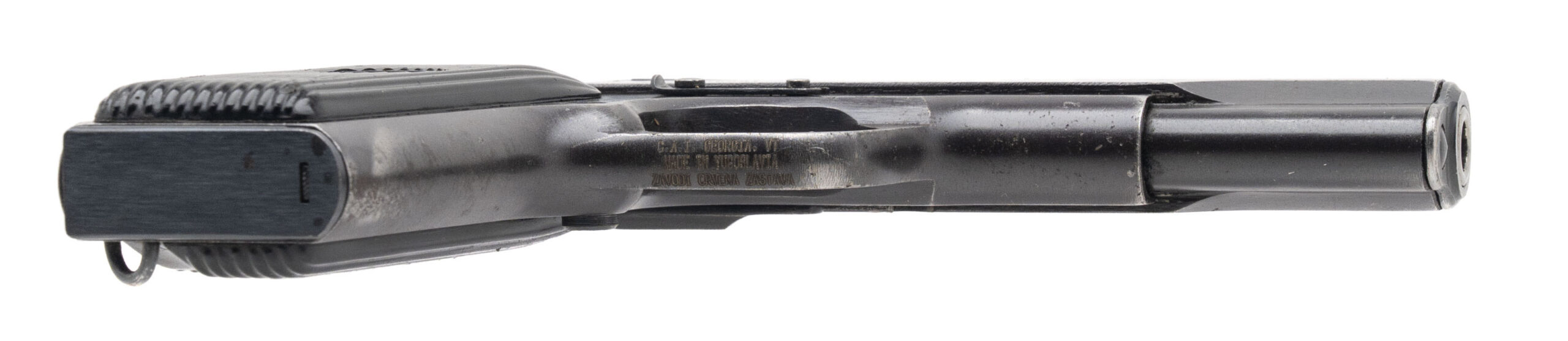 Serial No. X209091, manufactured circa 1960s, 7.62x25mm Tokarev, 4½” round barrel This Cold War-era Yugoslavian M57, a licensed and extended variant of the Soviet TT-33 Tokarev pistol, features the longer 9-round magazine and extended grip characteristic of Yugoslav production. The serial numbers are matching, and the prefix on the frame has been altered to “X”, a common post-production modification, often done during export or refurbishment. The pistol remains in very good overall condition, with light surface wear and high edge thinning consistent with use and age. Crest remains present on the slide. Grips are solid, and the external metal finish retains a nice patina without corrosion. Mechanically, the action is smooth and functions correctly, making this a solid example of a Cold War military sidearm used by Yugoslav forces.