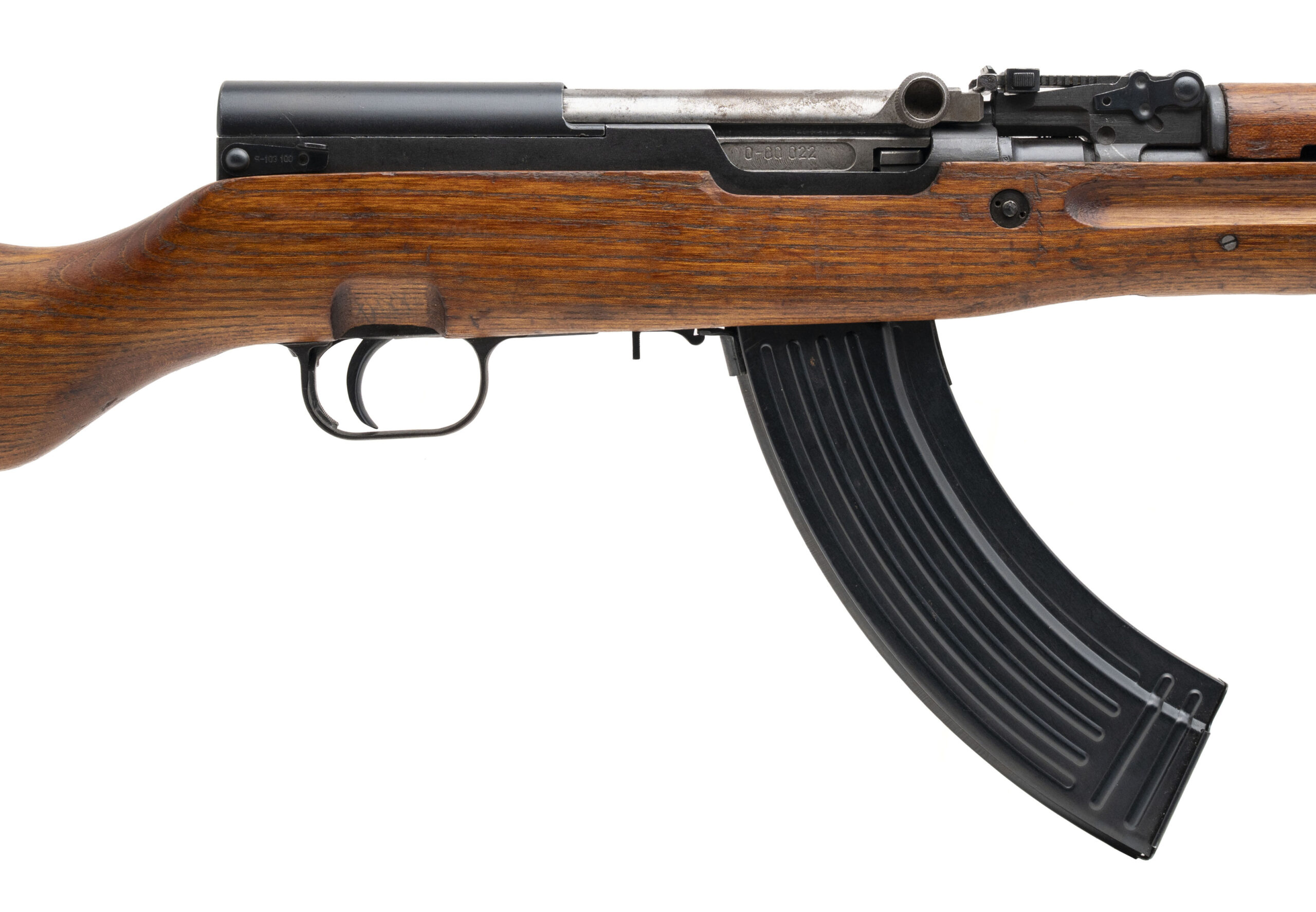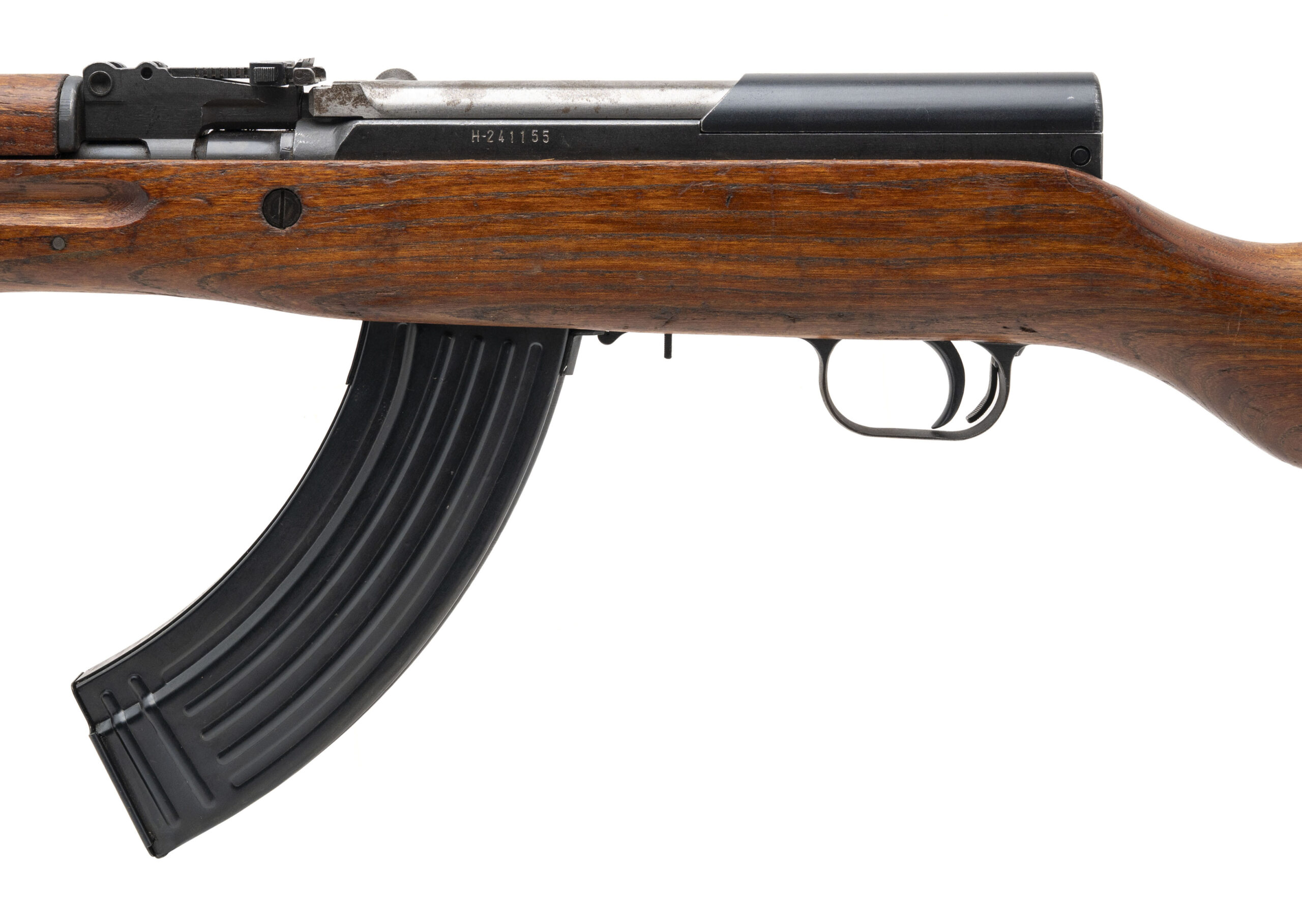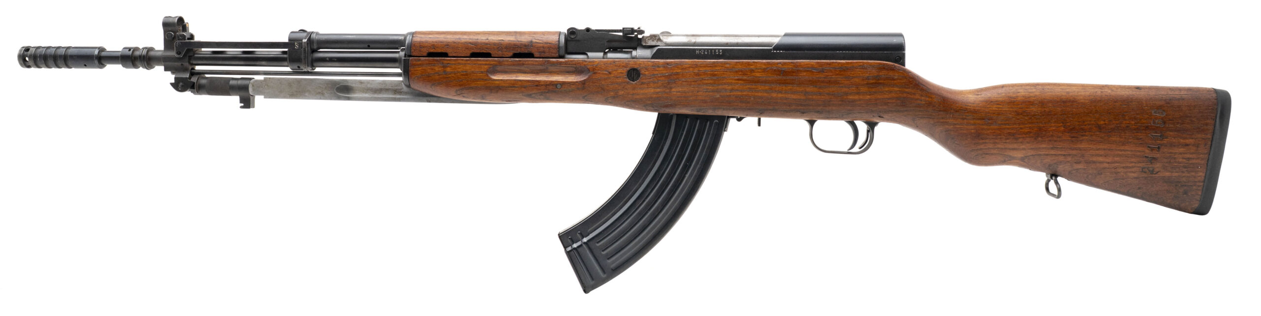 Serial No. H-241155, manufactured in 1971, chambered in 7.62x39mm with a 24” round barrel. Bore is bright with strong rifling. Serial numbers are matching, though the trigger guard has been force-matched. Rifle remains in overall good condition, showing typical handling and storage wear. Action is smooth and functions correctly. Import mark is present on the right side of the barrel.