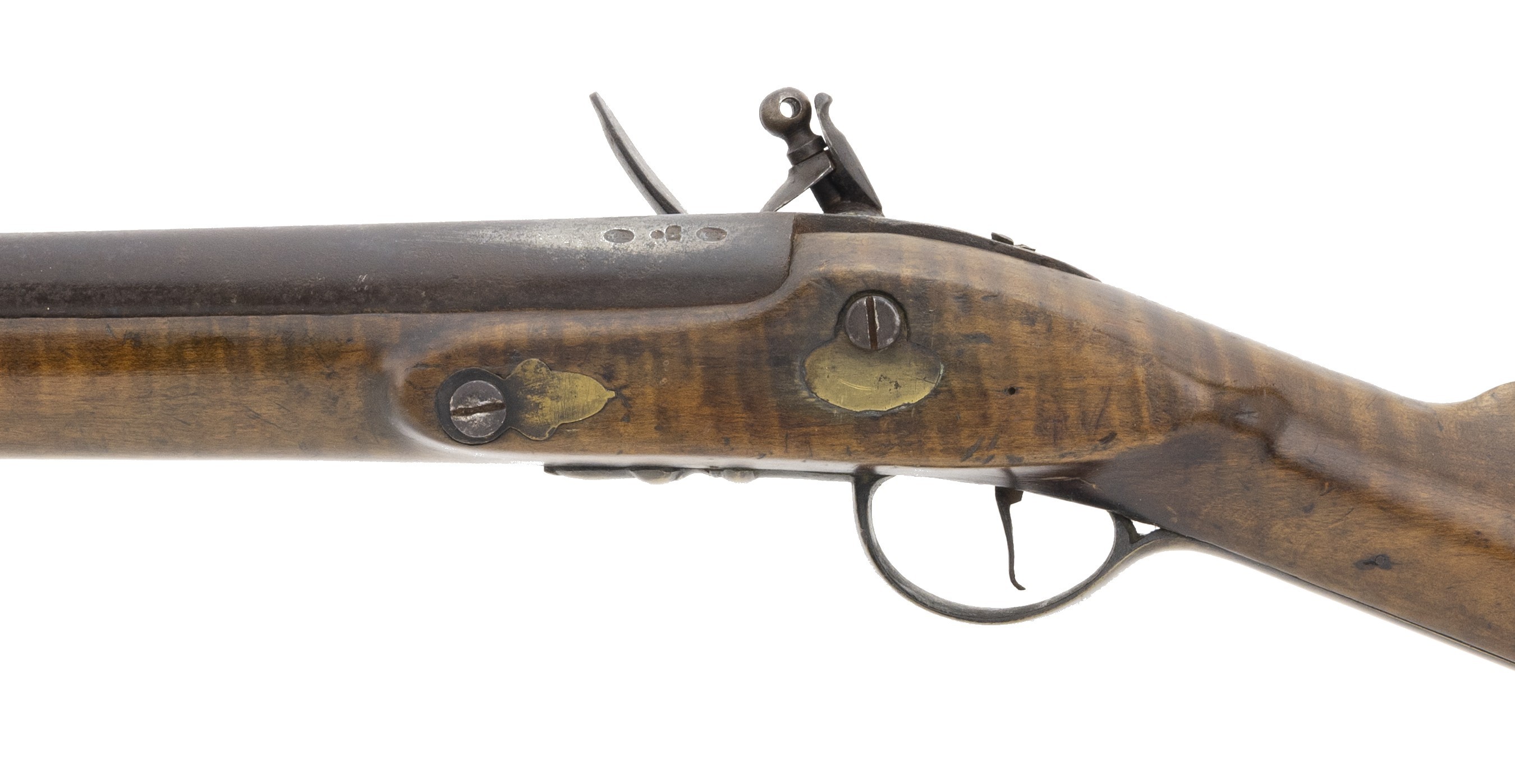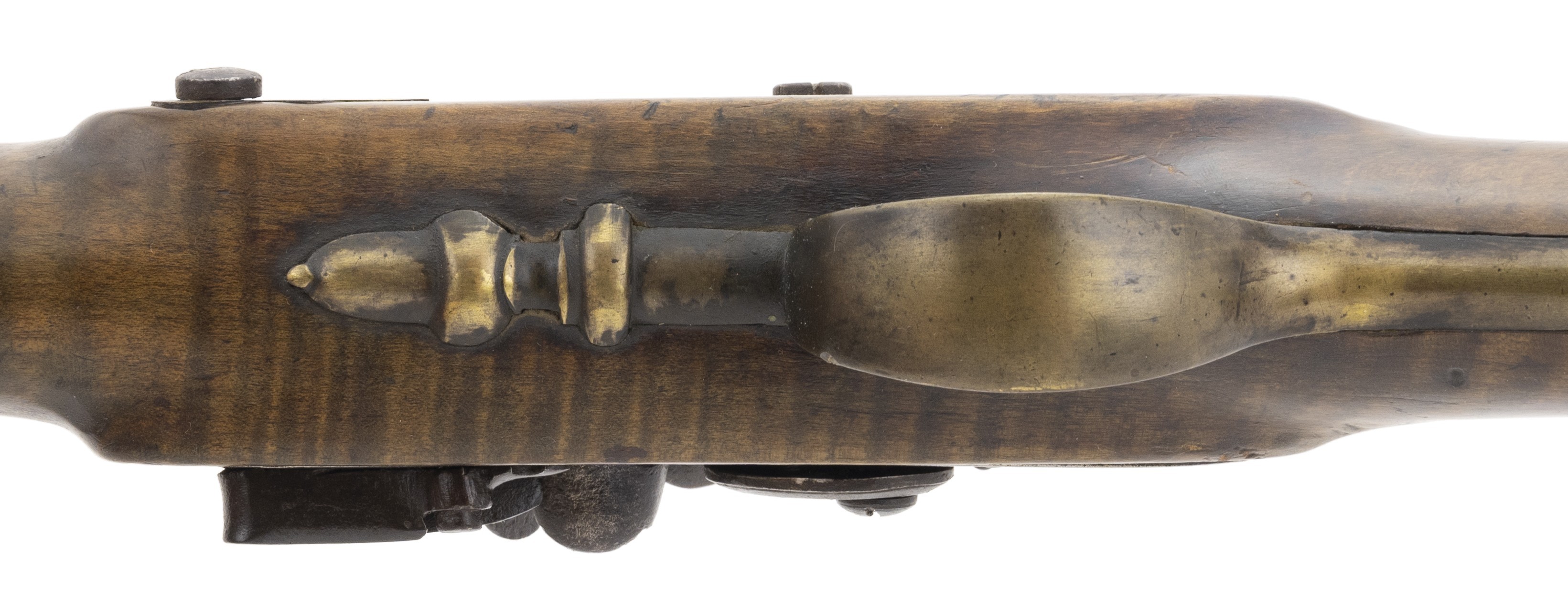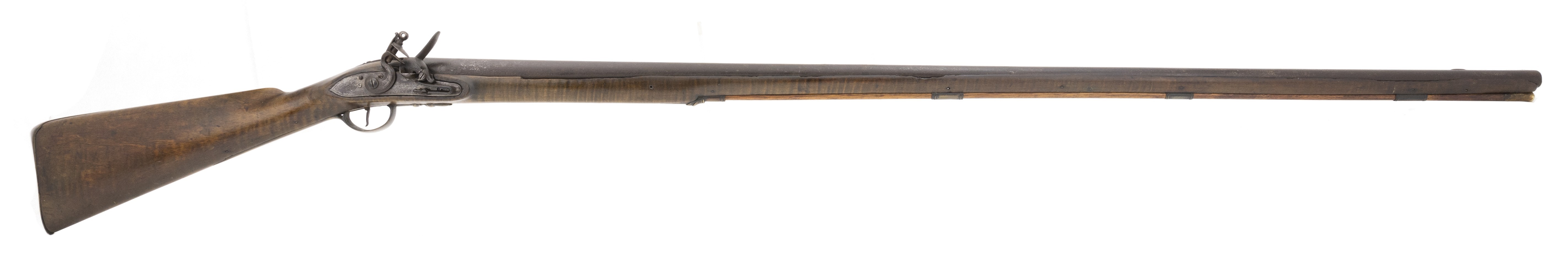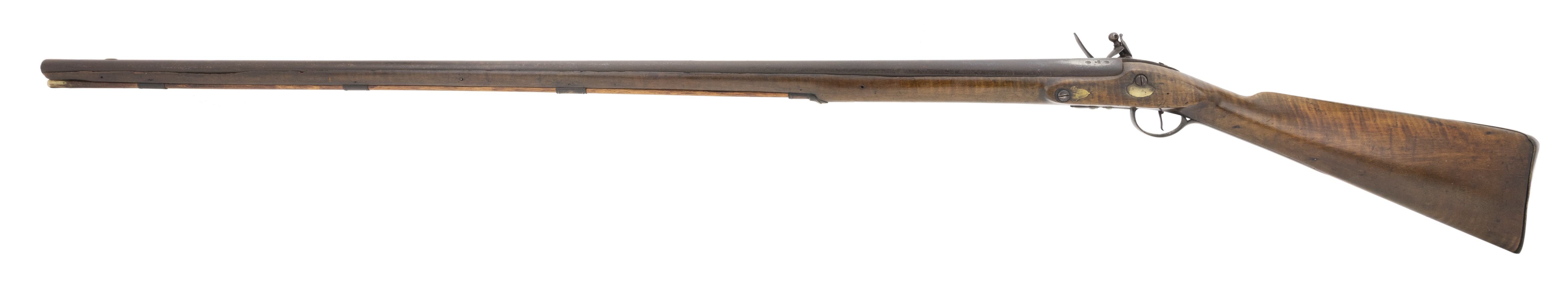 The lock is marked “Fiddian”. This full-stocked approximately .64 caliber fowling piece is 63½” long with a 47⅞” long barrel. All metal is good with areas of light pitting and a dark patina. The stock is good with some wood loss at the barrel tang and along the barrel. The lock, marked “Fiddian” at the center, has a border line and light engraving to the rear. The hammer is lightly engraved. The barrel has two proof marks. The four brass ramrod pipes, trigger guard, and butt plate are very good with a nice patina. The front trigger guard tang has the period raised acorn shape. The action functions correctly. This fowler would look great hanging over your fireplace! It is unusual to encounter one of these with the original full-length stock and barrel, most were shortened during use.
