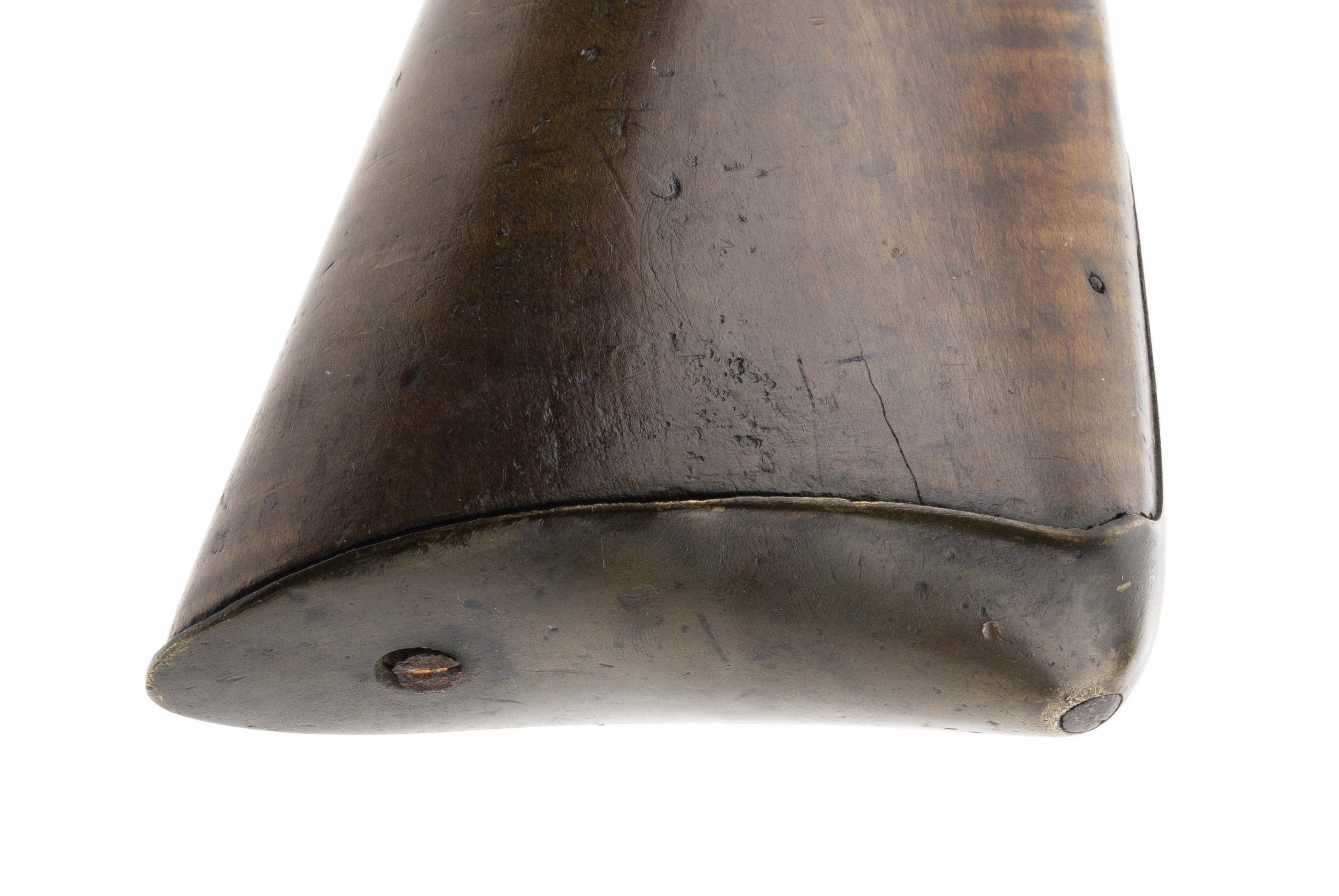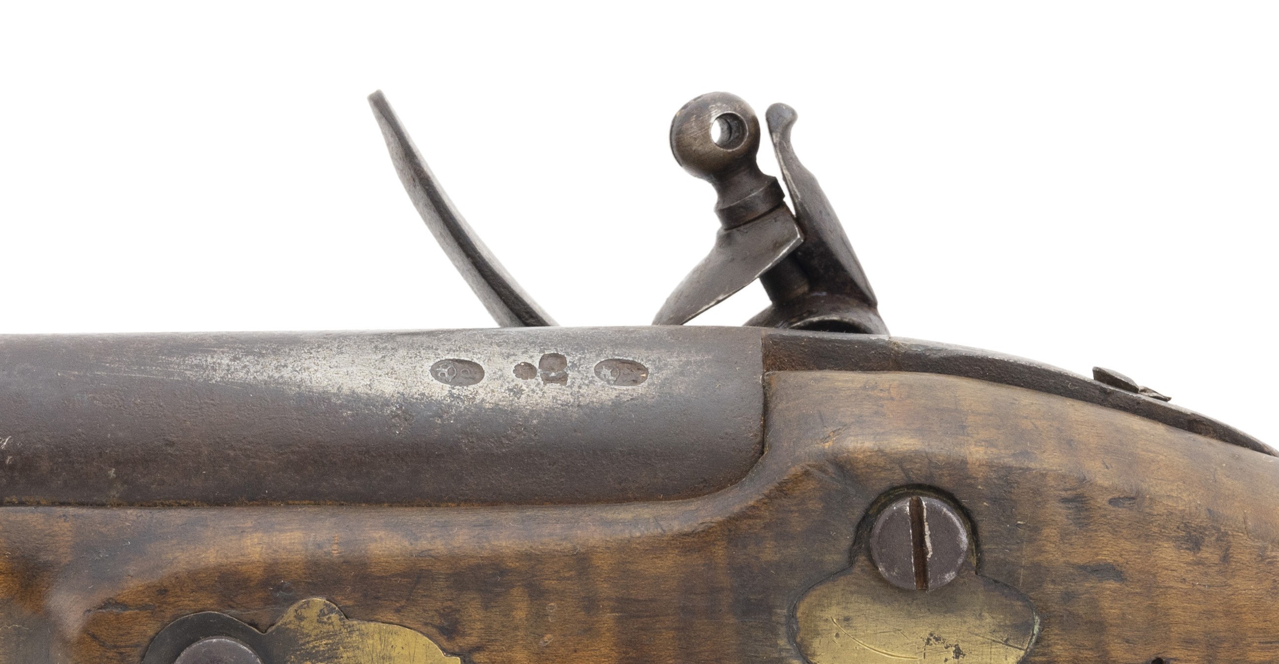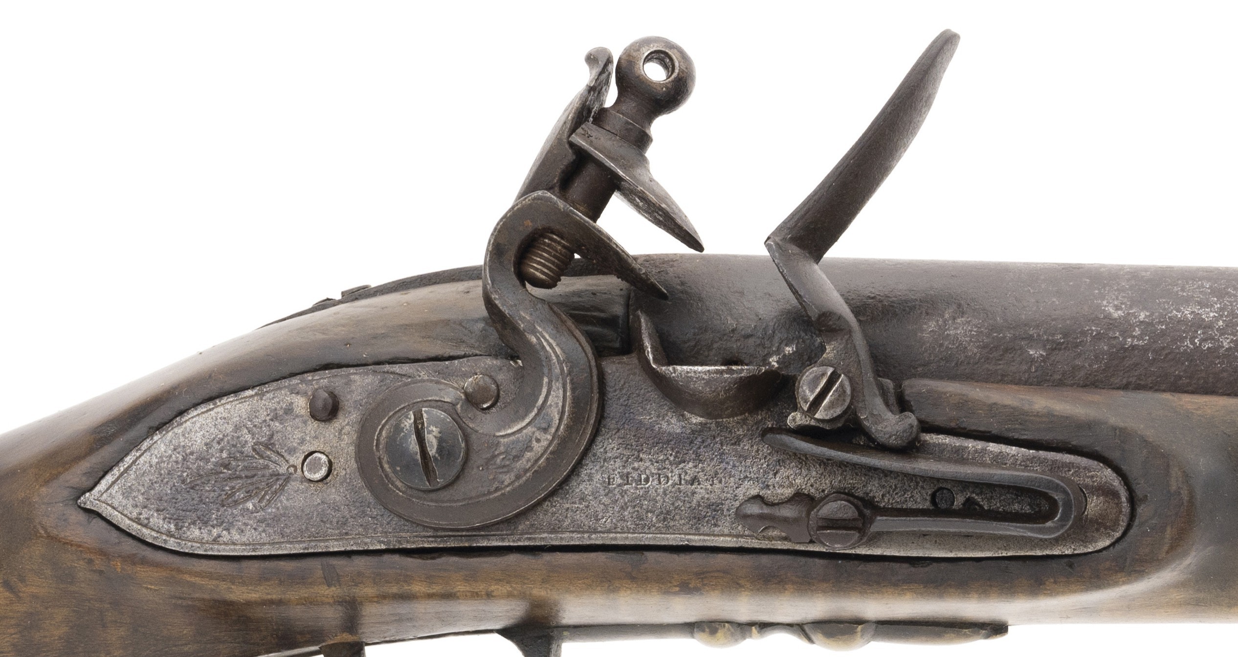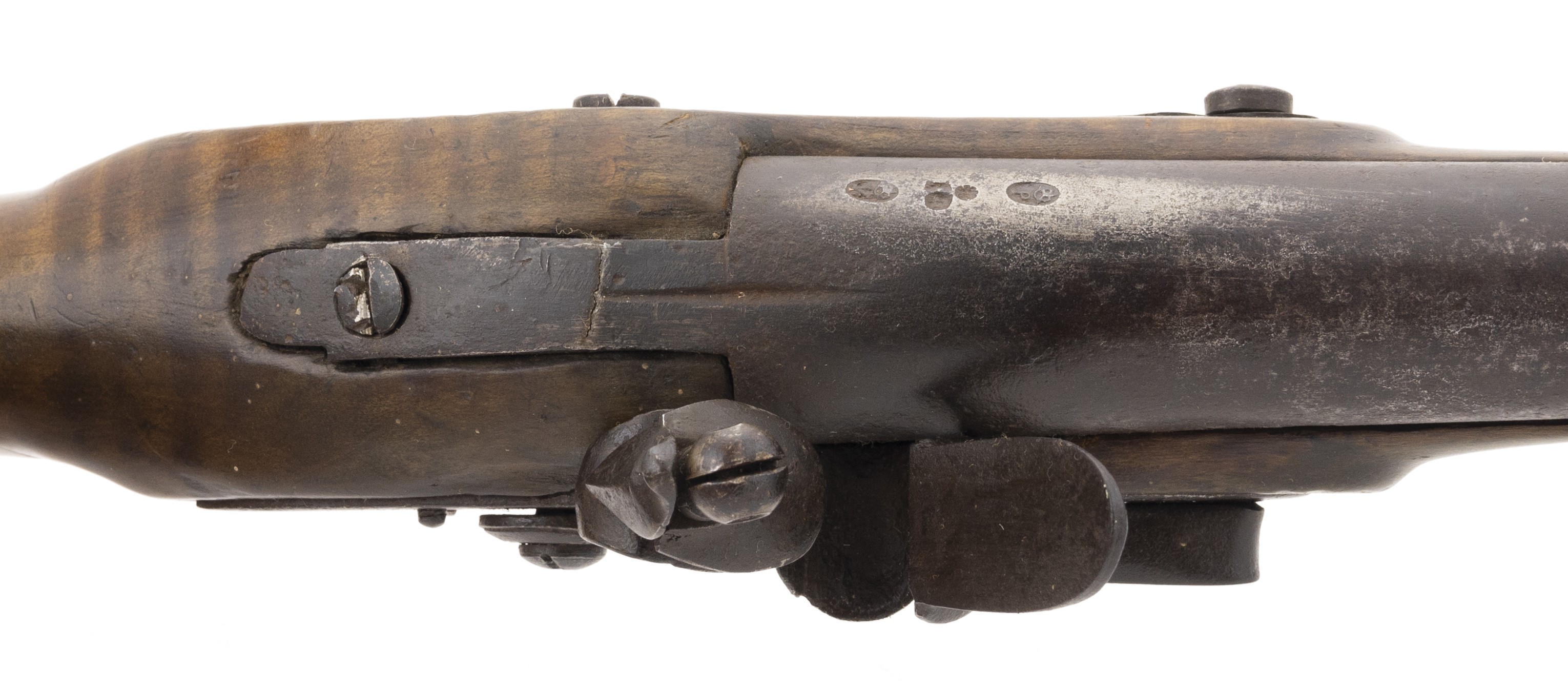 The lock is marked “Fiddian”. This full-stocked approximately .64 caliber fowling piece is 63½” long with a 47⅞” long barrel. All metal is good with areas of light pitting and a dark patina. The stock is good with some wood loss at the barrel tang and along the barrel. The lock, marked “Fiddian” at the center, has a border line and light engraving to the rear. The hammer is lightly engraved. The barrel has two proof marks. The four brass ramrod pipes, trigger guard, and butt plate are very good with a nice patina. The front trigger guard tang has the period raised acorn shape. The action functions correctly. This fowler would look great hanging over your fireplace! It is unusual to encounter one of these with the original full-length stock and barrel, most were shortened during use.