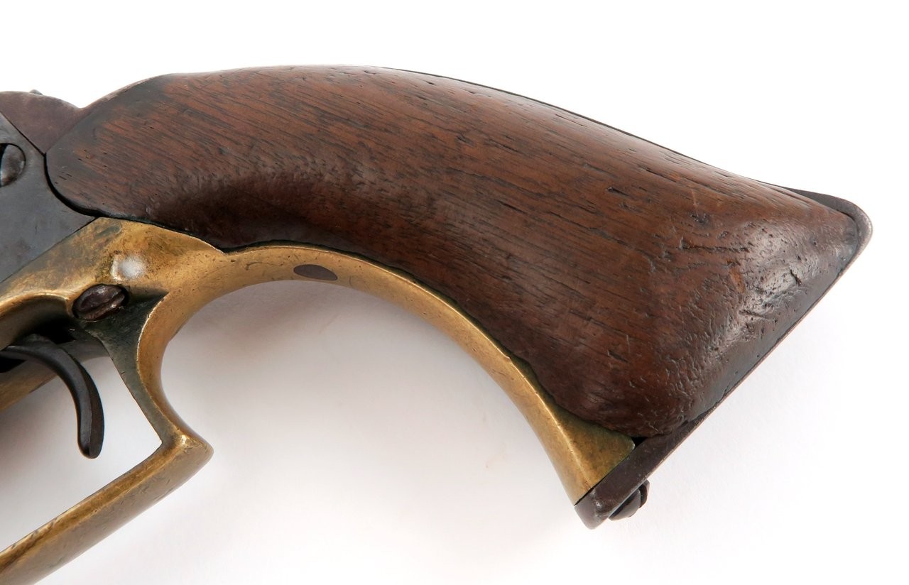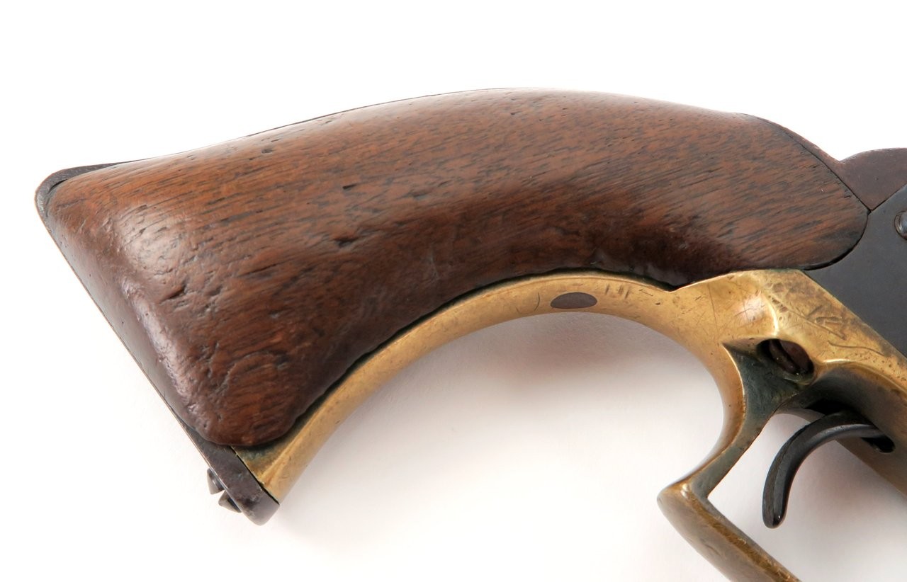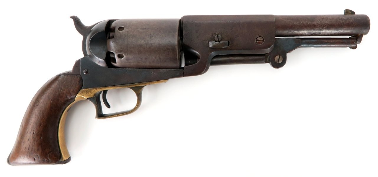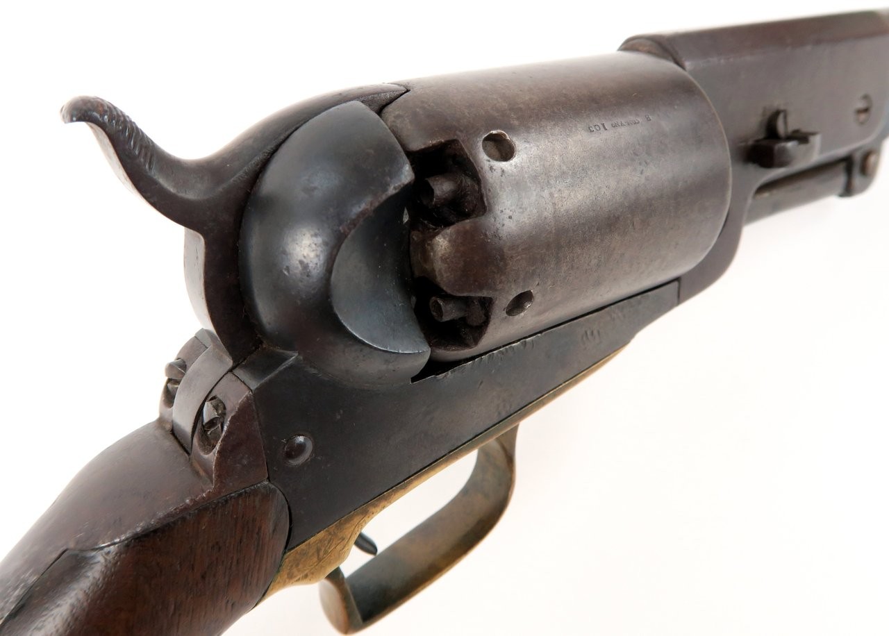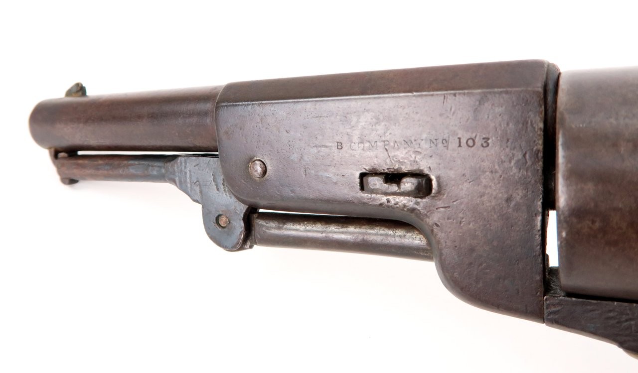 Colt 1847 Walker .44 caliber revolver. Made in 1847 with a 6⅝” barrel that was shortened from the original 9”. Gun is nice and sharp with a smooth brown patina on metal. The barrel and cylinder are number B Company 103 and the frame, trigger guard, and back strap are numbered to D Company 96. These are sometimes referred to as “Campfire” Walkers since these guns were mostly likely mismatched while soldiers were cleaning their guns around a campfire. The latch was replaced probably at the time of the barrel being shortened. It is original to the period of use. Grips are all original. Gun works perfectly. A very neat piece and fresh to the market. We recently purchased this gun from a California family.