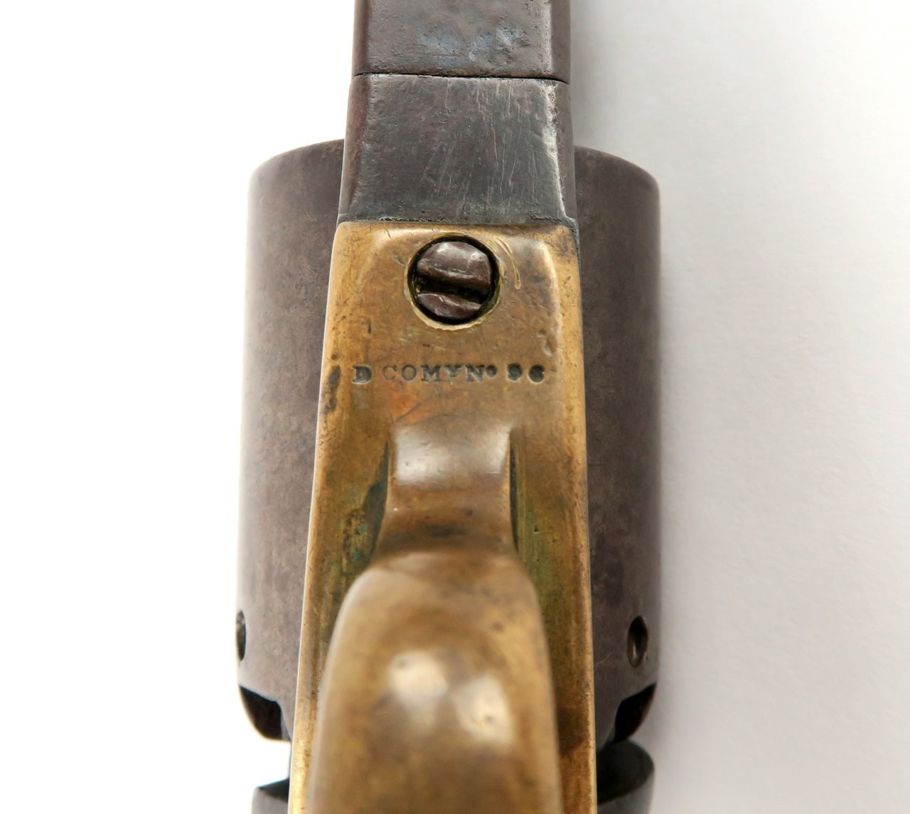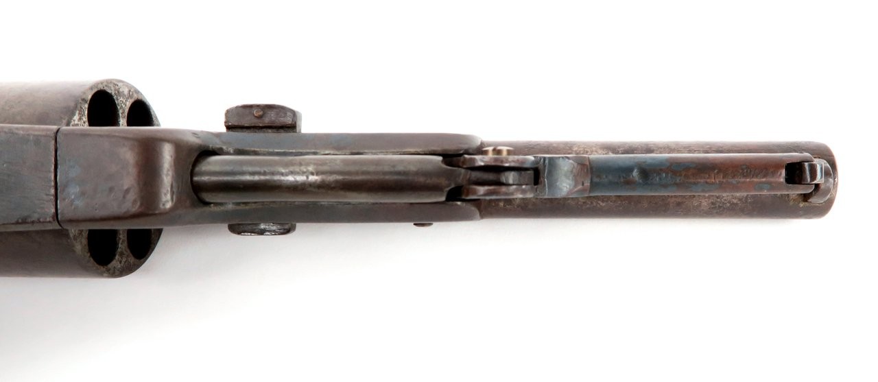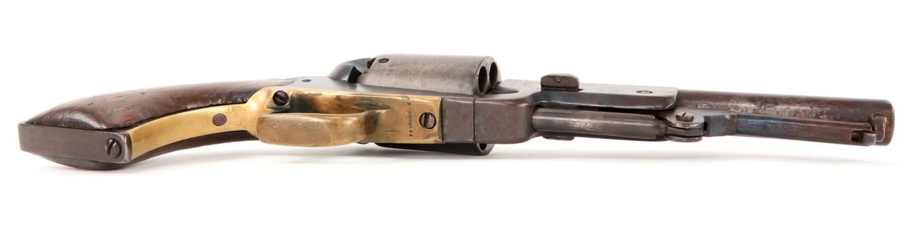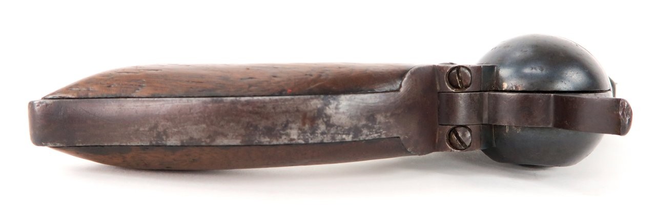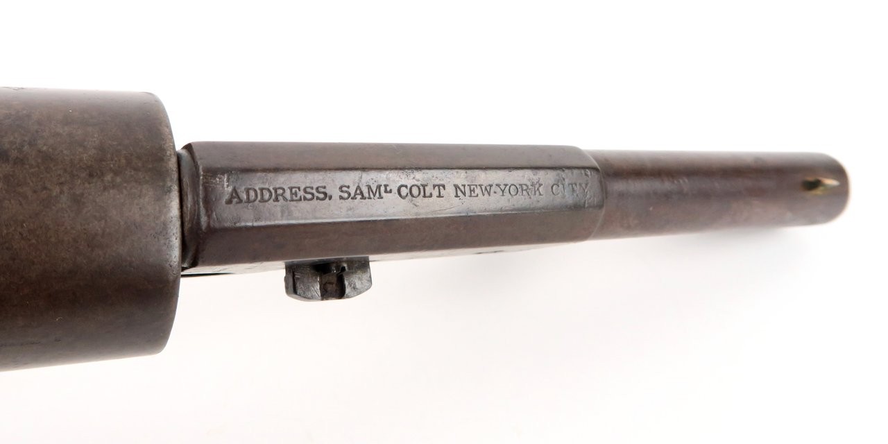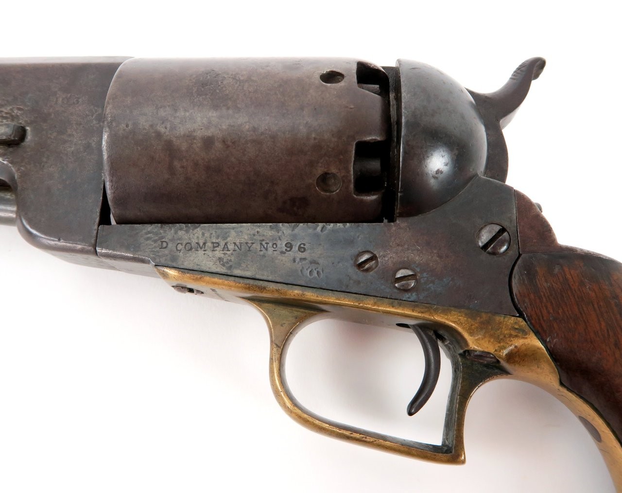 Colt 1847 Walker .44 caliber revolver. Made in 1847 with a 6⅝” barrel that was shortened from the original 9”. Gun is nice and sharp with a smooth brown patina on metal. The barrel and cylinder are number B Company 103 and the frame, trigger guard, and back strap are numbered to D Company 96. These are sometimes referred to as “Campfire” Walkers since these guns were mostly likely mismatched while soldiers were cleaning their guns around a campfire. The latch was replaced probably at the time of the barrel being shortened. It is original to the period of use. Grips are all original. Gun works perfectly. A very neat piece and fresh to the market. We recently purchased this gun from a California family.