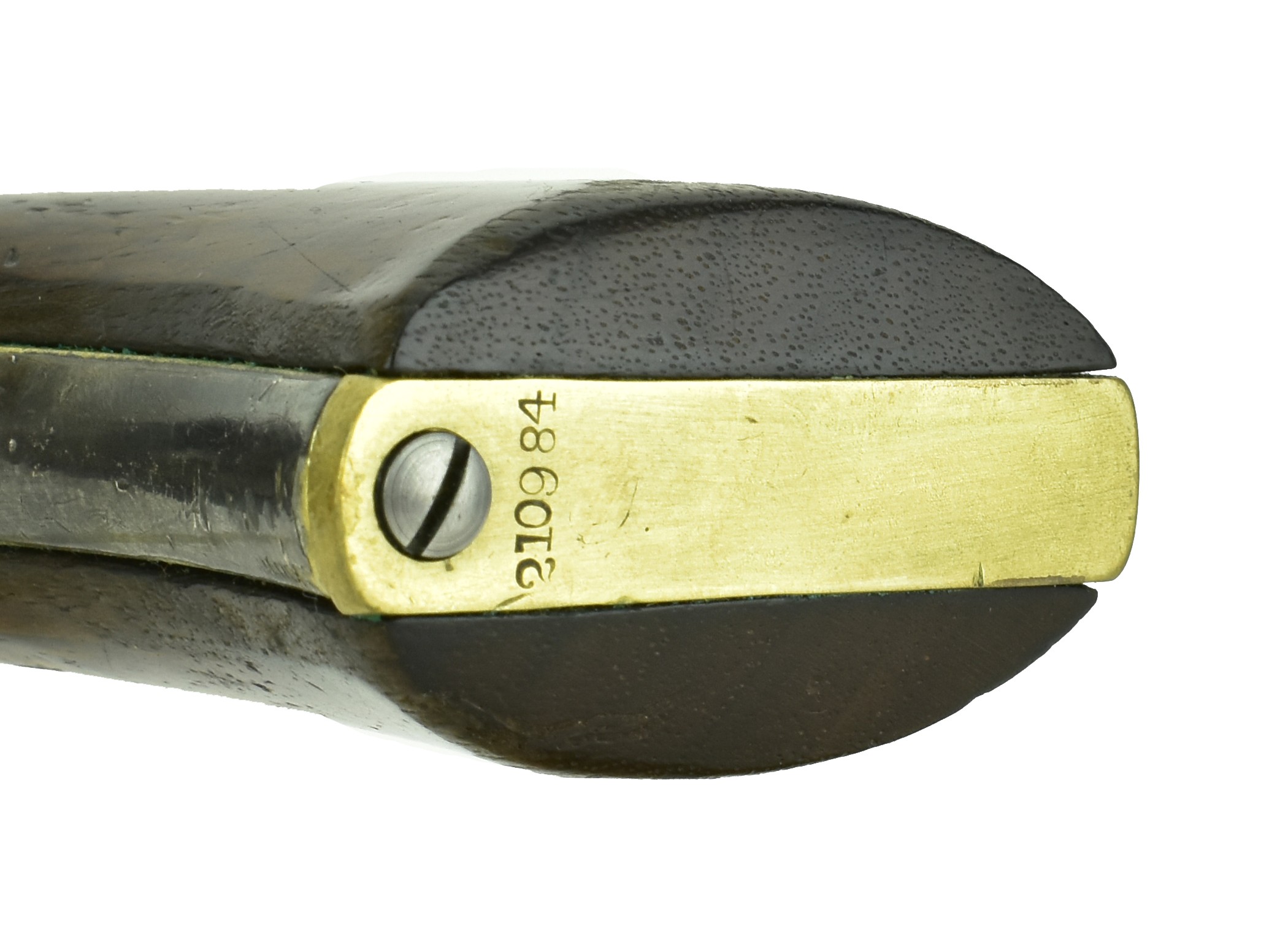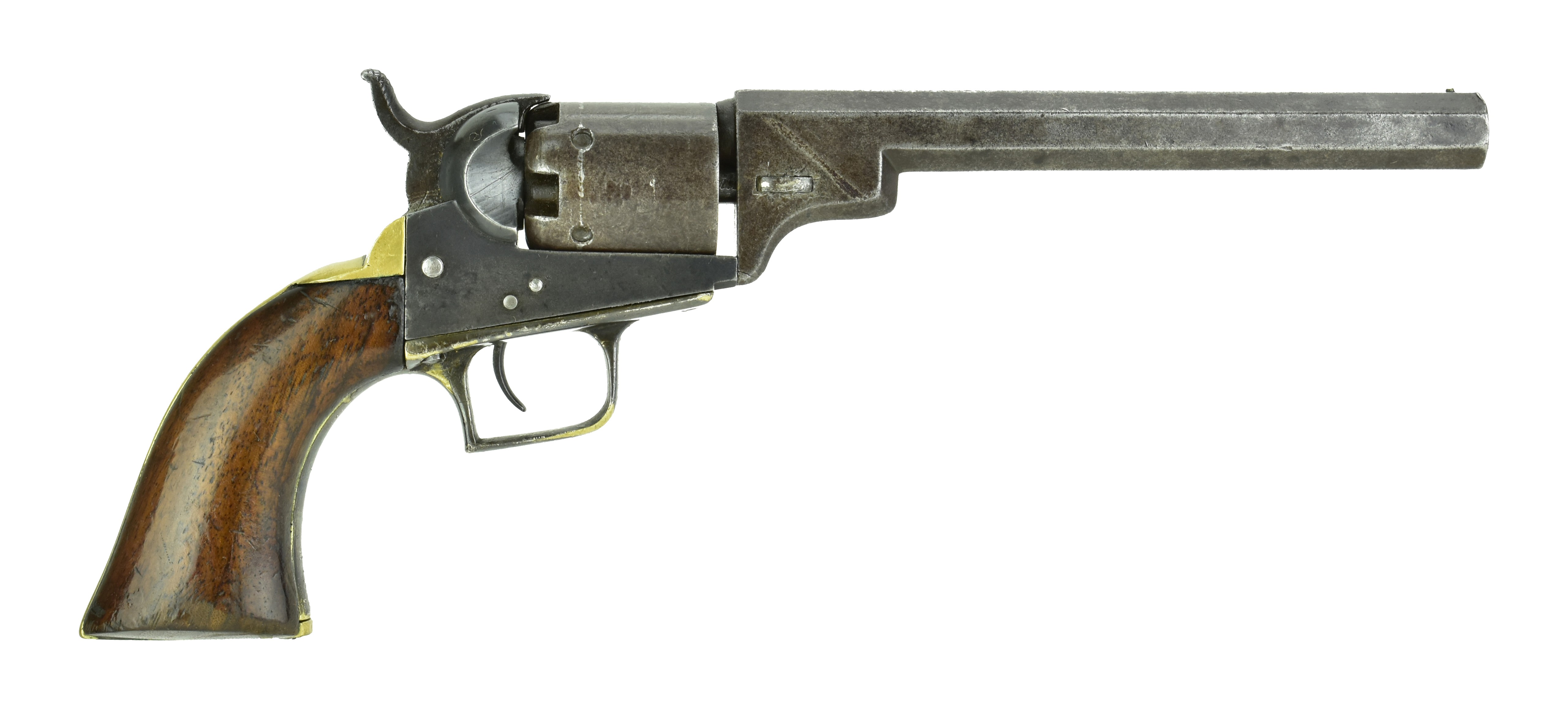 Colt 1848 Baby Dragoon. Made in 1848. .31 Caliber with 6” barrel. Nice even patina on metal. Cylinder scene is present, but faint. Trigger guard and backstrap are replacements.
