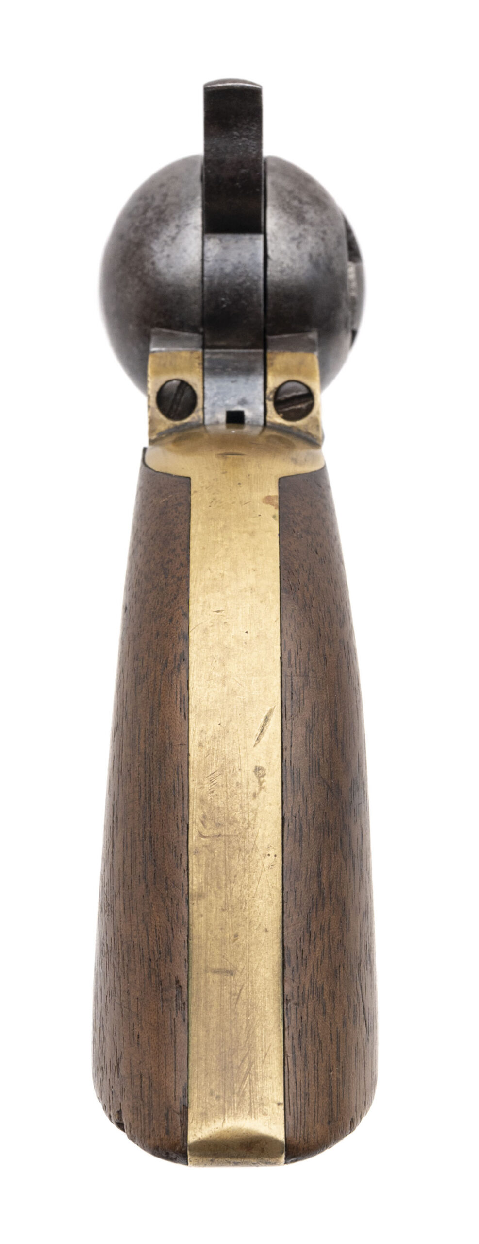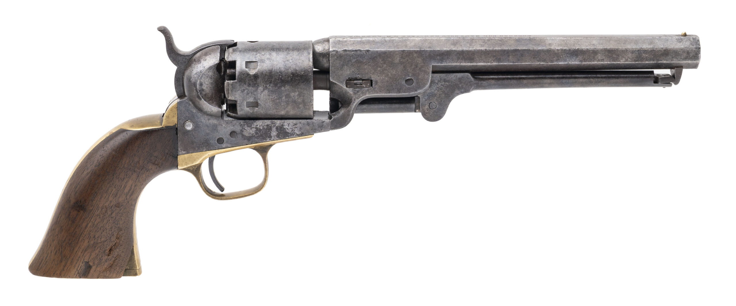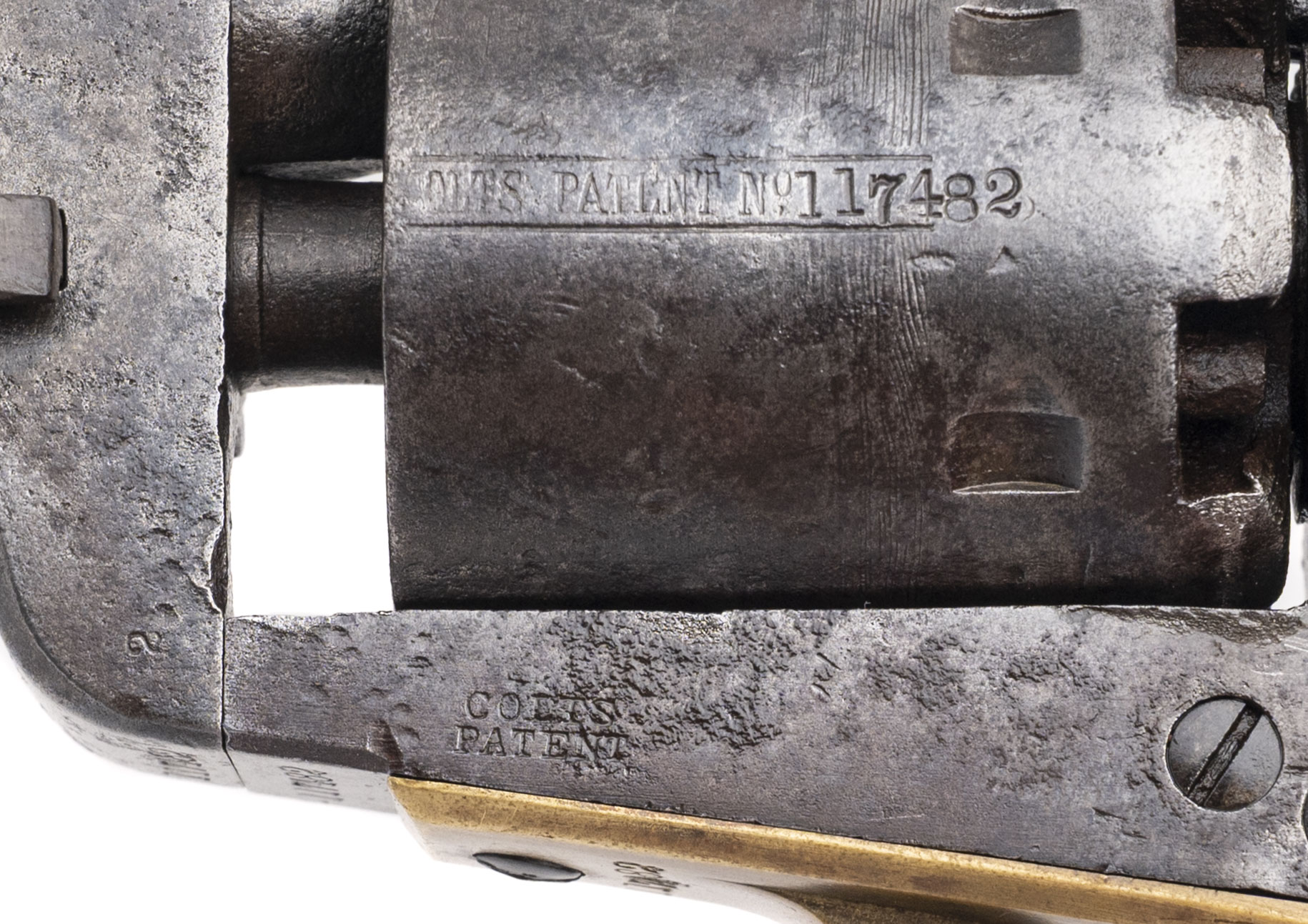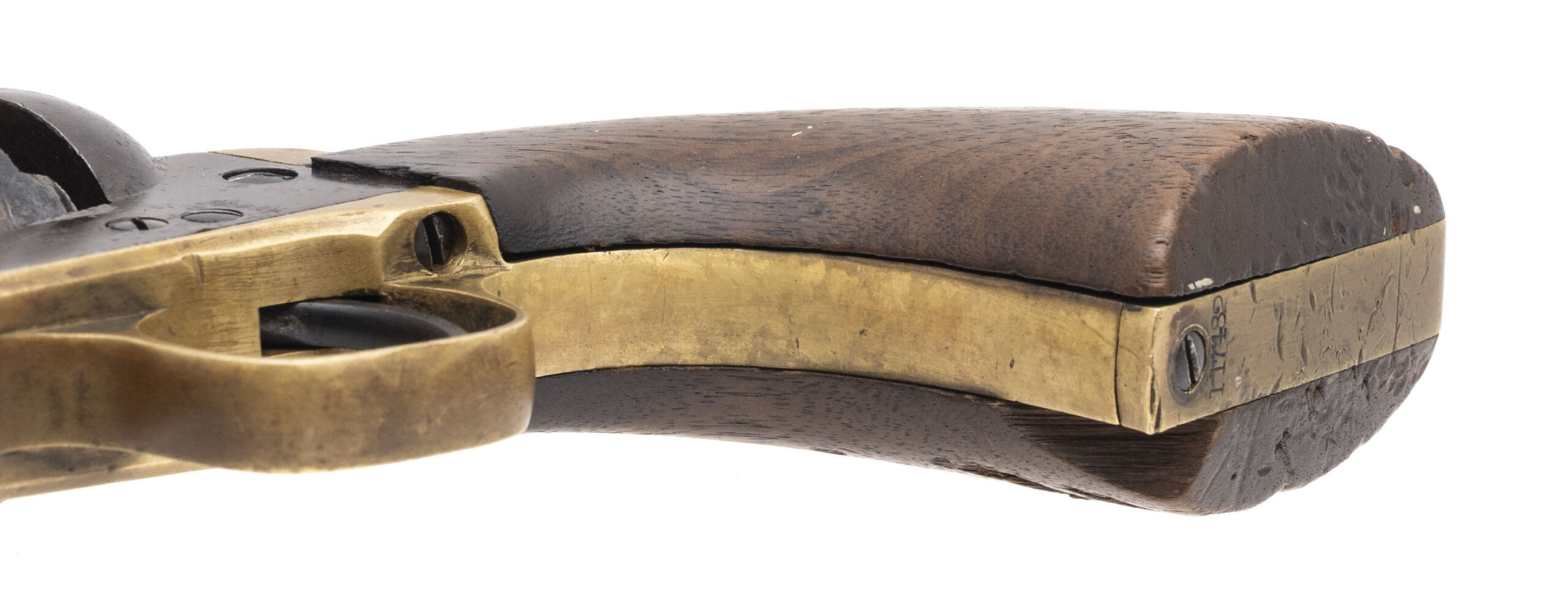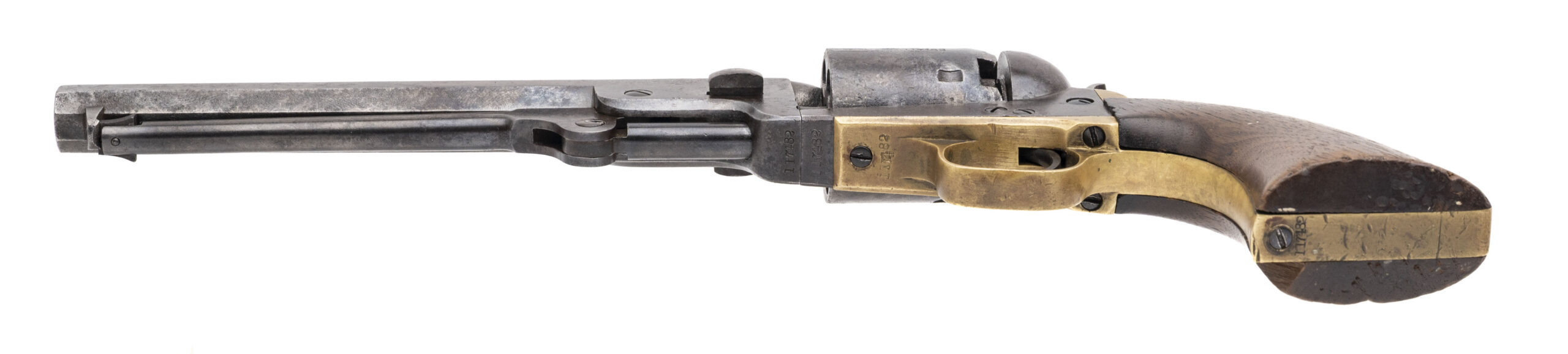 Serial number 117482. Made in 1861. 36 caliber with a 7.5” barrel. This gun has mottled dark gray patina with small pitting throughout. Traces of cylinder scene are visible. The wood grips are reasonably sharp with a chip out of the right hand corner of the toe. The barrel, frame and cylinder are all actually pretty sharp. This gun did not get all that much use, but was stored poorly. This gun was made right during 1861 when the Civil War started. There are no military markings, but most of these guns found their way into the hands of a soldier.