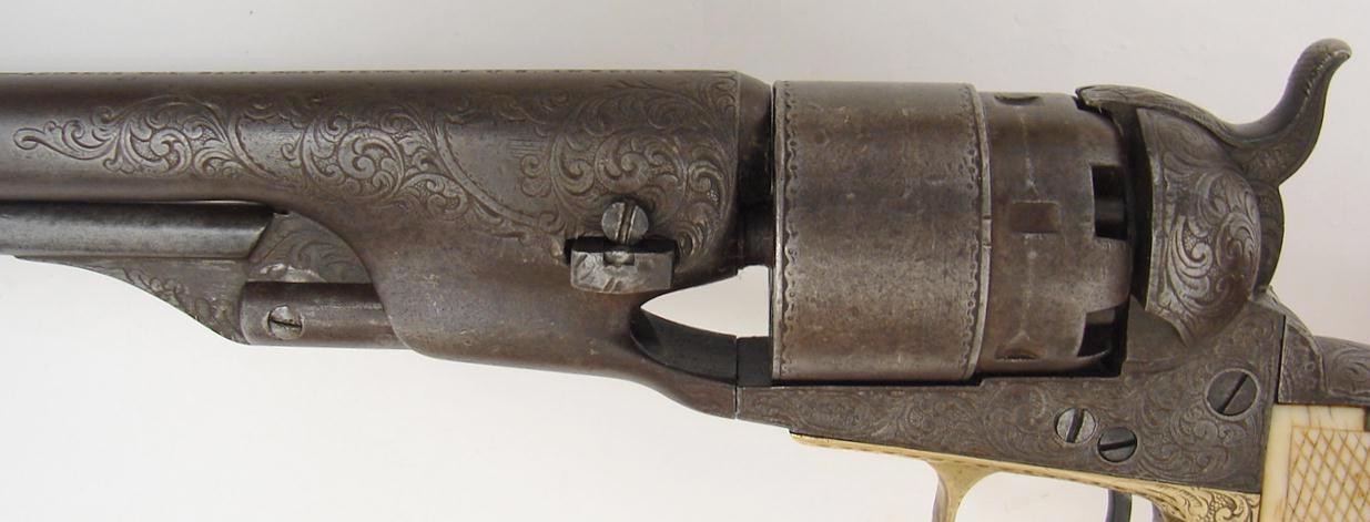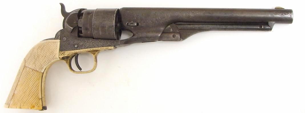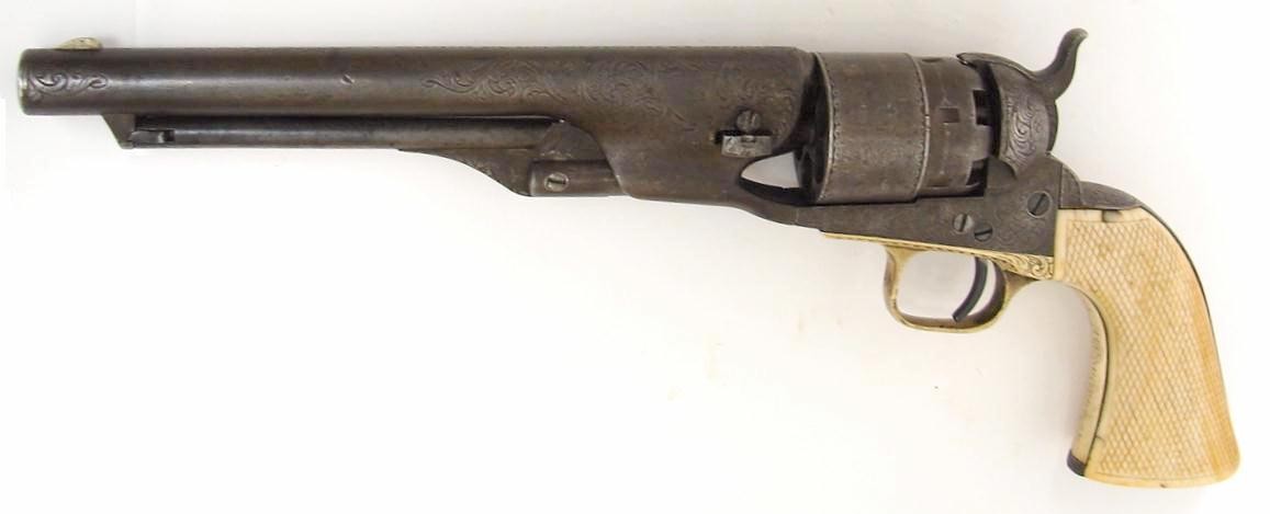 Colt 1860 Army deluxe factory engraved with checkered ivory name in fine script engraved on bottom of grip possibly ìG. Howardî. Extra grade engraving with coverage on cylinder, rammer and barrel. Fine engraved Army. First class engraving. Superior design and execution.