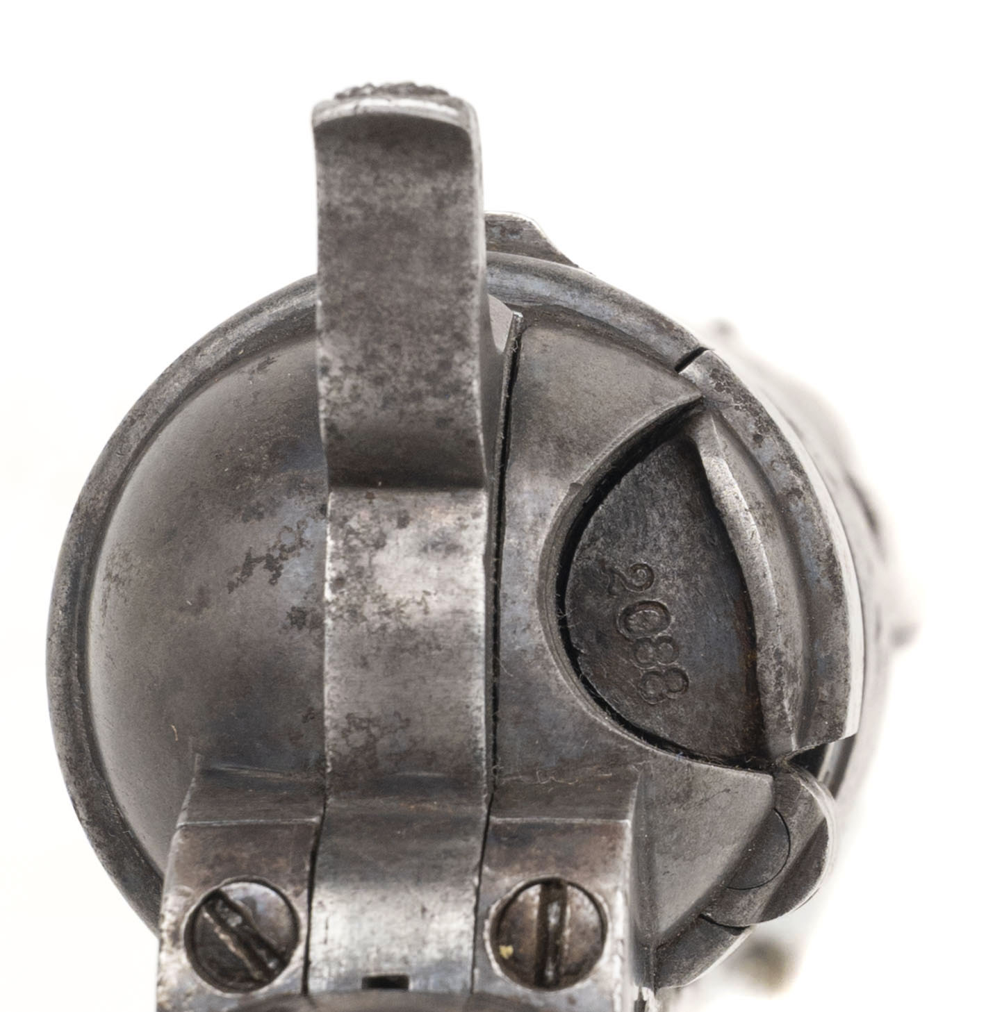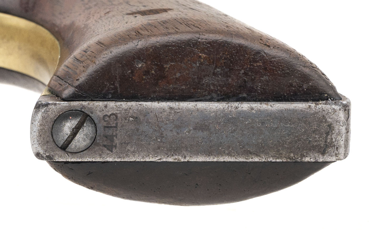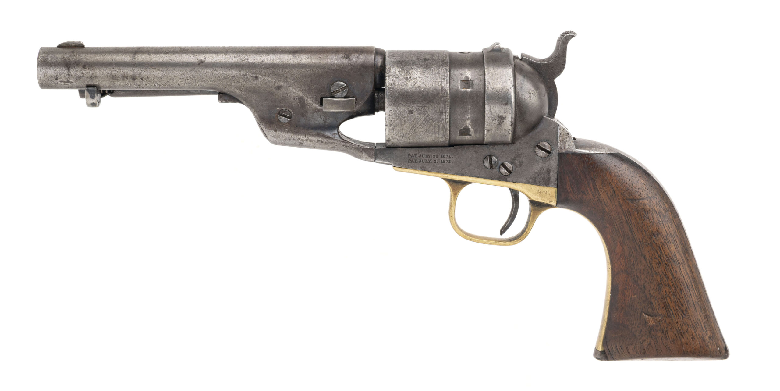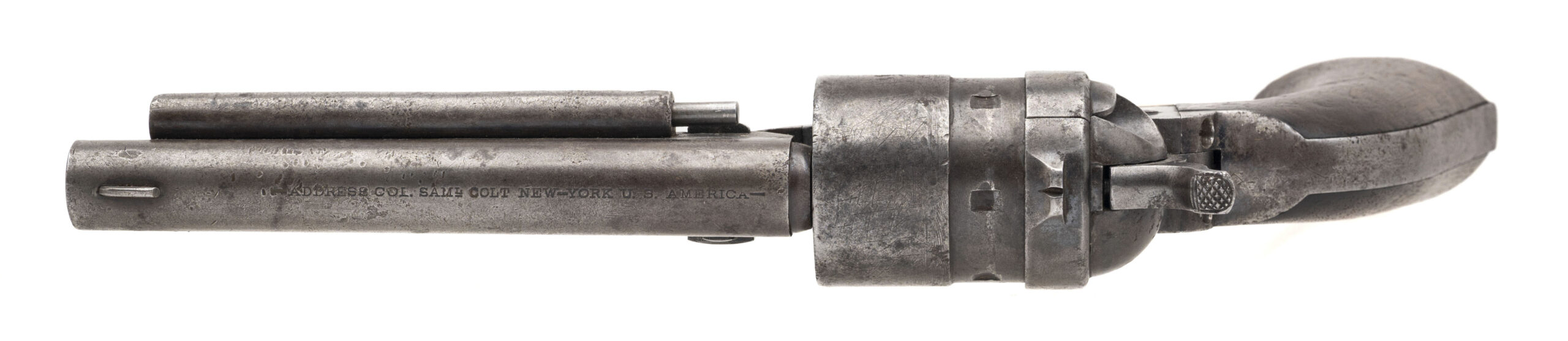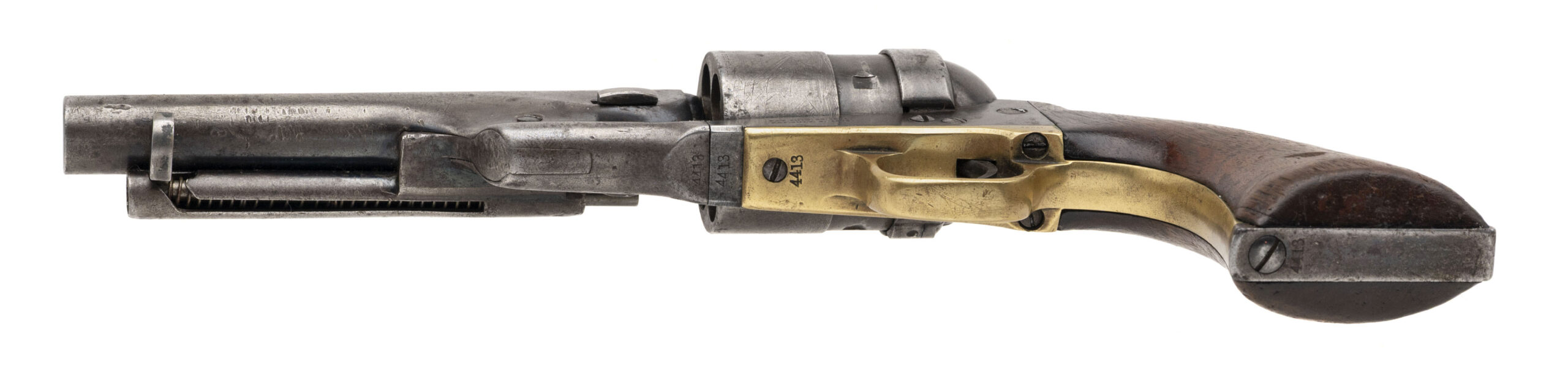 Serial number 4413. Made circa 1870s. 44 Colt Centerfire caliber with a 5.5” barrel. This is a sharp gun with an even dark gray patina. All markings are clear. The cylinder scene is still visible. The grips are very good. The barrel has been shortened.