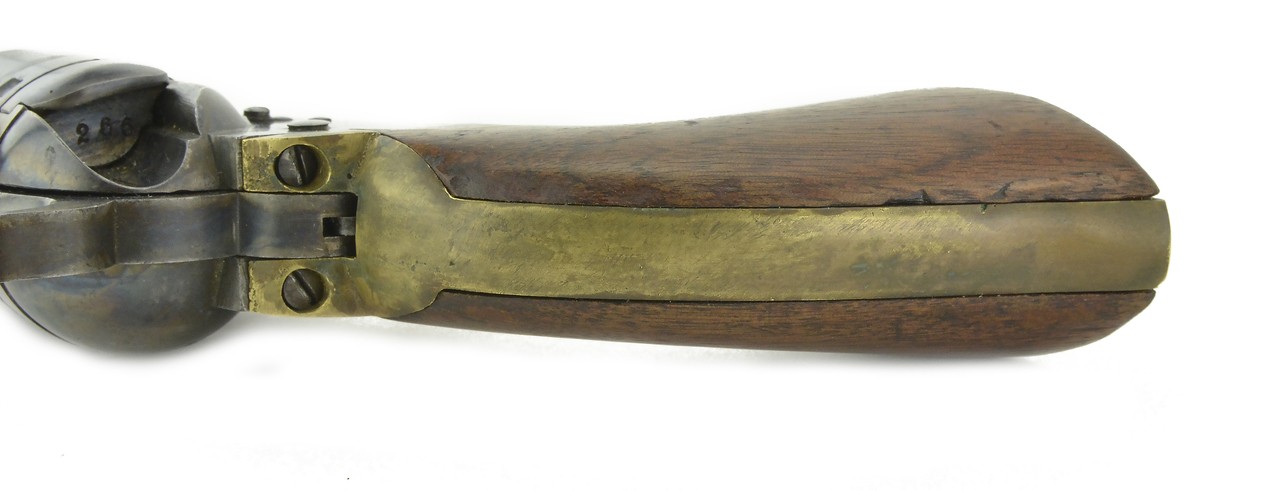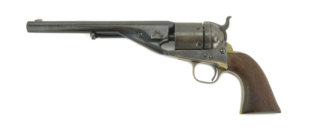 Colt 1861 Navy .36 caliber revolver. Converted after the Civil War to cartridge. Gun has 95% case colors and 95% blue (all done at the time of conversion). Action works perfectly. Note: All numbers match except the backstrap which is a later replacement with no serial number. Grips are very good and fit the backstrap very well. Bore is perfect. The barrel address is faint due to polishing by the factory at the time of conversion. This is a very fine 1861 Navy cartridge conversion!