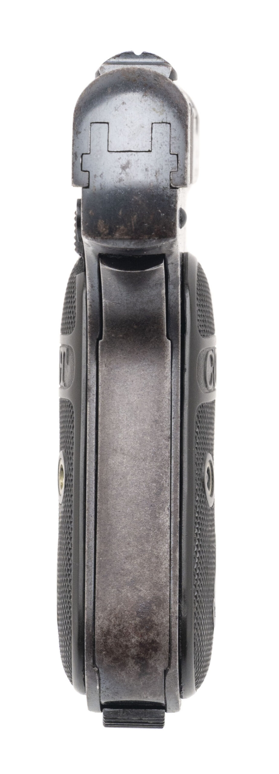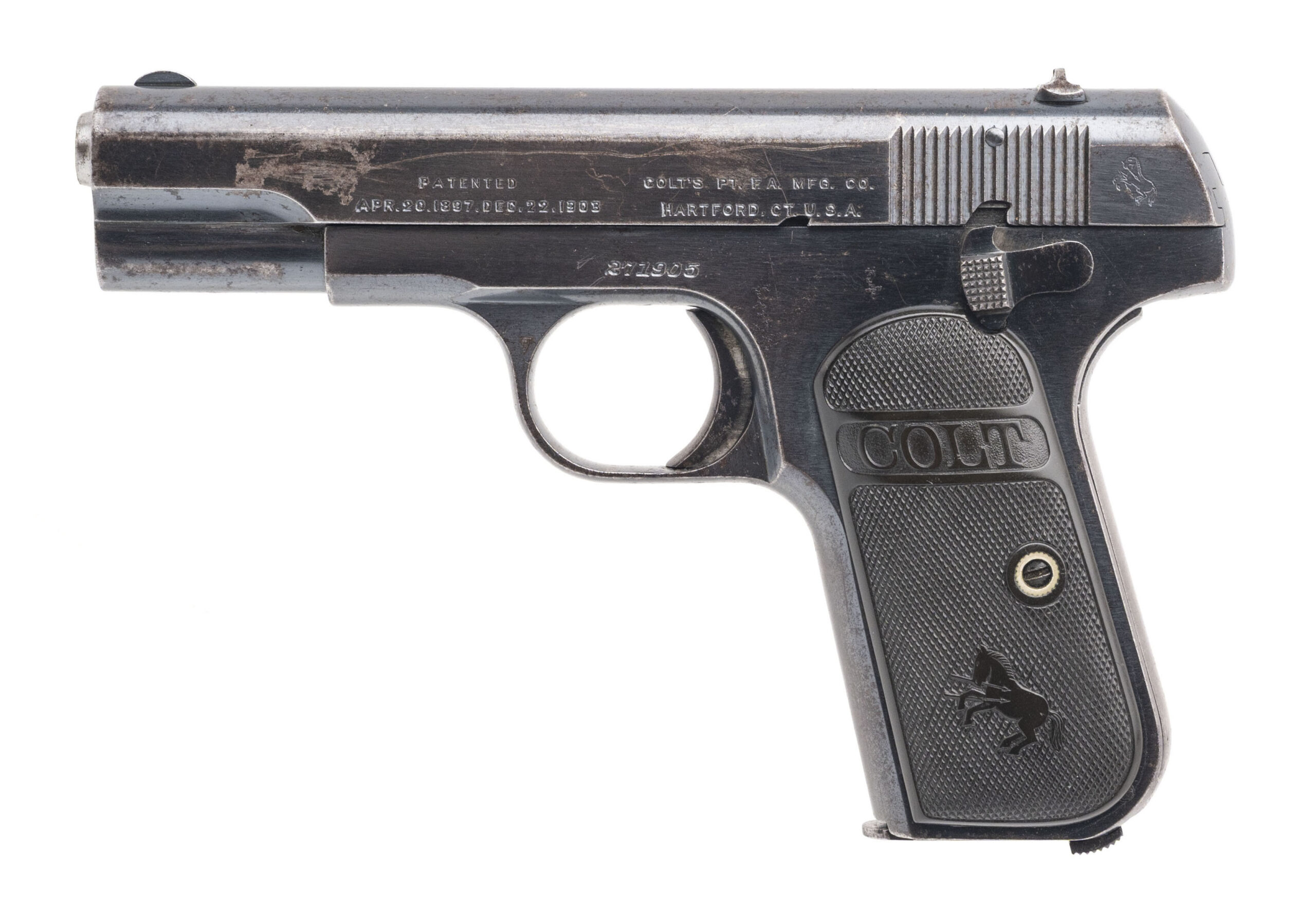 SN:271905. made in 1923. 32 ACP semi-auto hammerless pre-war pocket pistol with a 3.75” barrel, original grips and Colt marked magazine. Bluing has turned to an even patina throughout but action is smooth and works properly. Overall in good condition.(DALLAS LOCATION)