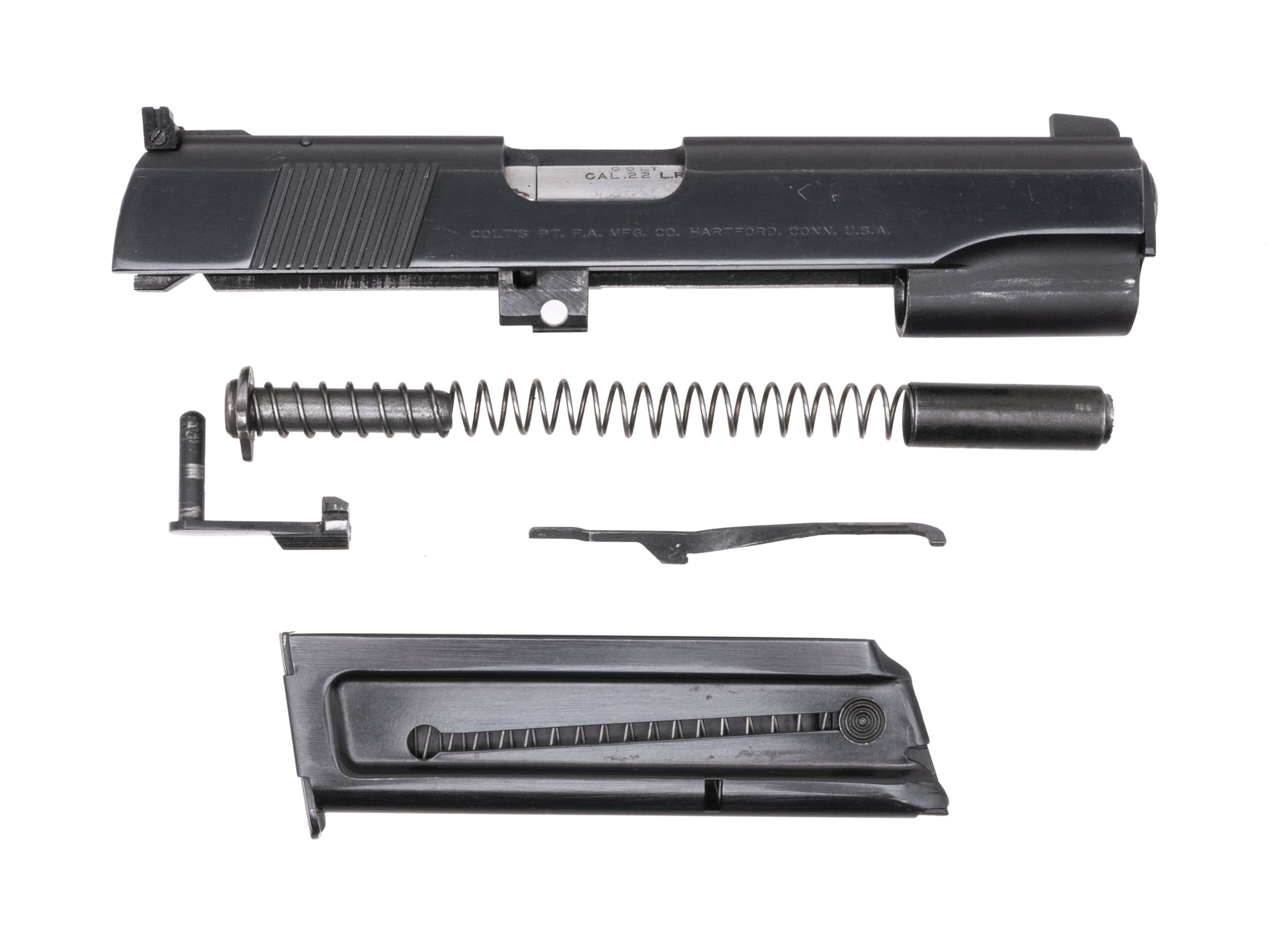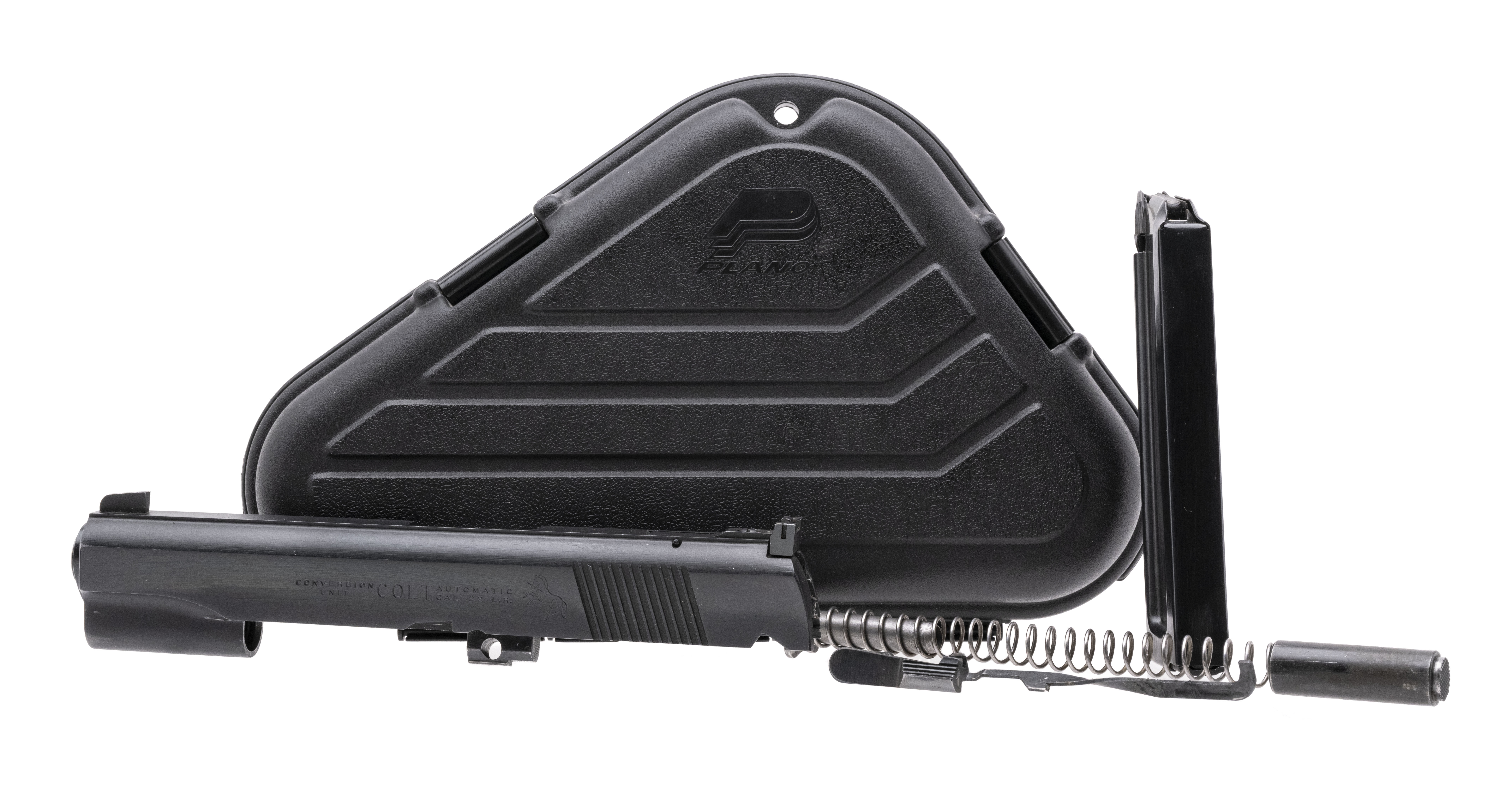 99% Original Blue Finish, 5'' barrel. Complete Colt .22LR Conversion Unit, Vintage Circa 1950s, In Very Good Condition with minor wear present along the slide. Bore is Mirror Bright with Excellent Rifling. Colt Government Model Conversion kit to .22LR.