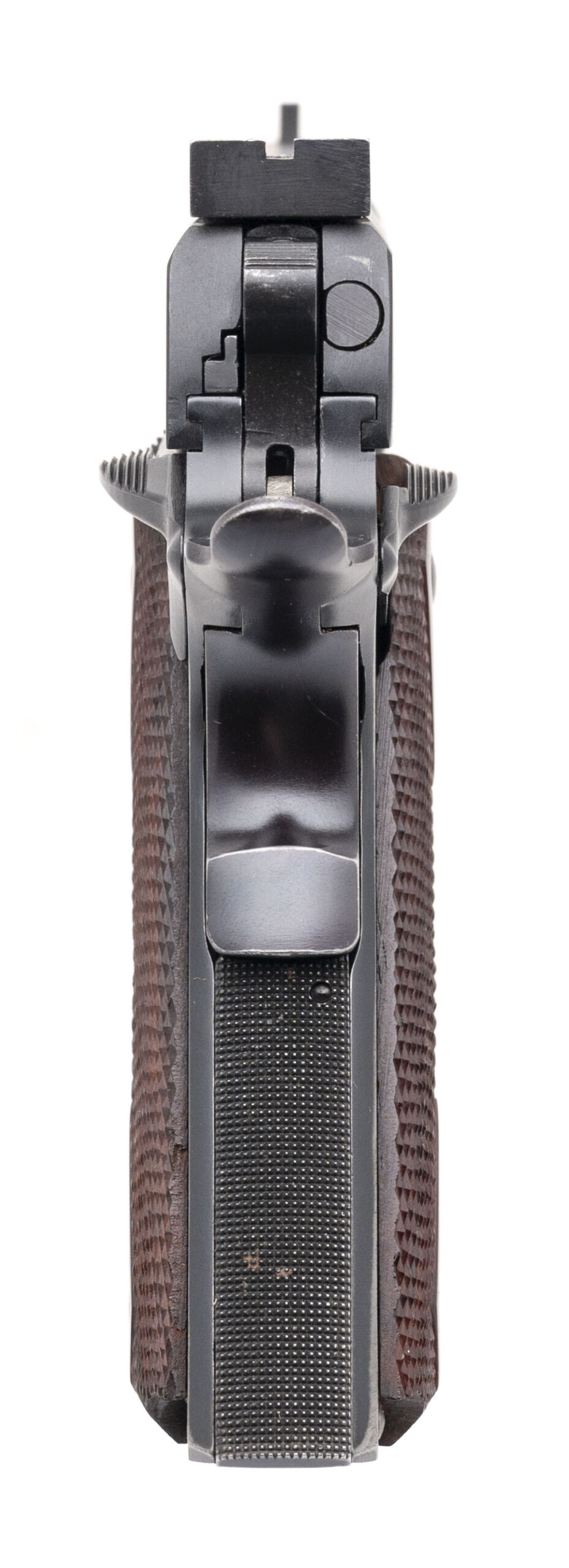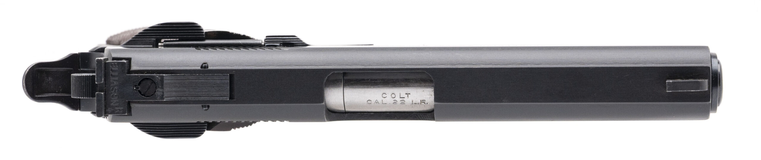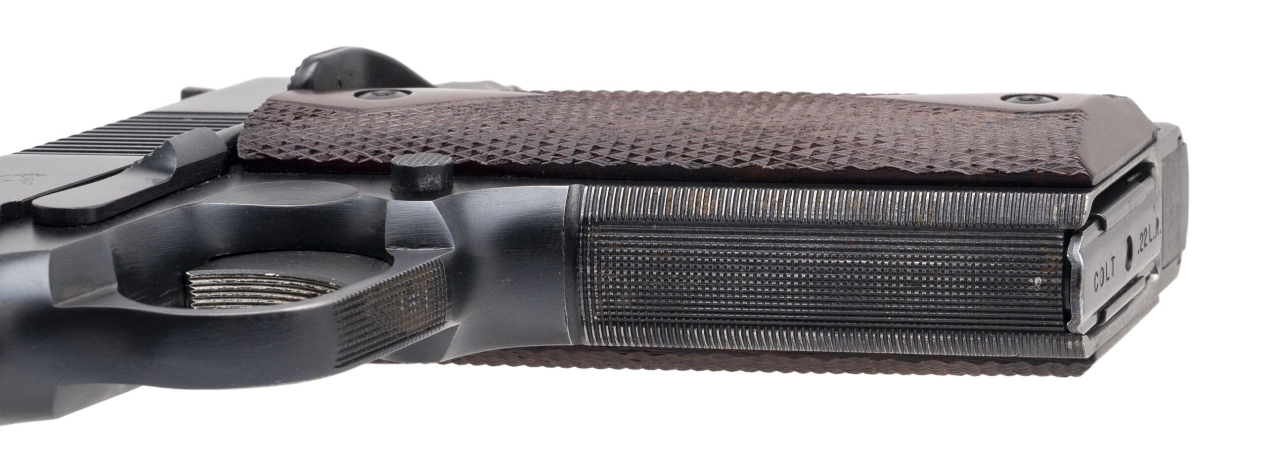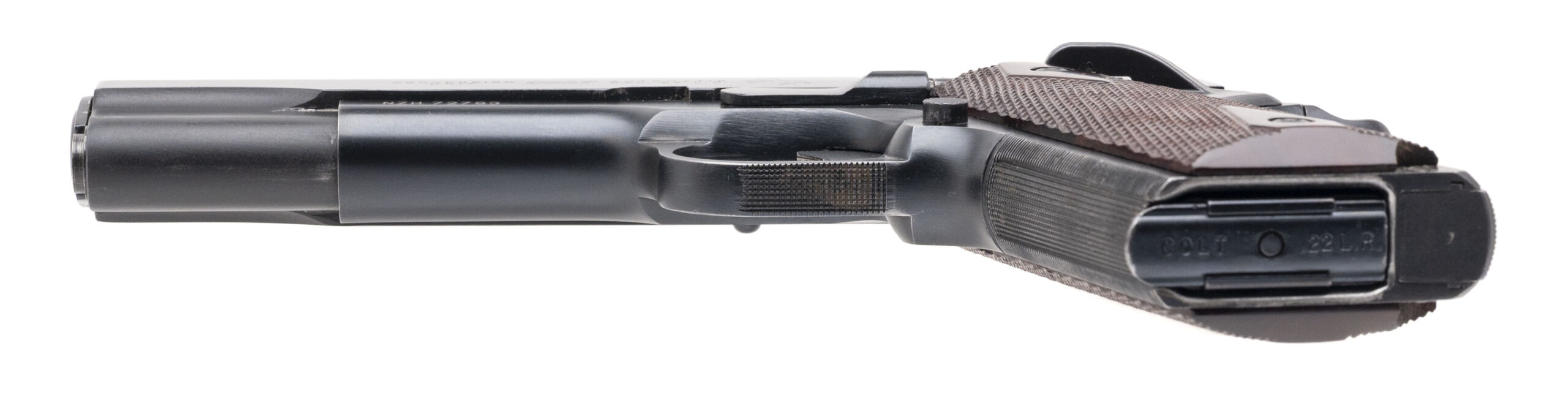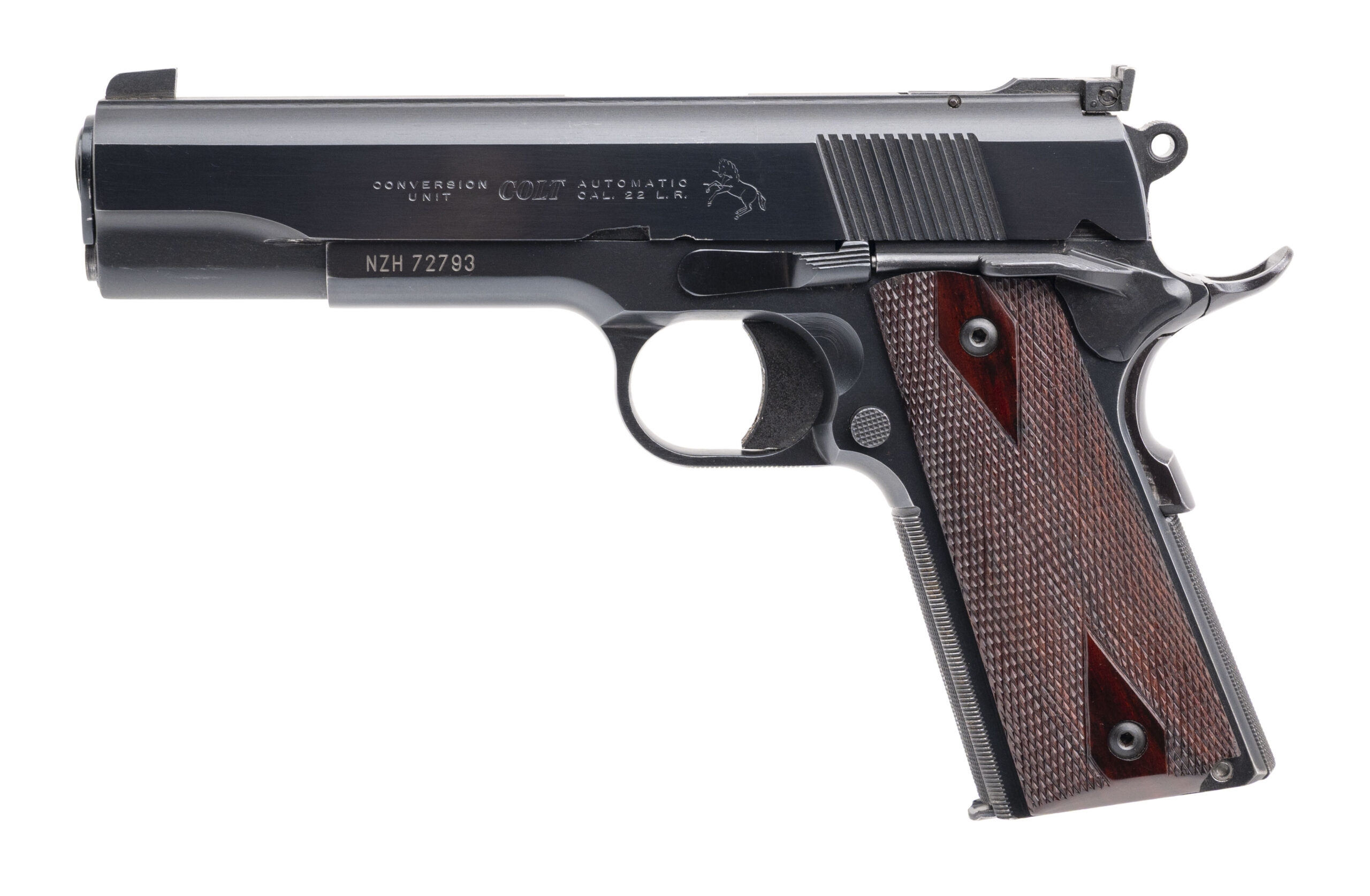SN: NZH72793. 1960s vintage, .22LR with a 5" barrel. Bore is very good. Colt Conversion Unit on an unmarked 1911 frame with an original Colt Conversion Unit magazine, Elliason adjustable rear sight, ambidextrous manual thumb-safety, blued finish, and checkered wood grips. Finish shows minor handling marks throughout. Overall condition is very good.