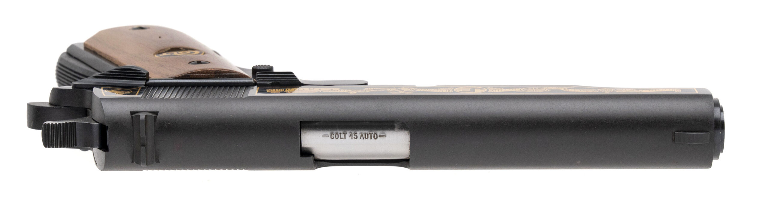 SN: JF0255, modern production commemorative 1911 in 45 acp with a 5" barrel, blued finish with gold inlay and walnut medallion grips . This is one of 300 made as a tribute to Medal of Honor recipient Joe Foss. Overall condition is excellent, comes in commemorative case. Dallas Location