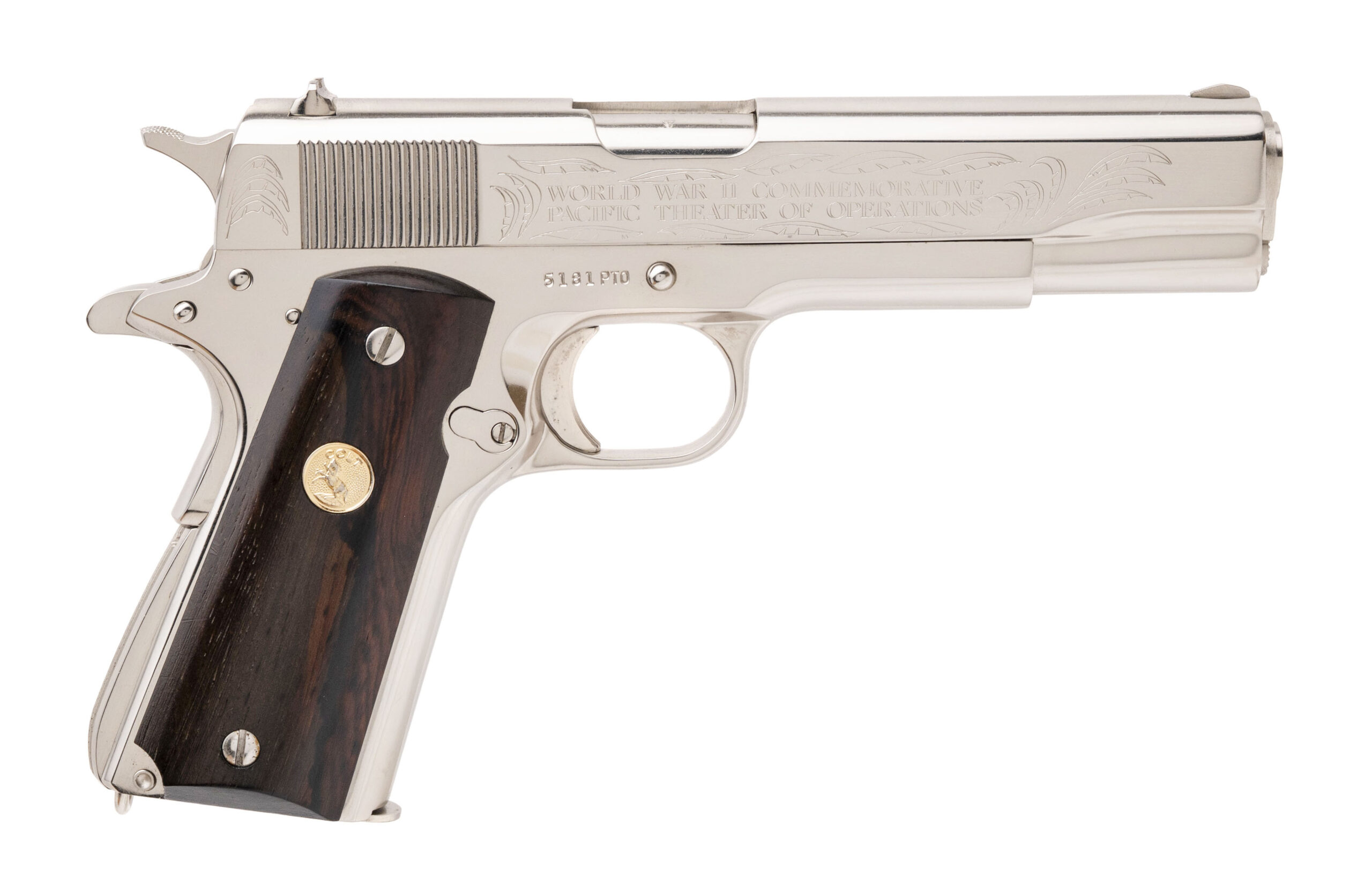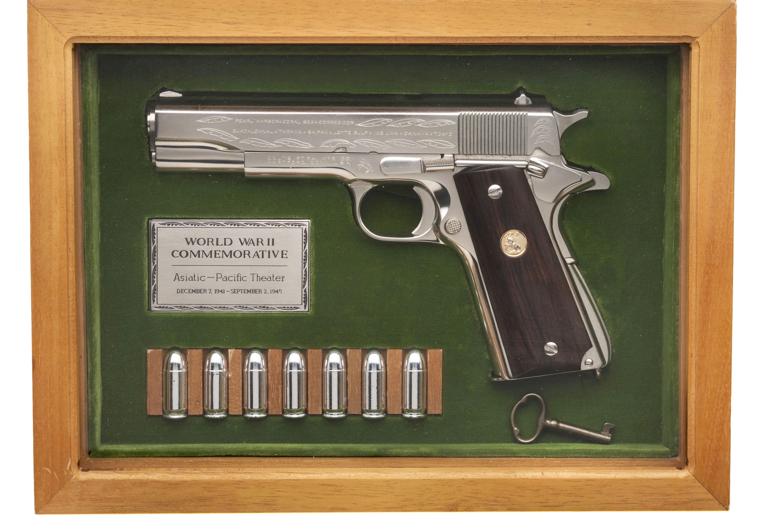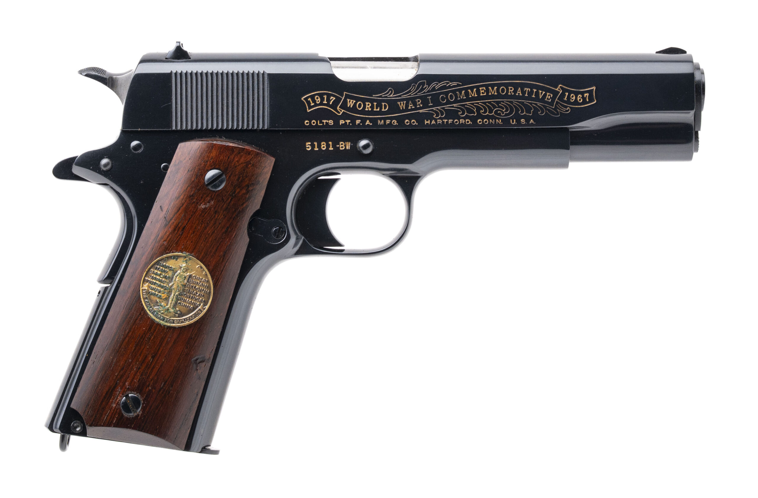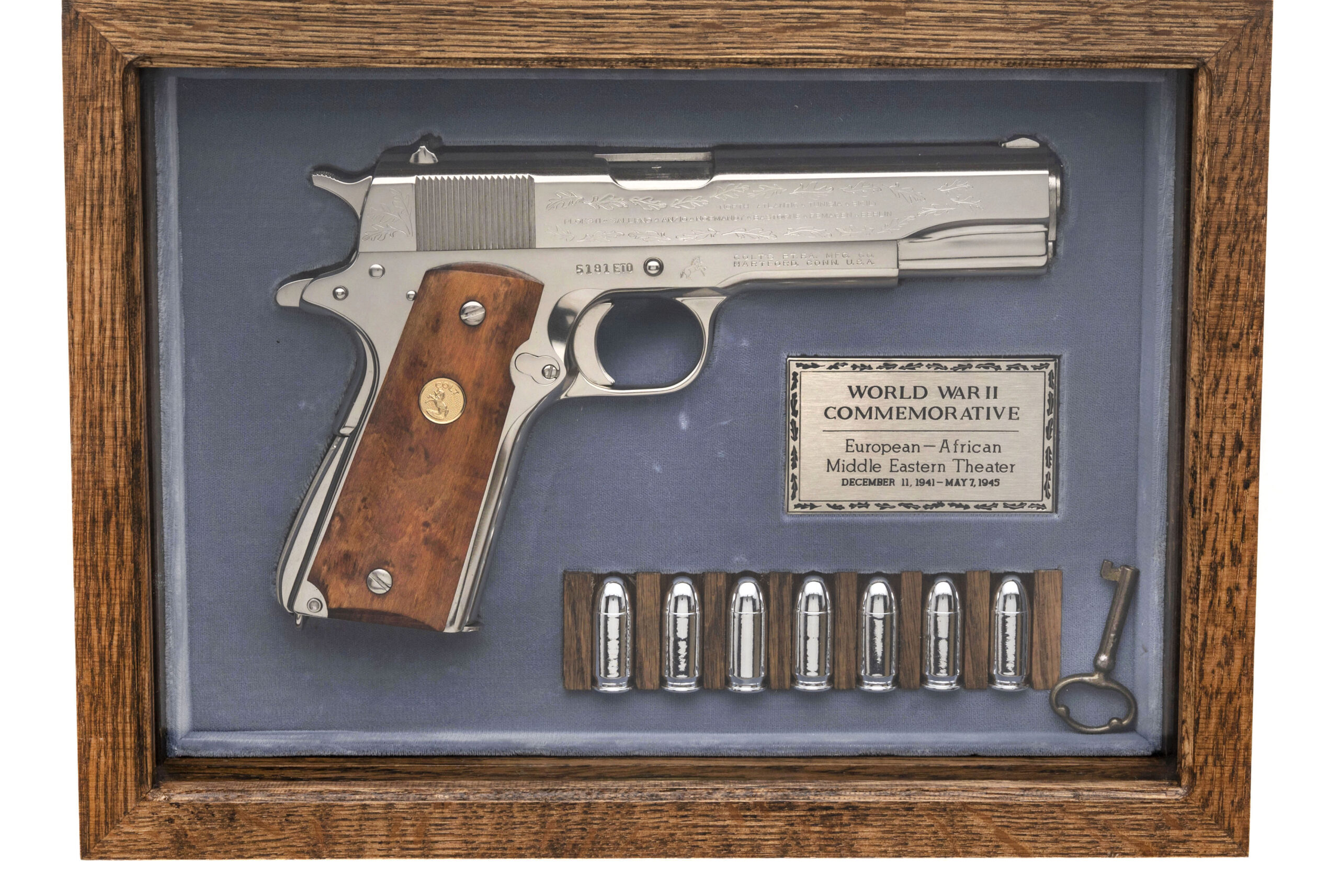 SN: 5181-CT, 5181-BW, 5181-MA, 5181-M2, 5181ETO, 5181PTO. Rare 6 gun commemorative set of 1911 pistols with matching numbers. These guns were produced over a period from 1967 to 1970 and the collector had to sign up to be able to receive the matching number guns as they were produced. Very few complete sets exist, making this a very desirable set for the Colt collector. The guns in the set are: