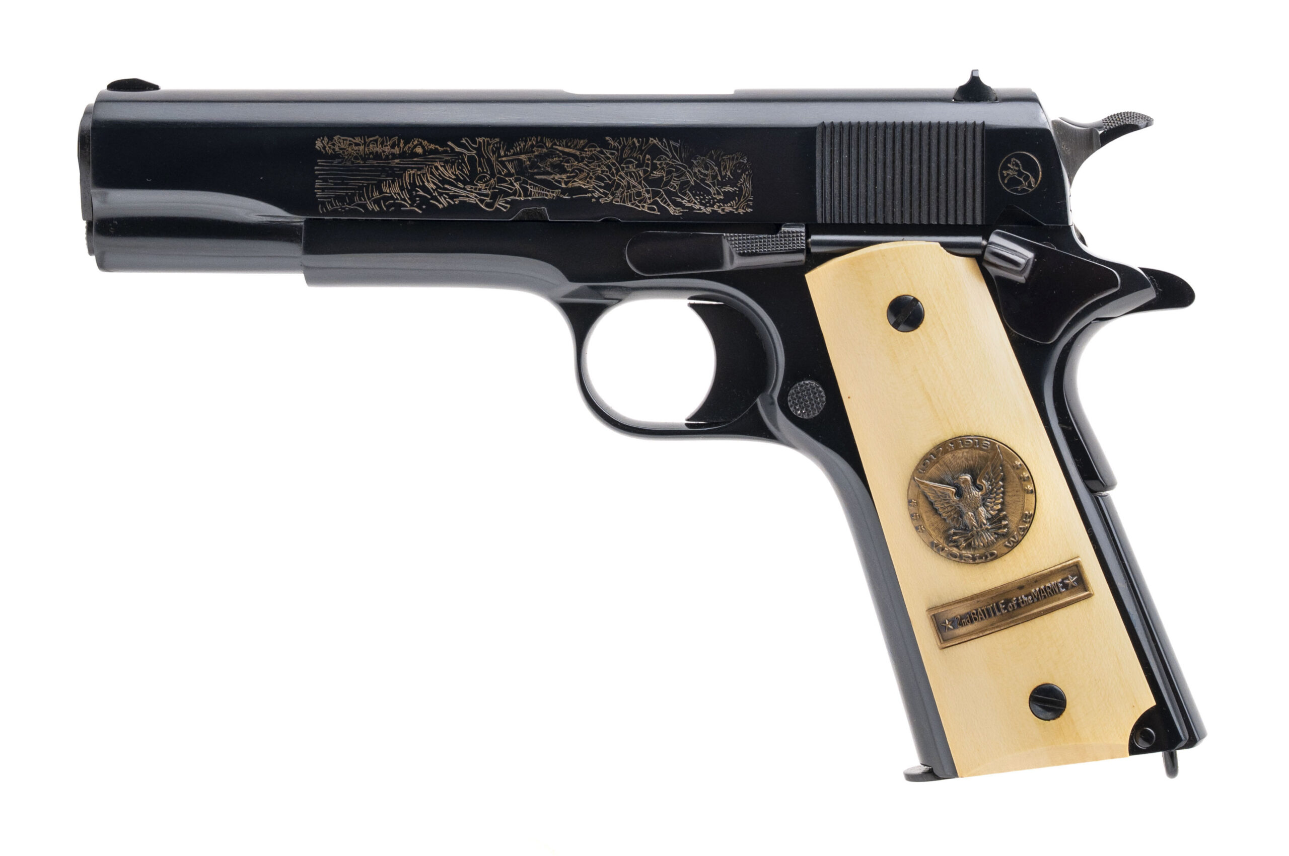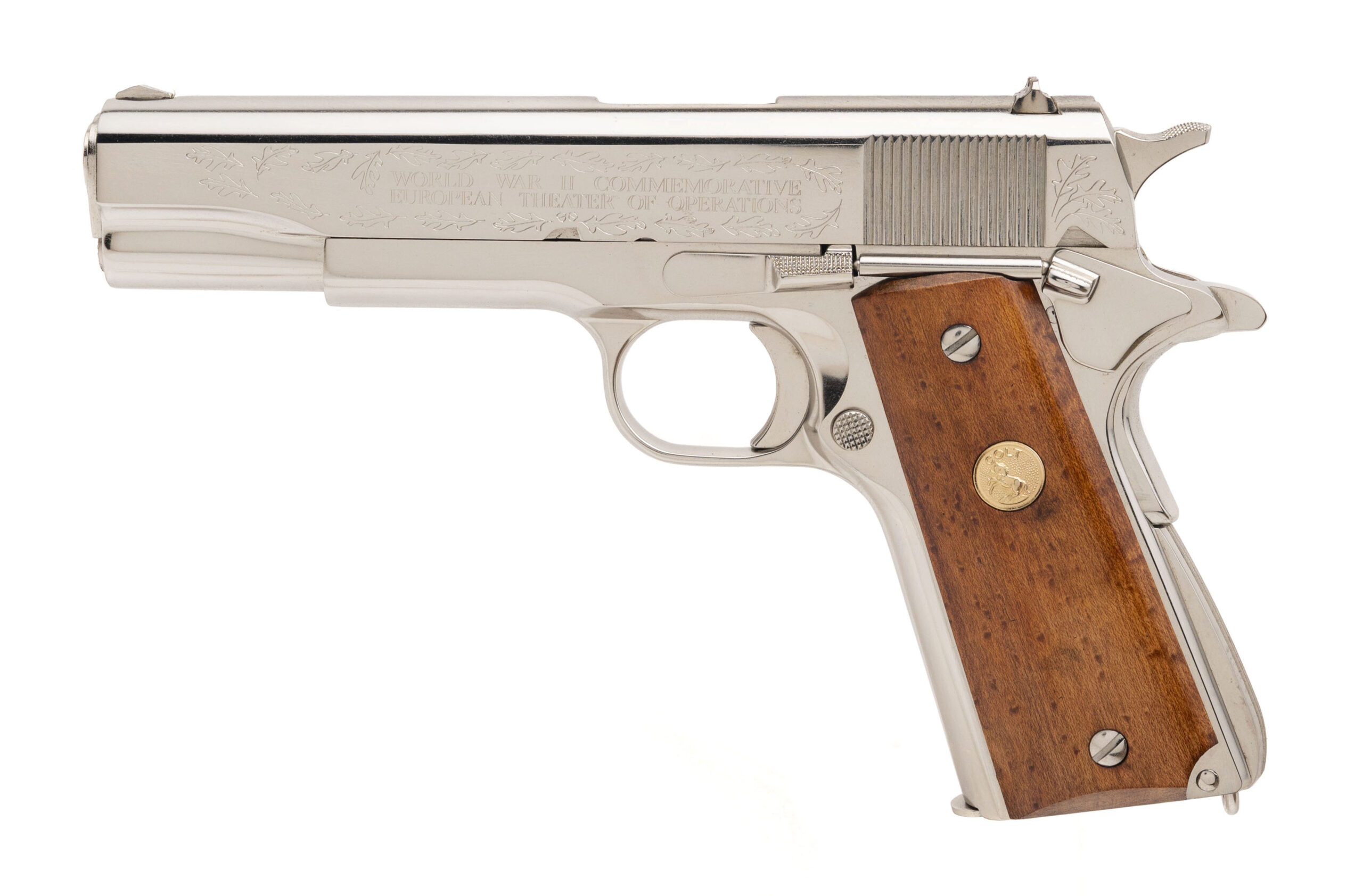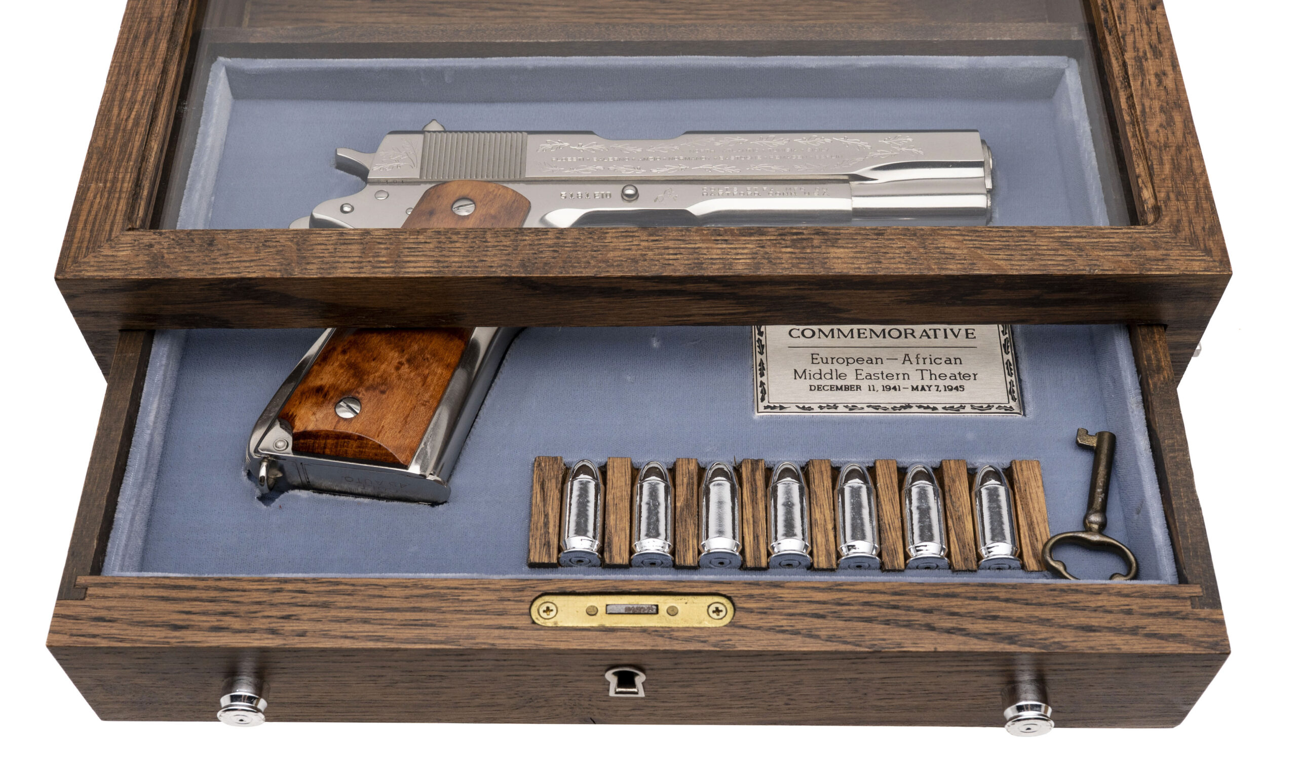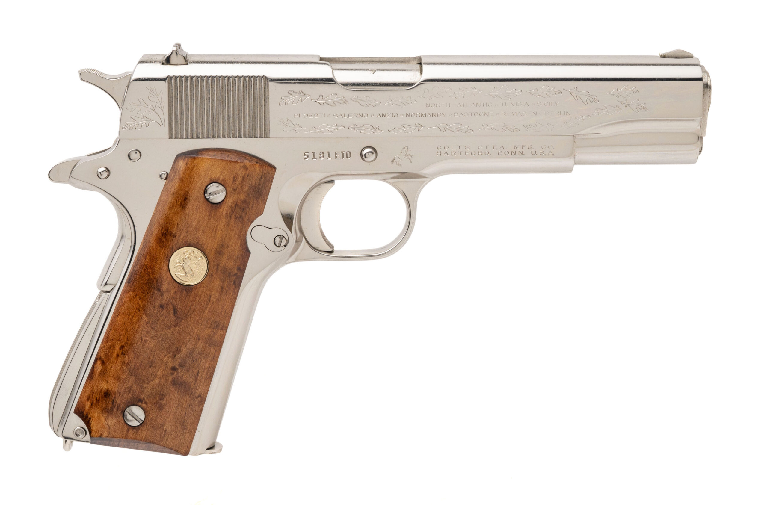 SN: 5181-CT, 5181-BW, 5181-MA, 5181-M2, 5181ETO, 5181PTO. Rare 6 gun commemorative set of 1911 pistols with matching numbers. These guns were produced over a period from 1967 to 1970 and the collector had to sign up to be able to receive the matching number guns as they were produced. Very few complete sets exist, making this a very desirable set for the Colt collector. The guns in the set are:
