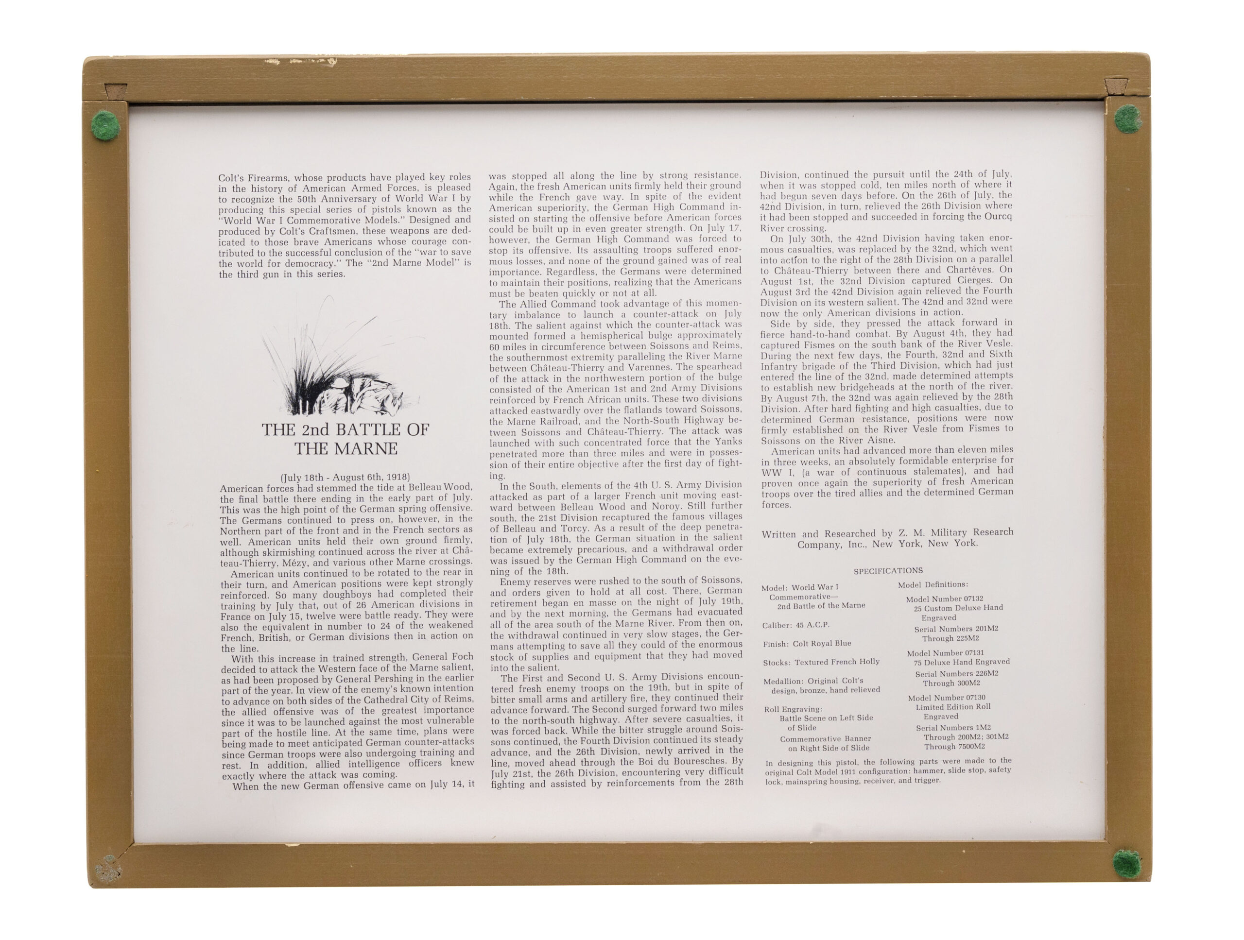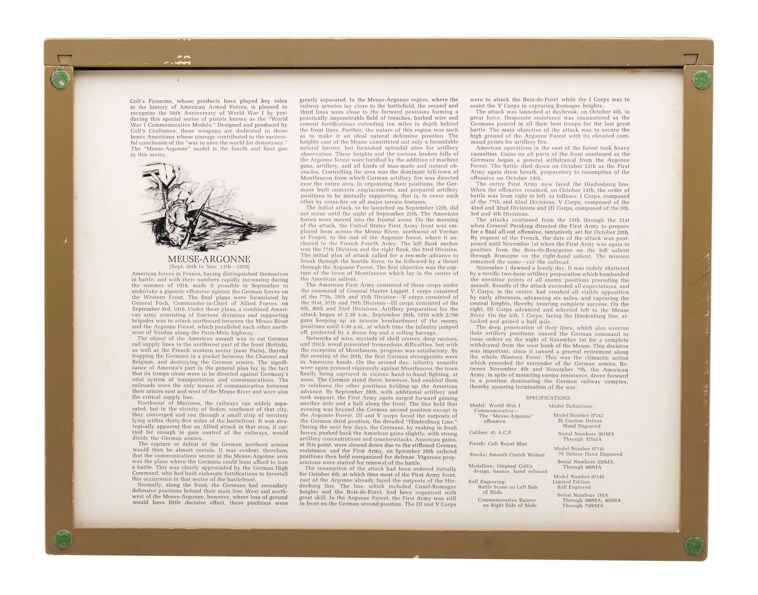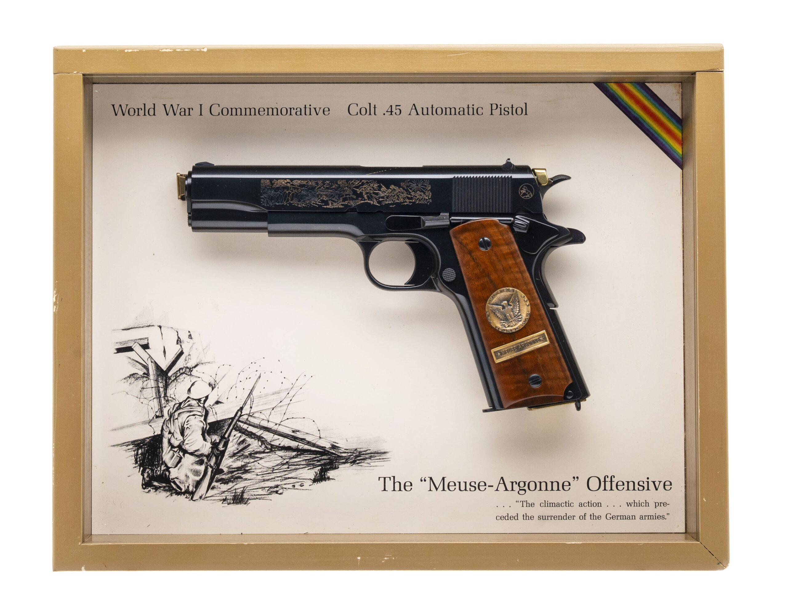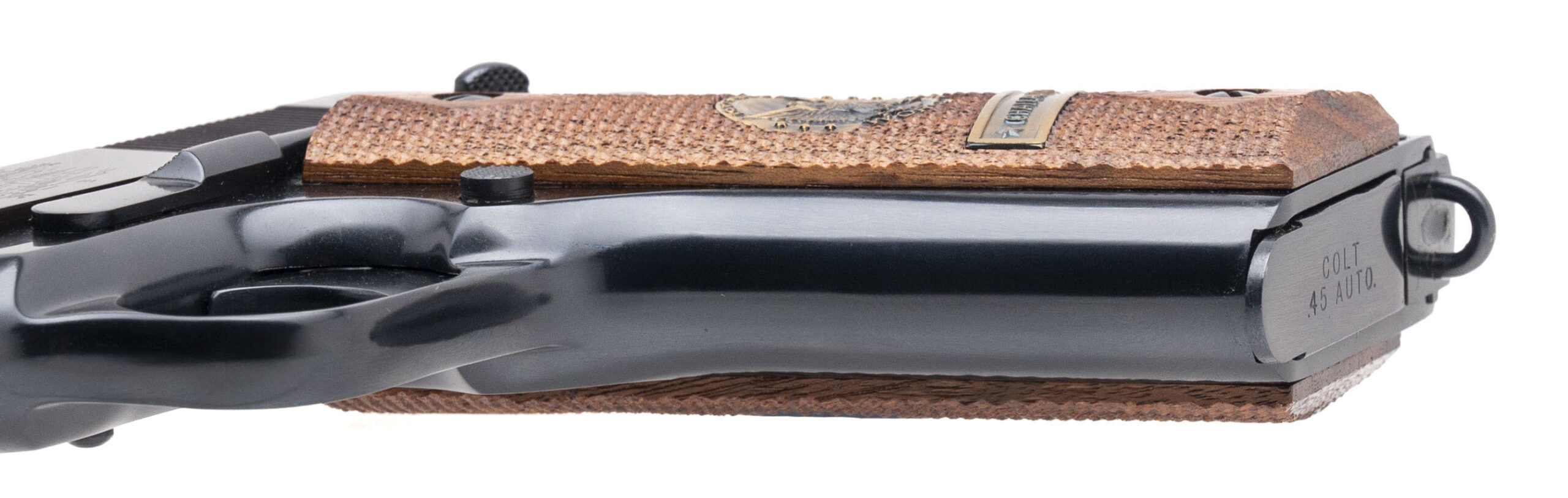 SN: 5181-CT, 5181-BW, 5181-MA, 5181-M2, 5181ETO, 5181PTO. Rare 6 gun commemorative set of 1911 pistols with matching numbers. These guns were produced over a period from 1967 to 1970 and the collector had to sign up to be able to receive the matching number guns as they were produced. Very few complete sets exist, making this a very desirable set for the Colt collector. The guns in the set are: