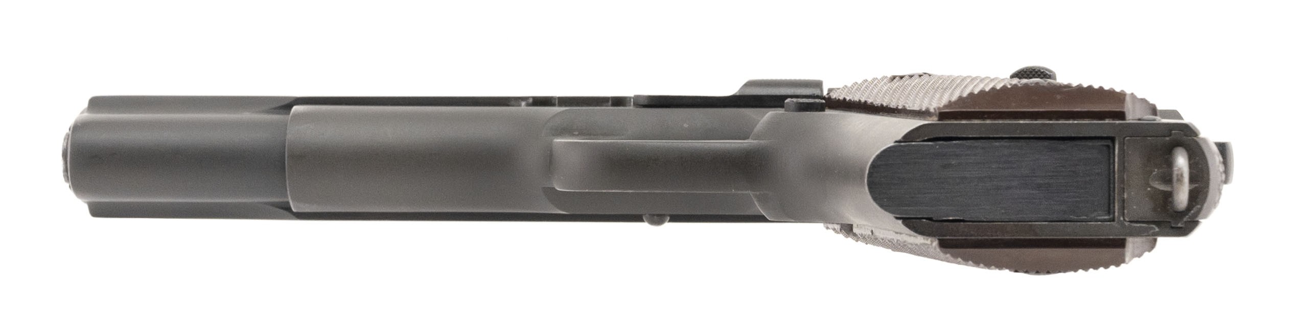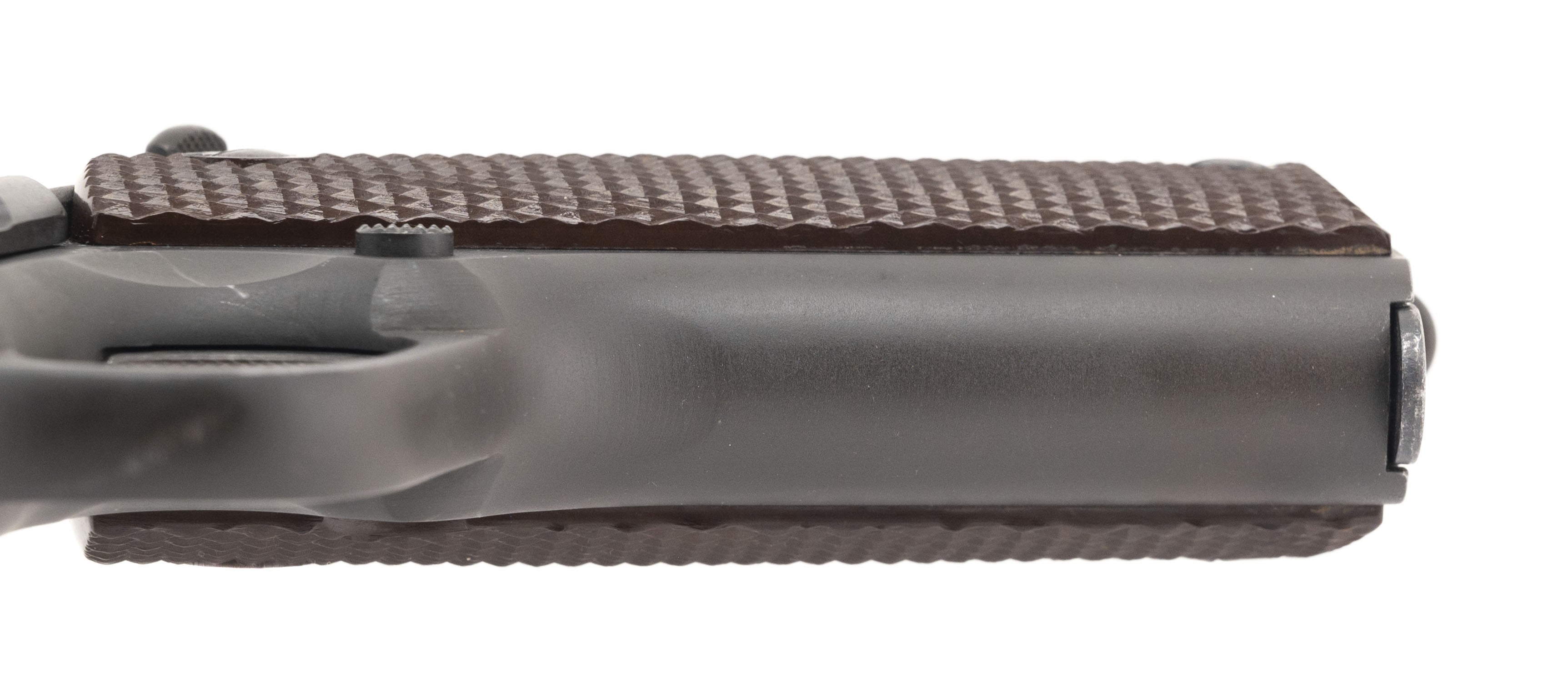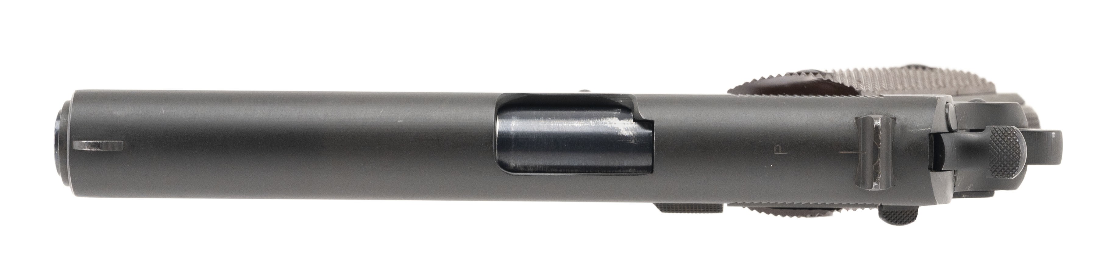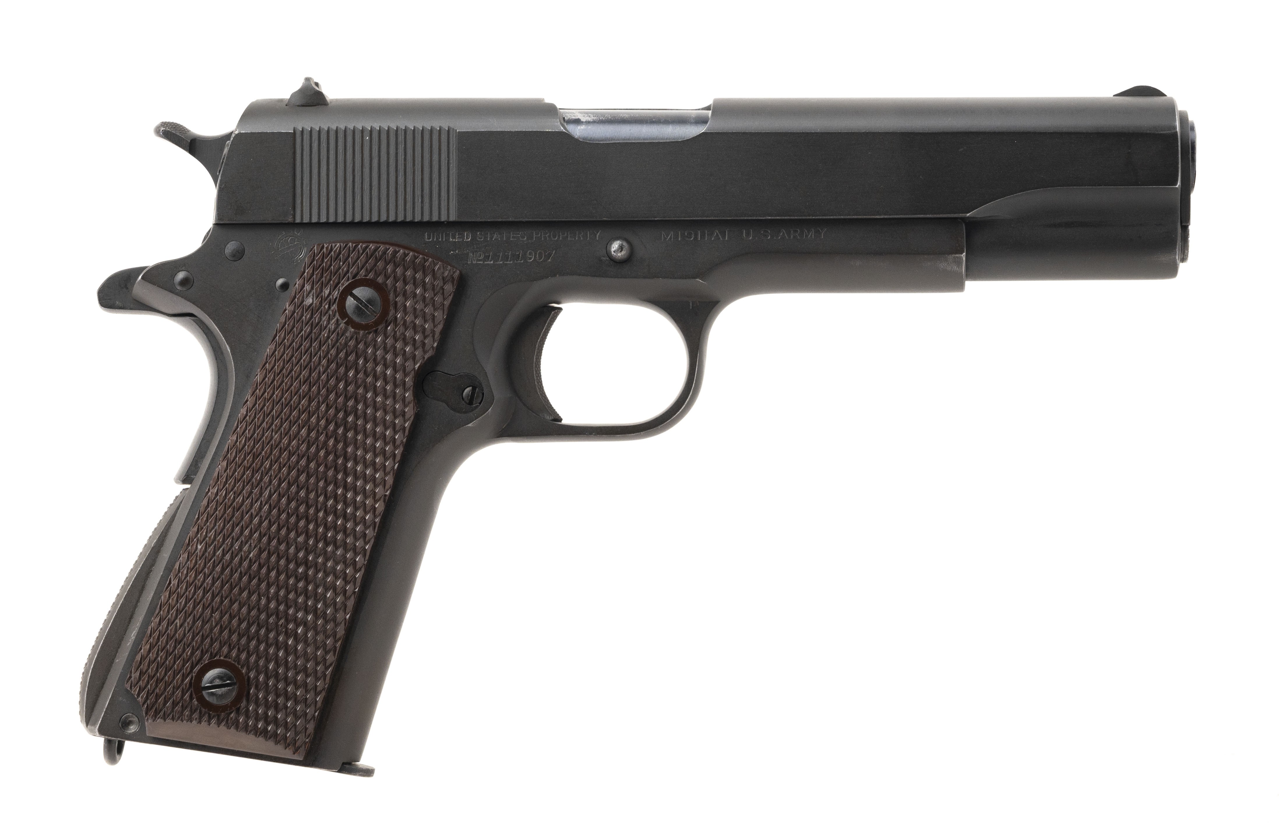 WWII U.S. military pistol made in 1943, serial number 1111907. Has about 96% original parkerized finish with just light edge wear. Has the correct barrel, marked "COLT .45 AUTO", "P" and "F", with excellent bore. A fine example of a WWII Colt .45 auto.