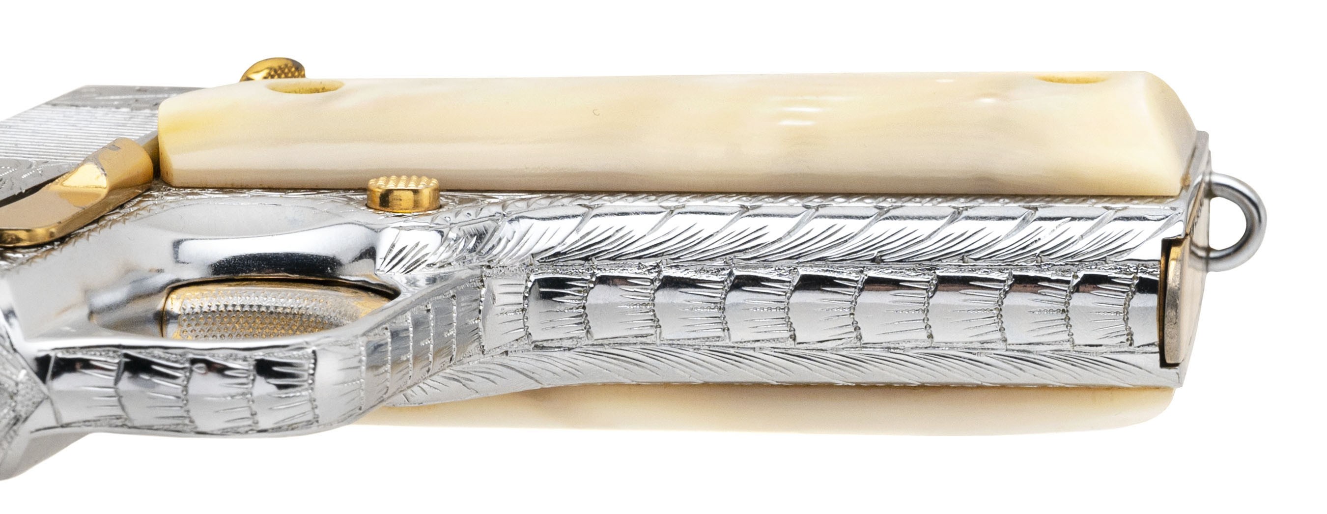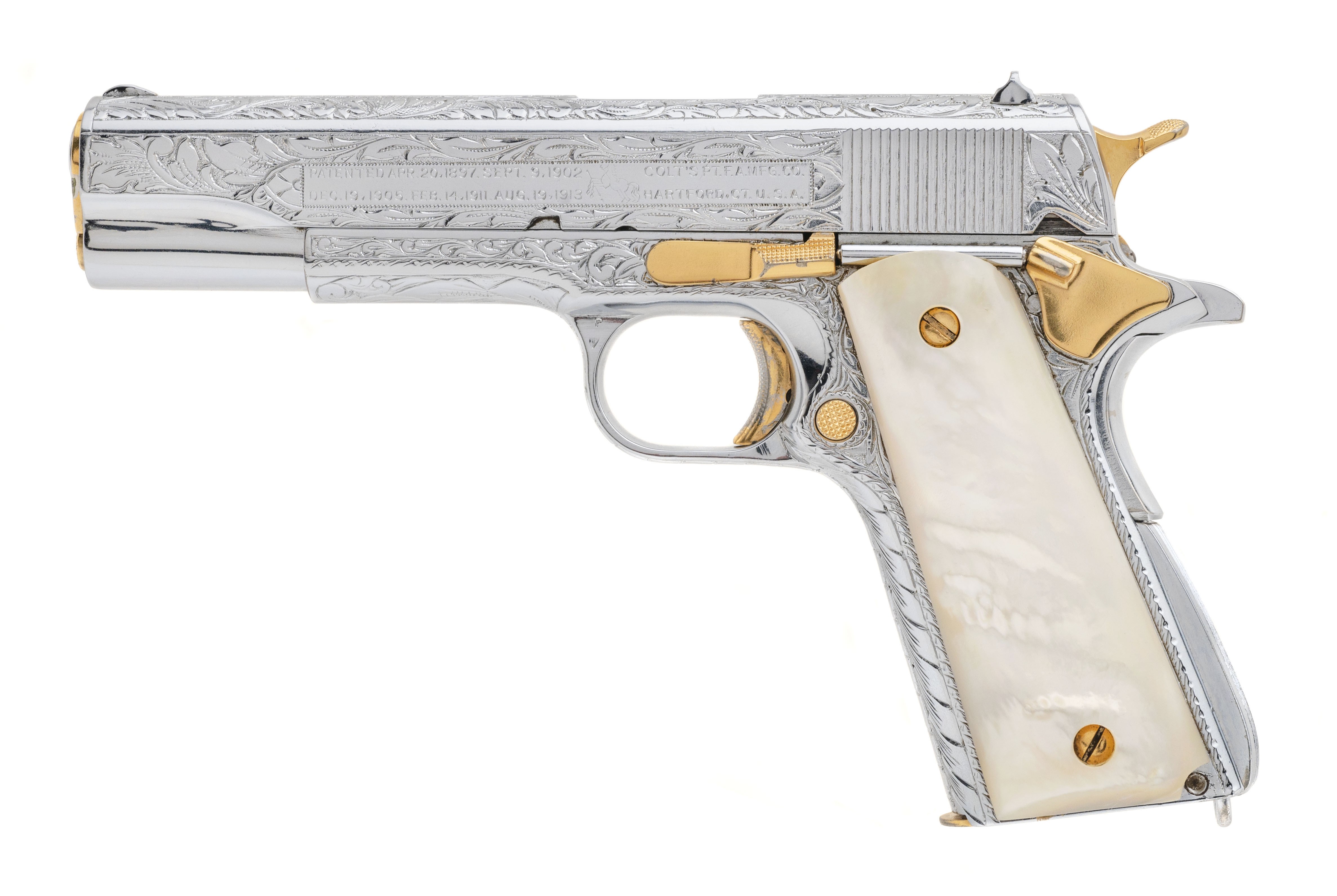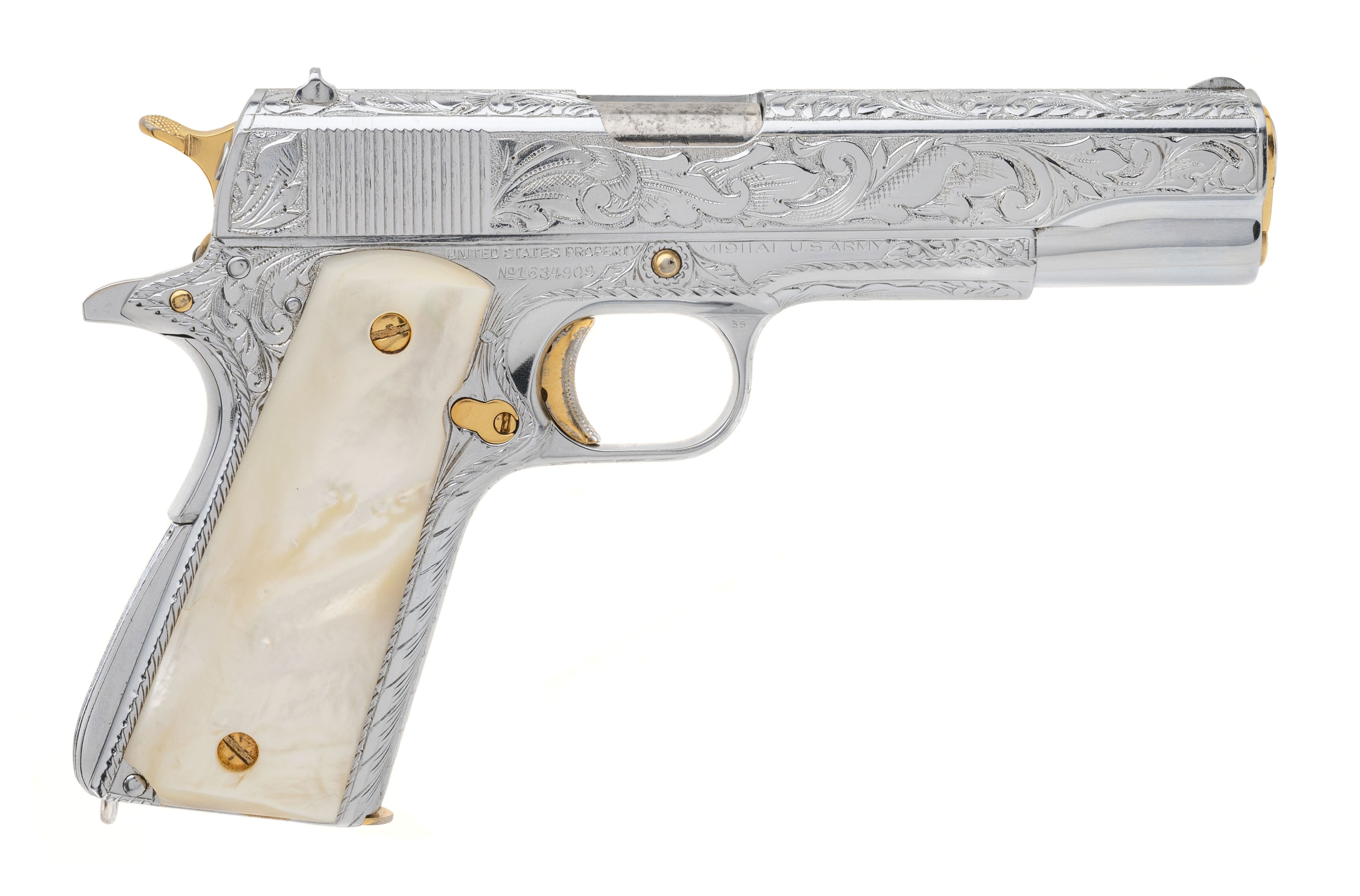 SN: 1634909. Made in 1944, 45 ACP with a 5" barrel. Bore is good. WWII service pistol that's been luxuriously embellished with profuse engraving, chrome finish, gold plated small parts, and genuine pearl grips. A true barbecue gun!
