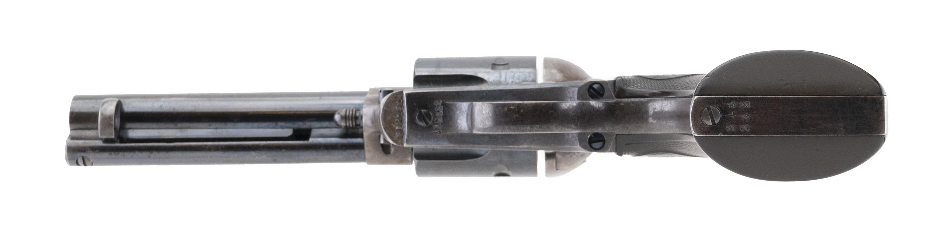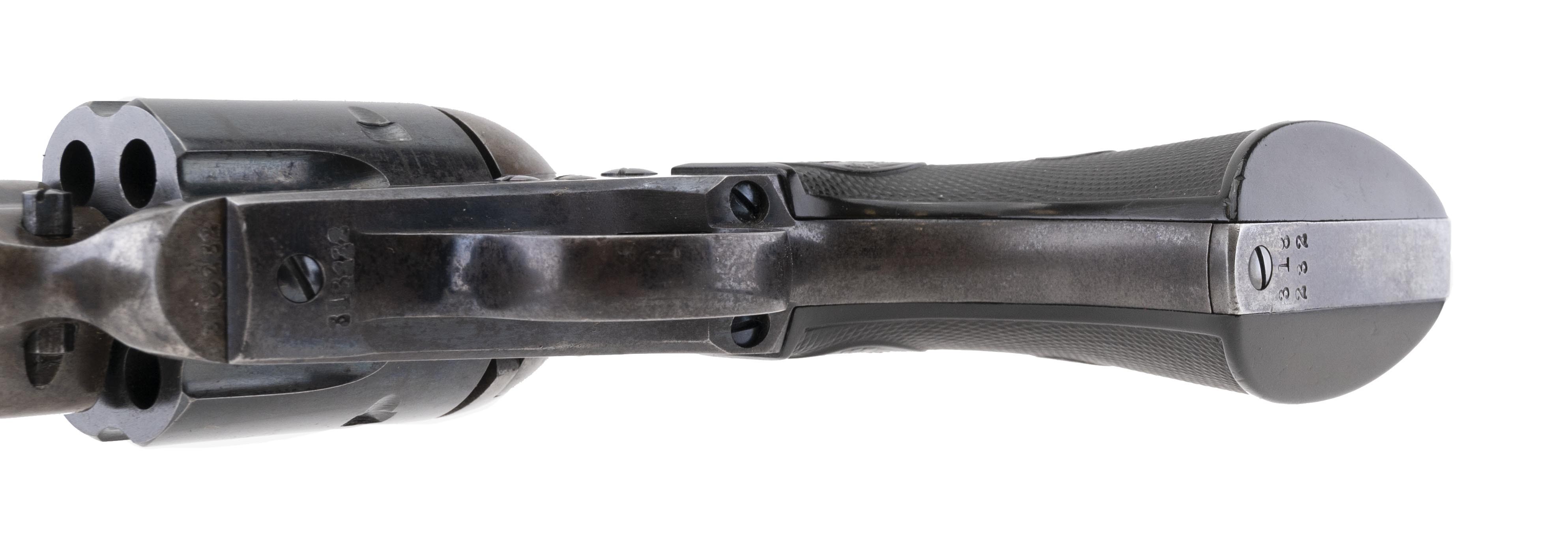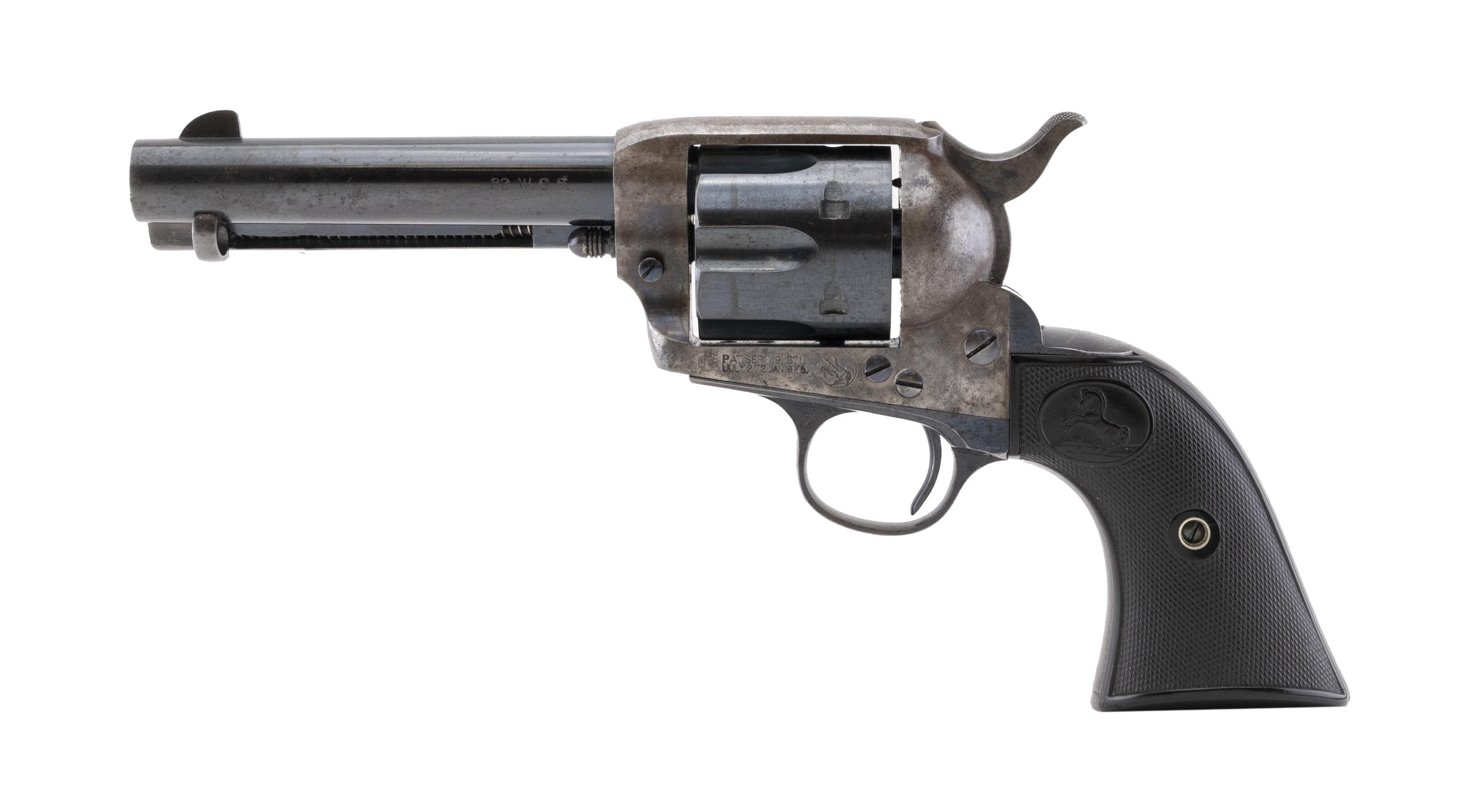 Made in 1911. Bore is very good with strong rifling and some minor frosting, bright and shiny otherwise. Action works perfectly. Metal has approximately 75% original finish with a patina on the frame. Grips are very good, no chips or cracks. Very good overall condition.