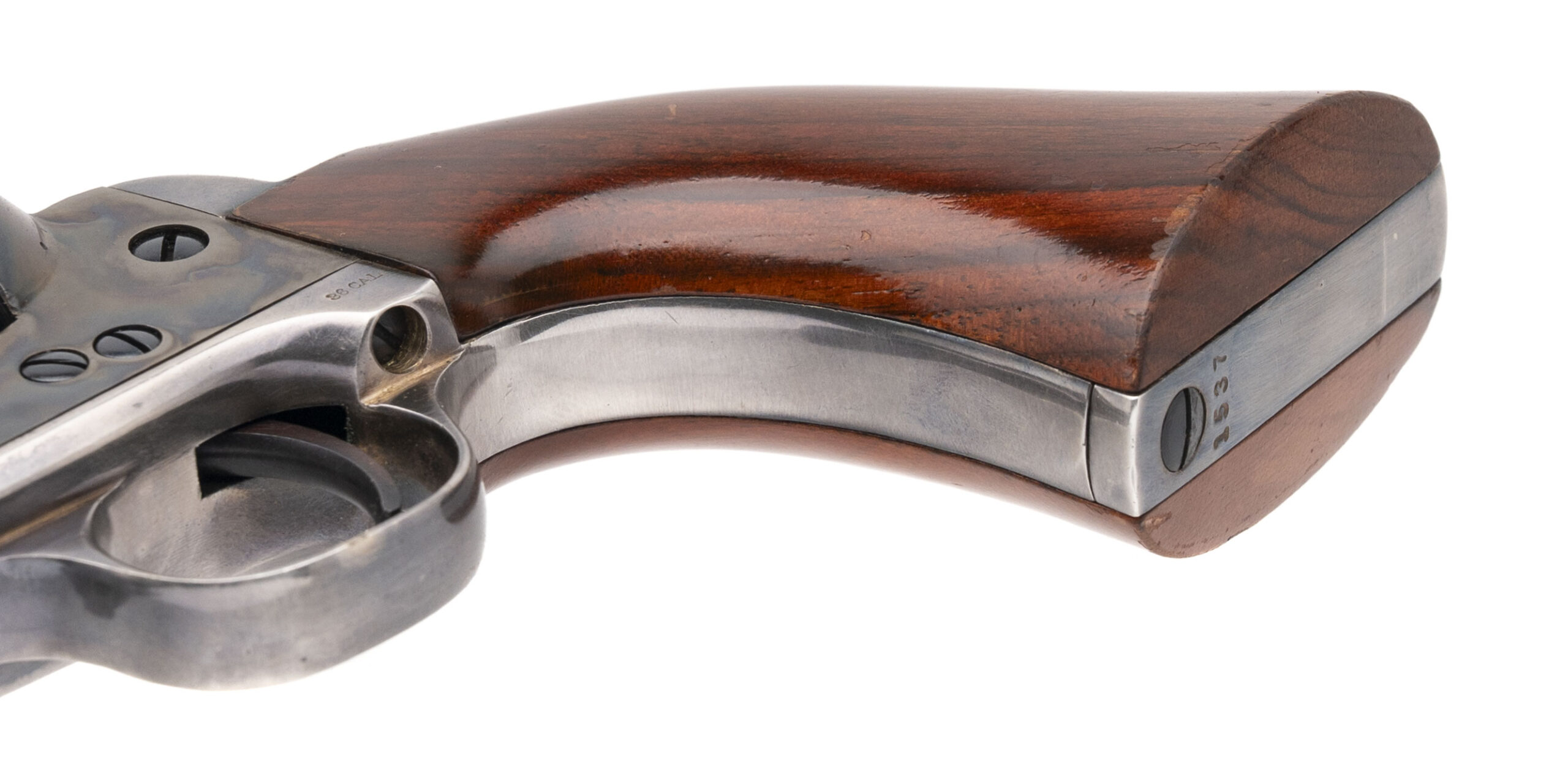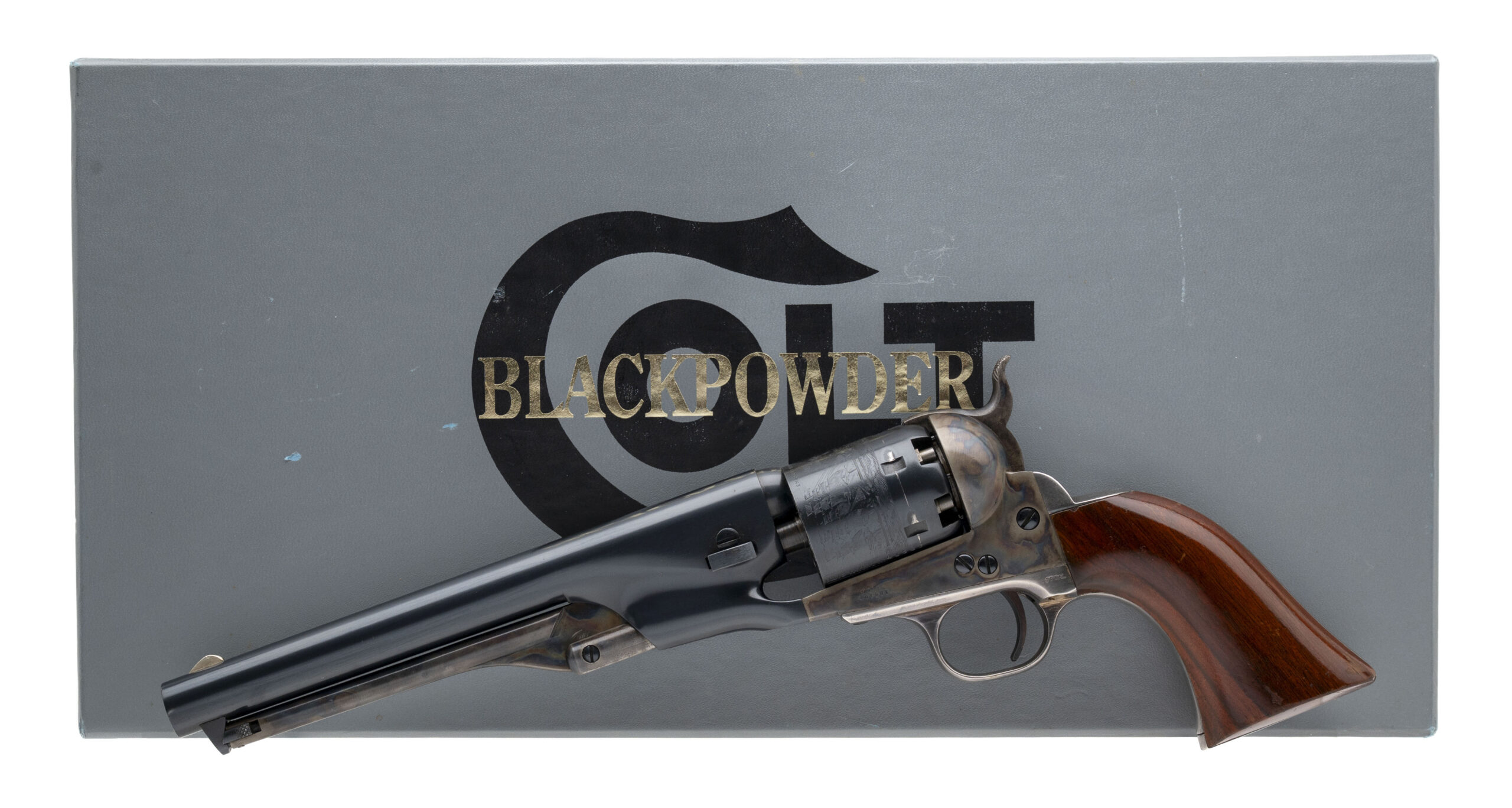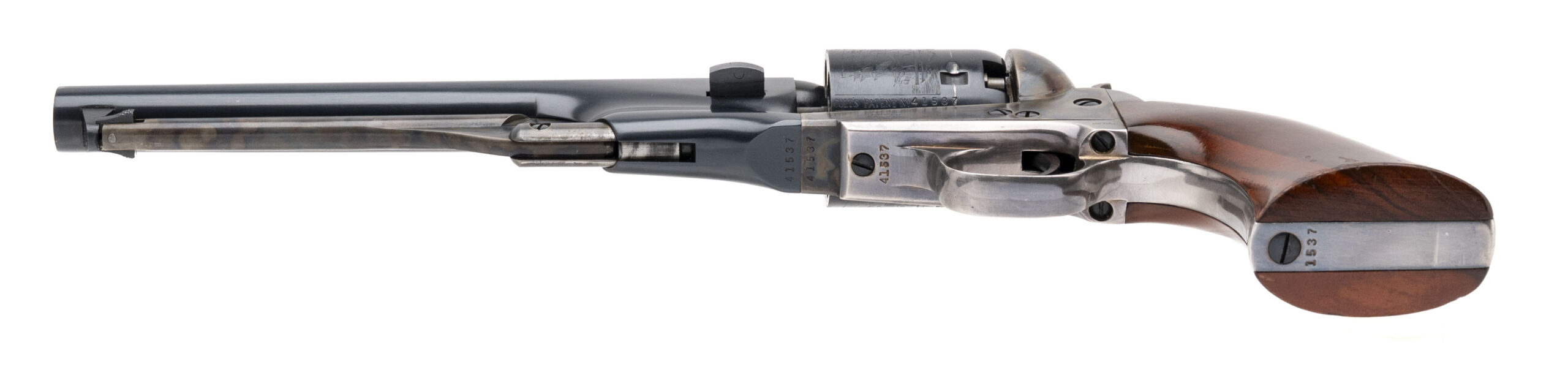 SN: 41537 made circa 1980’s. Modern production of the .36 caliber Colt 1861 Navy with a 7.5” round barrel, 6 shot etched cylinder, blued finish with case hardened frame and loading rod, walnut grips and silver plated trigger guard and back strap. Overall in very good condition with some very light handling marks. Comes in Colt Signature Series box.