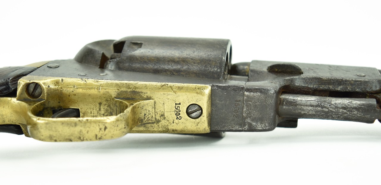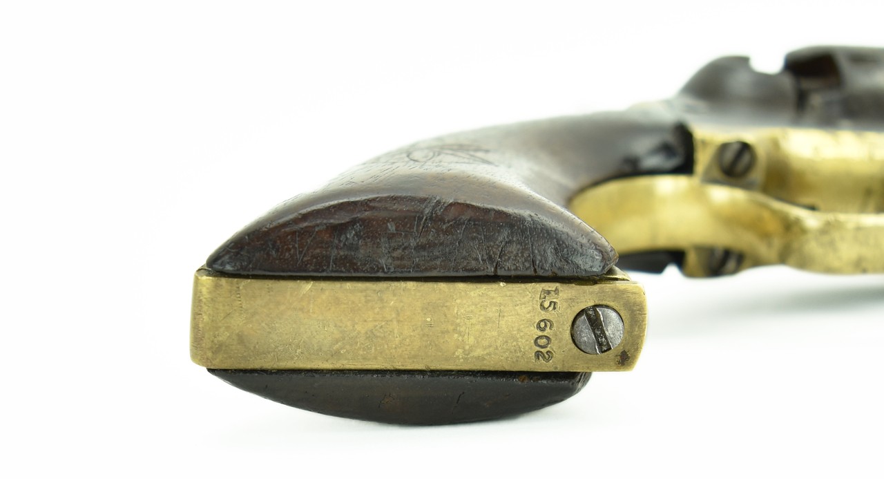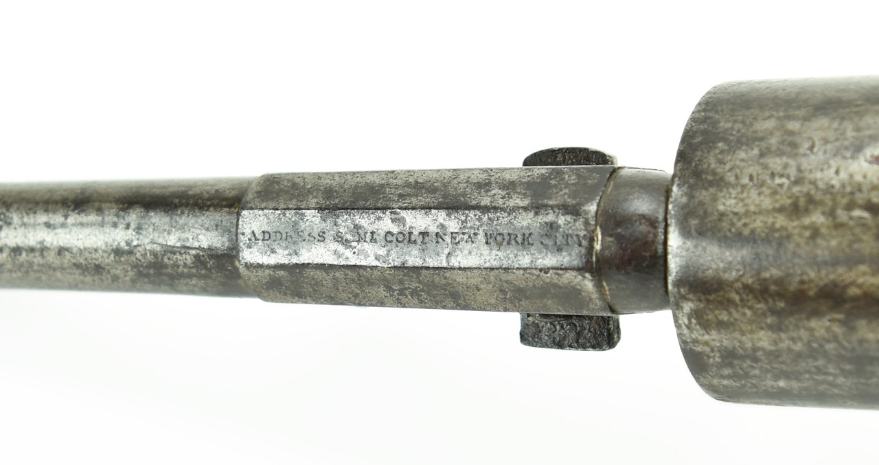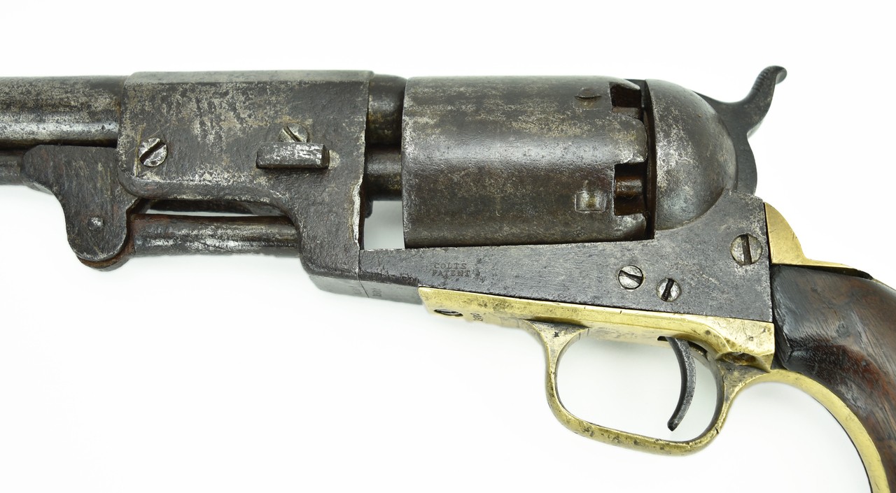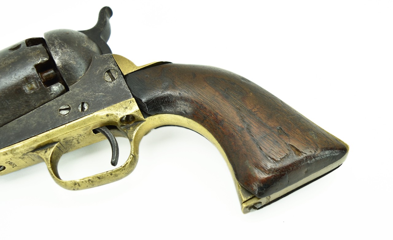 Colt 3rd Model Dragoon. Made in 1856. This gun shows quite a lot of use. Dark grey to brown patina on metal with scattered pitting. Gun is all matching and works properly. Grips are original and have minor chipping. Looks like a gun that was out on the frontier.